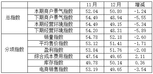 从商户景气指数来看,总指数中,12月商户景气指数为50.80,比11月的52.04下降1.24个百分点;经营环境指数为49.15,比11月的54.49下降5.34个百分点。