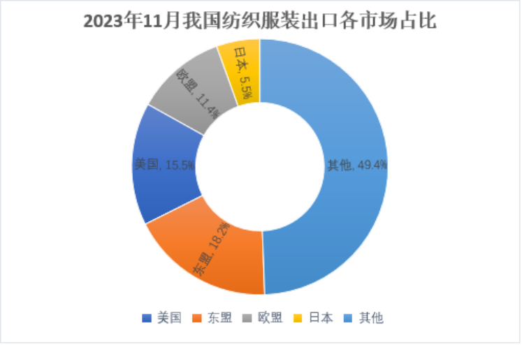11月我国纺织服装出口延续回稳态势,同比下降1.1%,降幅相较前几个月大幅收窄,环比上升3%。对美国出口连续第三个月增长。对东盟纱线面料出口结束连续7个月下降态势,自今年4月以来首次转正,同比上涨3.7%。“一带一路”国家仍是纺织服装出口的主要增长点,本月对中亚五国出口同比上升超30%,对非洲出口也保持上涨。四大类商品纱线、面料、家纺和针梭织服装本月出口数量连续第四个月增长,纱线和面料等中间品价格降幅有所收窄。从1-11月数据看,累计出口额为2685.6亿美元,同比下降8.9%,累计降幅继续收窄。前11个月对越南出口额超过日本,越南成为仅次于美国的第二大单一出口市场。下阶段,纺织服装出口有望延续回稳态势。我国经济持续回升向好,工业生产恢复加快。12月11-12日召开的中央经济工作会议强调扩大高水平对外开放,加快培育外贸新动能,切实打通外籍人员来华经商、旅游堵点,抓好支持高质量共建“一带一路”八项行动的落实落地。有关政策的“走深走实”将继续推动我国纺织服装出口。此外,美国经济复苏好于预期、通胀率走低以及欧美企业库存的持续消化也将为下阶段纺织服装出口带来利好。另一方面,近期国际航运形势对纺织服装出口带来的负面影响值得关注。受巴以冲突外溢影响,马士基等多家航运企业暂停红海和苏伊士运河航线,在短期内造成亚欧航线运力紧张的局面,亚欧航线价格上涨。12月22日,上海港出口至欧洲、地中海基本港市场运价(海运及海运附加费)为1497美元/TEU和2054美元/TEU,较上期分别上涨45.5%和30.9%。同时,巴拿马运河遭受1950年有记录以来最严重干旱枯水期,运河水位及通行能力大大下降。世界两条航运动脉同时“堵塞”,扰乱国际航运,或加剧美国、欧洲等地通货膨胀,亦将对我纺织服装出口带来一定负面影响。2023年1-11月,全国货物贸易进出口总值54066.4亿美元,同比(下同)下降5.6%,其中出口30773.8亿美元,下降5.2%,进口23292.6亿美元,下降6%,累计贸易顺差7481.2亿美元。11月,全国货物贸易进出口总值5154.7亿美元,与去年同期基本持平,其中出口2919.3亿美元,同比增长0.5%,进口2235.4亿美元,下降0.6%,贸易顺差683.9亿美元。1-11月,纺织品服装贸易额2883.3亿美元,同比下降8.4%,其中出口2685.6亿美元,下降8.9%,进口197.7亿美元,下降5.1%,累计贸易顺差2500.3亿美元,下降8.9%。11月,纺织品服装贸易额255.9亿美元,同比下降1.1%,其中出口236.7亿美元,下降1.8%,进口19.3亿美元,增长8.2%,当月贸易顺差217.4亿美元,下降2.6%。对美出口连续三个月增长,对东盟纱线面料出口7个月来首次转正,“一带一路”国家所占出口份额超过56%,再创新高。11月,我出口纺织服装236.7亿美元,其中出口额超过1亿美元的单一市场有43个,比上个月减少4个。在这43个出口市场中,出口额同比上升的有美国、越南、韩国、吉尔吉斯斯坦、哈萨克斯坦、英国、中国香港、阿联酋、柬埔寨、巴西中国台湾、肯尼亚和加纳等13个国家和地区,比上个月减少2个。在四大传统市场中,对美出口同比上升4.5%,连续第三个月保持增长,是四大传统市场中唯一增长的;对东盟出口同比下降5.7%,降幅较上月大幅收窄,其中对越南出口同比上升2.9%,东盟在我出口市场中的占比不断提升,对东盟纱线面料出口止跌回升;对欧盟出口延续两位数跌幅,同比下降13.8%;对日本出口下降14.3%,是四大传统市场中降幅最大的,日本在我出口市场中的比重继续下降。四大市场美国、东盟、欧盟和日本占我出口的份额分别为15.5%、18.2%、11.4%和5.5%,四者合计约占我国出口的50.6%,其他市场所占比重已达49.4%。消费和投资走强推动美国经济复苏。美国商务部12月21日公布的最终修正数据显示,2023年第三季度美国实际国内生产总值(GDP)按年率计算增长4.9%,占美国经济总量约70%的个人消费支出增长3.1%。11月,我国对美出口纺织服装36.7亿美元,同比上升4.5%,连续三个月保持增长。我对美主要出口产品针梭织服装11月出口额22.3亿美元,同比上升0.2%,其中出口量同比增加17.3%。1-11月,我累计对美出口纺织服装436.6亿美元,同比下降12%,累计降幅较上月收窄1.2个百分点,其中主要产品针梭织服装出口270.2亿美元,同比下降12.9%。从美国进口数据看,10月美国自全球进口纺织服装101.7亿美元,下降16.8%,其中自中国进口下降5.1%,自越南进口下降20.7%,自印度和孟加拉进口分别下降5%和36%,自墨西哥和加拿大进口分别下降5.8%和13.3%。(二)对东盟出口降幅大幅收窄,纱线面料出口止跌回升,越南超过日本成为我第二大单一出口市场。