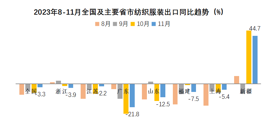 11月我对东盟出口纺织服装43.1亿美元,同比下降5.7%,降幅大幅收窄超10个百分点。其中,对越南和柬埔寨出口同比上升,本月对越南出口上升2.9%,对柬埔寨出口上升24.3%。1-11月,我对越南出口额达159亿美元,超过日本的158.8亿美元,越南成为我第二大单一出口市场。分产品看,11月我对东盟出口纱线面料21.7亿美元,上升3.7%,为今年4月份以后首次实现单月同比增长,东盟国家对纱线面料等中间品的需求持续回升;本月我对东盟出口服装13.1亿美元,同比下降17.5%,降幅较上月收窄。1-11月,我对东盟出口纺织服装451亿美元,同比下降9.8%,是我最大出口市场;其中出口纱线面料225.2亿美元,同比下降12.2%。受外部需求疲软、高利率以及2022年能源危机长期影响等因素的困扰,欧盟经济复苏乏力,欧元区20国经济连续两个季度负增长,领头羊德国经济陷入萎缩风险,预计第四季度将下滑0.2%。欧元区第四季度经济预计将萎缩0.1%。我对欧盟纺织服装出口继续下跌。11月,我对欧盟出口纺织服装26.9亿美元,同比下降13.8%,环比上升5.9%。重点商品针梭织服装本月出口量价齐跌,出口额16.5亿美元,下降17.1%,出口量下降9.1%。1-11月,我对欧盟出口纺织品服装349亿美元,同比下降19.2%;其中出口针梭织服装212.7亿美元,下降21.9%。从欧盟进口数据看,10月欧盟进口纺织服装99.9亿美元,同比大跌19.6%。前三大进口来源地分别为中国、孟加拉国和土耳其,进口额分别为32.1、13.5和12.8亿美元,同比分别下降21.1%、31.5%和13.3%,三者占比分别为32.1%、13.5%和12.8%。日本是本月我国纺织服装出口下降最多的市场。日本经济疲软。日本内阁府12月8日发布的报告显示,今年三季度日本实际国内生产总值(GDP)年化季率修正值为-2.9%,而预期为-2.0%,前值为-2.1%。下降速度快于预期,也快于上个季度。11月,我对日出口纺织服装12.9亿美元,同比下降14.3%,环比下降7.9%,是四大市场中唯一同比、环比双下降的。大类商品针梭织服装对日出口8亿美元,下降12.5%,其中出口量下降7.4%,出口均价下降5.5%。1-11月,我对日出口纺织品和服装158.8亿美元,同比下降14.3%;其中,出口针梭织服装103.6亿美元,同比下降13.6%。从日本进口数据看,10月日本进口纺织服装30亿美元,同比下降13.8%。中国、越南和缅甸为其前三大进口来源地。根据日本财务省数据,10月,日本自中国、越南和缅甸纺织服装进口额分别为15.6、4.9和1.5亿美元,自中国进口同比下降22.1%,自越南进口下降0.6%,自缅甸进口下降1.8%,三者占比分别为52%、16%和5%。11月,我对美国、东盟、欧盟和日本以外的市场出口117.1亿美元,占我出口的比重已达49.4%。对152个“一带一路”共建国家出口额为132.9亿美元,占比56.1%,比上个月提高约2个百分点。其中,本月我对吉尔吉斯斯坦、哈萨克斯坦、塔吉克斯坦、乌兹别克斯坦和土库曼斯坦等中亚五国出口14.5亿美元,同比上升33.4%,依旧是出口涨幅最大的地区。对俄罗斯出口5.7亿美元,同比下降5.6%。对非洲出口19.3亿美元,同比上升4.4%。对拉丁美洲出口15.2亿美元,同比下降2.8%。对澳大利亚出口5.2亿美元,同比下降9.3%。对印度出口4.4亿美元,同比下降13.6%。对阿联酋出口3.9亿美元,同比上升5.9%。11月,纺织品服装市场总体保持回暖趋势,四大类商品纱线、面料、家用纺织品和针梭织服装出口量连续第四个月保持增长,涨幅分别为3.3%、8.8%、14.3%和22.3%。但出口价格在同比基数较大,以及出口竞争压力下继续下降,本月四大类商品出口单价延续跌势,跌幅分别为7.1%、7.7%、14.7%和16.5%,纱线和面料等中间品的价格降幅收窄,针梭织服装和家用纺织品等制成品价格降幅扩大。从金额看,面料和家纺出口额上升,分别上涨0.4%和2.1%;纱线和针梭织服装出口额则分别下降4%和2.5%。从1-11月数据看,纺织品累计出口额1237.5亿美元,同比下降9.1%;服装出口额1460.3亿美元,同比下降8.3%。四大类商品中,纱线和面料出口额分别下降8.5%和9.3%;家用纺织品和针梭织服装出口额分别下降1%和8.5%。出口数量方面,纱线和家用纺织品分别上涨11.9%和6.7%,面料和针梭织服装则分别下降0.4%和1.6%。出口价格方面,四大类商品全部下降,其中纱线跌幅最大,为18.2%,面料、家纺和针梭织服装则分别下降8.9%、7.2%和7%。11月主要省市出口企稳,新疆连续两月增长超40%。11月,海外市场需求回暖,我国主要省市出口企稳,部分省市出口降幅较上月继续收窄。排名前七的省市中,除浙江、福建出口同比下降3.9%和7.5%,降幅较上月小幅扩大,其余省市出口较上月均有所好转。其中,江苏、广东、山东、上海同比降幅分别收窄至2.2%、21.8%、12.5%和5.4%,新疆同比增长44.7%,连续两月增幅超过40%。1-11月,全国31个省(市、区,不含港、澳、台)中有10个省保持增长,其中新疆(32%)、广西(34%)、四川(40%)、陕西(20%)、黑龙江(42%增幅较大。排名前六的重点地区中浙江、江苏、广东、山东、福建和上海分别下降5.3%、15.3%、15.8%、10.4%、17.8%和13.3%,降幅较上月均略有缩小。11月纺织服装进口额连续五个月增长,纺织品进口增长19.8%。11月,纺织服装进口连续第五个月增长,同比增长8.2%,主要由纺织品增长拉动。11月,进口纺织品10.4亿美元,同比增长19.8%。其中纱线进口额5.3亿美元,同比增长56.5%,进口量增长71%,棉纱线受国内外棉价倒挂、补库需求带动,进口快速恢复,成为拉动整体增长的主要因素。面料进口额增长1.5%,制成品进口额下降8.5%。受服装进口单价回落影响,11月服装进口额8.8亿美元