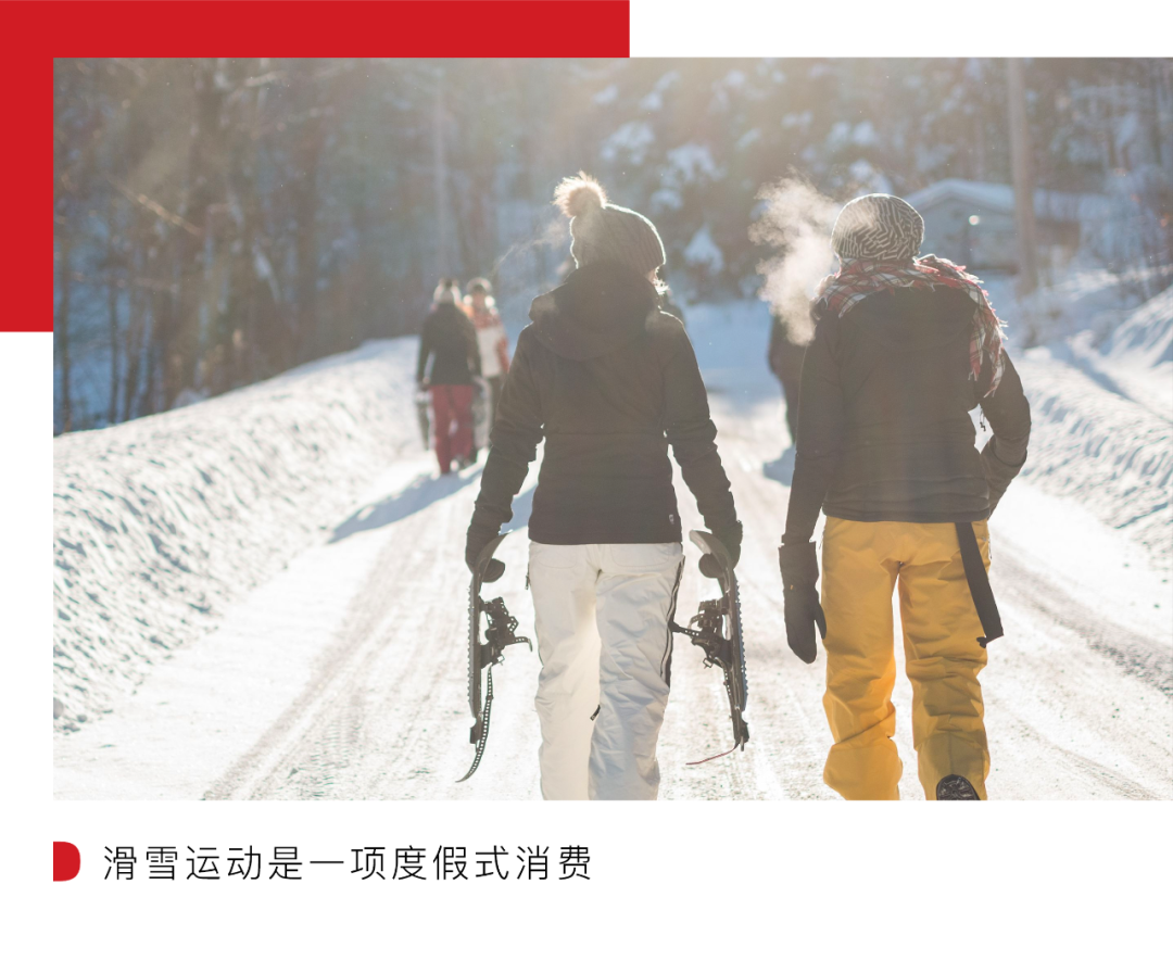 在这种非竞争性概念下,滑雪成为“生活家”的共同话题。数据显示,中国参与滑雪运动的人群主要集中在 30 岁、一二线城市的中高收入群体,年轻、高知、白领成为雪圈群体关键词。环境历史学家 William Cronon 认为,“很大程度上,享受原始天然景观的定价取决于目标人群”。而这类人群对物质背后的心灵强度的重视,也挖掘出了这一生活方式下更大的消费空间。