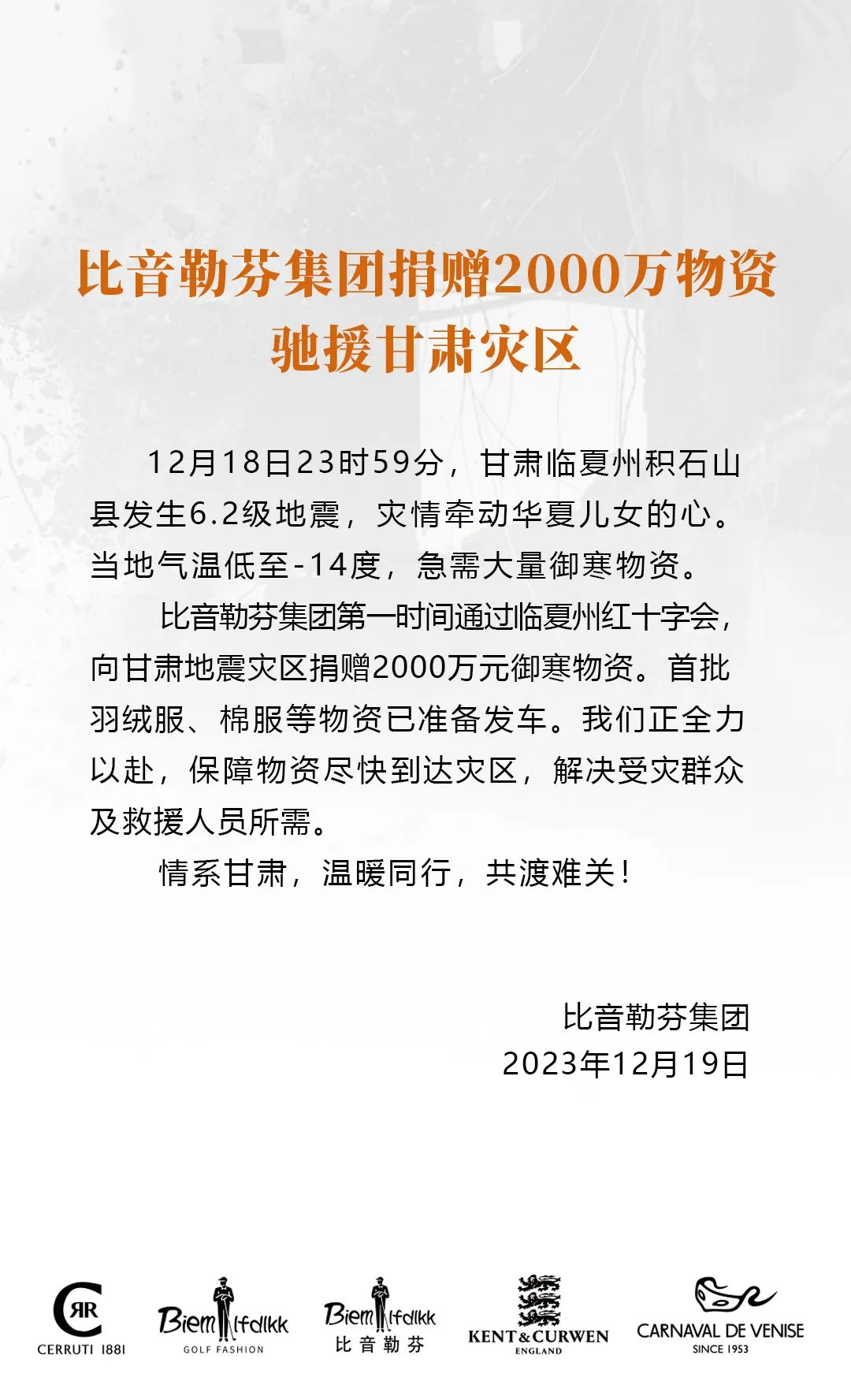 时值寒冬,灾情紧急,匹克体育决定向甘肃受灾地区捐赠1000万元防寒物资。以实际行动帮助灾区人民抵御严寒,抗击灾情,完善灾后重建。众志成城,攻克难关,甘肃加油!