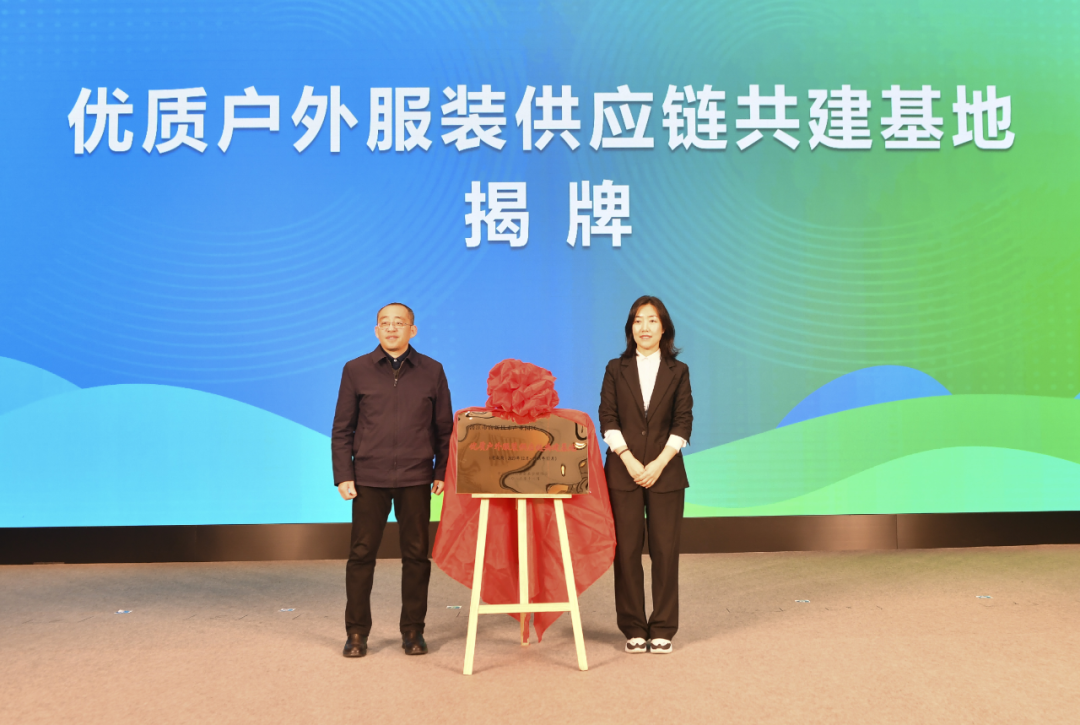 图:中国纺织工业企业管理协会副秘书长郭也可(右)、潜江市高新技术产业园张金园区何波共同为“优质户外服装供应链共建基地”揭牌