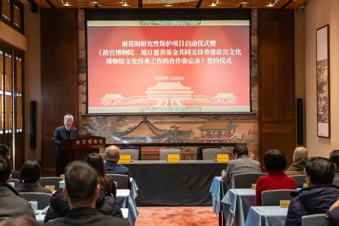 在致辞中,杨勋娓娓讲述了旭日集团资助故宫博物院雨花阁研究性保护项目的缘起,并阐明与故宫博物院共同支持香港故宫文化博物馆的初衷。他表示,自1974年创立以来,旭日集团在取得经济效益的同时,不忘回馈社会,以实际行动践行企业社会责任。“我们十分感恩,旭日集团能够参与其中,在新时代积极担负起新的文化使命,坚定文化自信,坚持守正创新,为推动文化强国和精神文明建设,促进人类文明交流互鉴,奉献绵薄之力。”作为港资企业,旭日集团立足香港,紧跟国家发展步伐,乘着改革开放之风驰骋扬帆至今已有49年。几十年来,旭日集团不忘饮水思源,常怀感恩家国之心,用实际行动践行初心使命。此次参与支持香港故宫文化博物馆文化传承工作项目,其意义非凡。从“中国与巴基斯坦犍陀罗艺术展”“故宫与西藏文物联展”,到设立“北京大学旭日文化艺术基金”,再到支持香港故宫馆文化传承项目,今年可以说是旭日集团的“文化传承之年”。这些善举的背后,与旭日集团的企业文化密不可分。长期以来,旭日集团深受中华优秀传统文化的熏陶,以孟子的“穷则独善其身,达则兼善天下”的理念修身治企,积极响应国家、社会的需要,坚持公益善行。旭日集团将大量资源投放于文化教育领域,包括兴建希望小学,助建校园配套设施,设立大学生、教师奖助学金项目,设立未成年人思想道德建设“旭日奖”,支持香港年轻人来内地访问、实习,推动粤港澳大湾区文化、人才的紧密交流等。推动文化繁荣、建设文化强国、建设中华民族现代文明,是新时代新的文化使命,也成为旭日集团回馈社会的责任与担当。文化是中华民族的灵魂,是国家发展的精神命脉。香港具有背靠祖国、联通世界的独特优势,既是中外文化的交汇中心,也是中华文化传播与创新的窗口。截至目前,香港故宫文化博物馆已接待近180万人次游客,一跃成为香港文化新地标。杨氏兄弟深知赓续中华文脉的重要性,更期盼中华文化能稳步“走出去”。相信在“合作备忘录”的推动下,将进一步促进内地与香港之间的文化交流,增强青年文化自信,助力香港做好连接祖国内地与世界各地文化艺术交流的桥梁,全方位打造中外文化艺术交流中心,推动中华文化更好地走向世界。