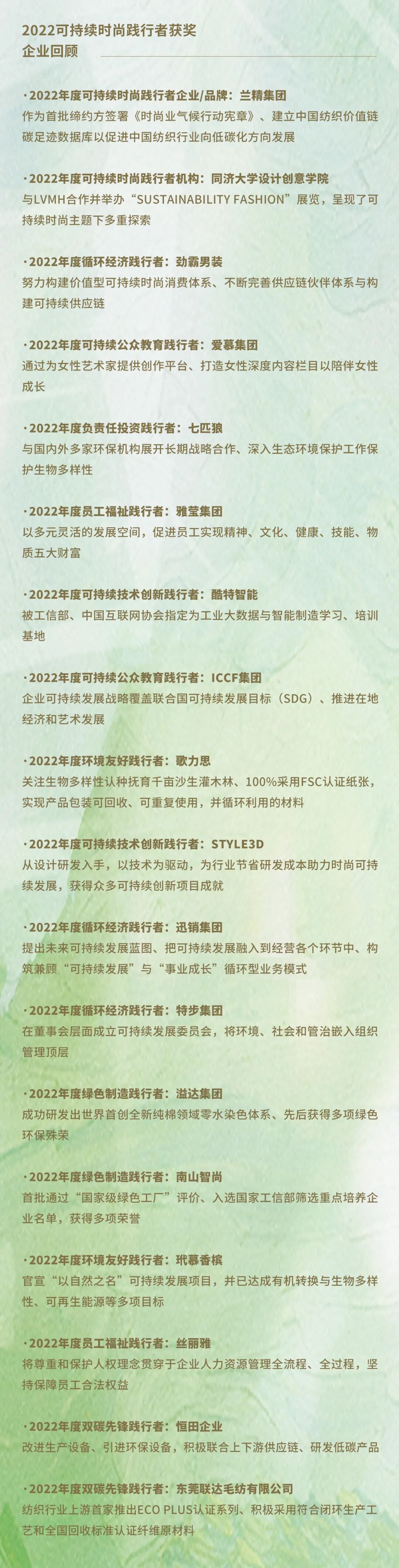 在此基础之上,“可持续践行者 Pursuer of Excellence in Sustainability”2023年度评选再度启幕,通过展现以实际行动将“绿意”带入中国纺织服装行业之中的先锋时尚力量,探索可持续生产与消费的模式和路径,推动全球时尚产业绿色变革。