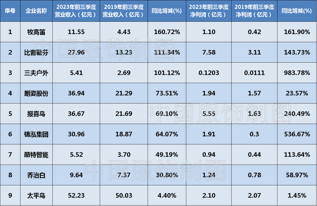具体来看,今年前三季度共有16家企业营收超过2019年同期水平,其中营收超双位数增长的企业有10家,依次为:牧高笛营收从4.43亿元增至11.55亿元,较2019年同期增长160.72%;比音勒芬营收从13.23亿元增至27.96亿元,较2019年同期增长111.34%;三夫户外营收从2.69亿元增至5.41亿元,较2019年同期增长101.12%;朗姿股份营收从21.29亿元增至36.94亿元,较2019年同期增长73.51%;报喜鸟营收从21.69亿元增至36.67亿元,较2019年同期增长69.10%;锦泓集团营收从18.87亿元增至30.96亿元,较2019年同期增长64.07%;酷特智能营收从3.70亿元增至5.52亿元,较2019年同期增长49.19%;乔治白营收从7.37亿元增至9.64亿元,较2019年同期增长30.80%;雅戈尔时尚业务营收从42.35亿元增至51.02亿元,较2019年同期增长20.47%;联发股份营收从28.75亿元增至33.20亿元,较2019年同期增长15.48%。今年前三季度亦有16家企业净利润超过2019年同期水平,其中净利润超双位数增长的企业有11家,依次是:三夫户外净利润从0.0111亿元增至0.1203亿元,较2019年同期增长983.78%;锦泓集团净利润从0.3亿元增至1.91亿元,较2019年同期增长536.67%;报喜鸟净利润从1.63亿元增至5.55亿元,较2019年同期增长240.49%;红豆股份净利润从1.44亿元增至4.60亿元,较2019年同期增长219.44%;牧高笛净利润从0.42亿元增至1.10亿元,较2019年同期增长161.90%;际华集团净利润从0.44亿元增至1.09亿元,较2019年同期增长147.73%;比音勒芬净利润从3.11亿元增至7.58亿元,较2019年同期增长143.73%;酷特智能净利润从0.44亿元增至0.94亿元,较2019年同期增长113.64%;上海三毛净利润从0.12亿元增至0.20亿元,较2019年同期增长66.67%;乔治白净利润从0.78亿元增至1.24亿元,较2019年同期增长58.97%;朗姿股份净利润从1.57亿元增至1.94亿元,较2019年同期增长23.57%。此外,日播时尚和美邦服饰净利润较2019年同期由亏转盈,步森股份净利润亏损幅度较2019年同期有所收窄。在市场分析看来,尽管今年以来国内市场的消费信心恢复较为缓慢,但品牌服装企业的消费需求仍有恢复上升空间,一方面,消费对产品质量、性价比、服务等多方面的关注,将为拉动消费带来一定的增量空间,另一方面,企业库存的持续优化及多元化渠道布局,将带来更多的市场机会,预计后续品牌服装企业将持续复苏。