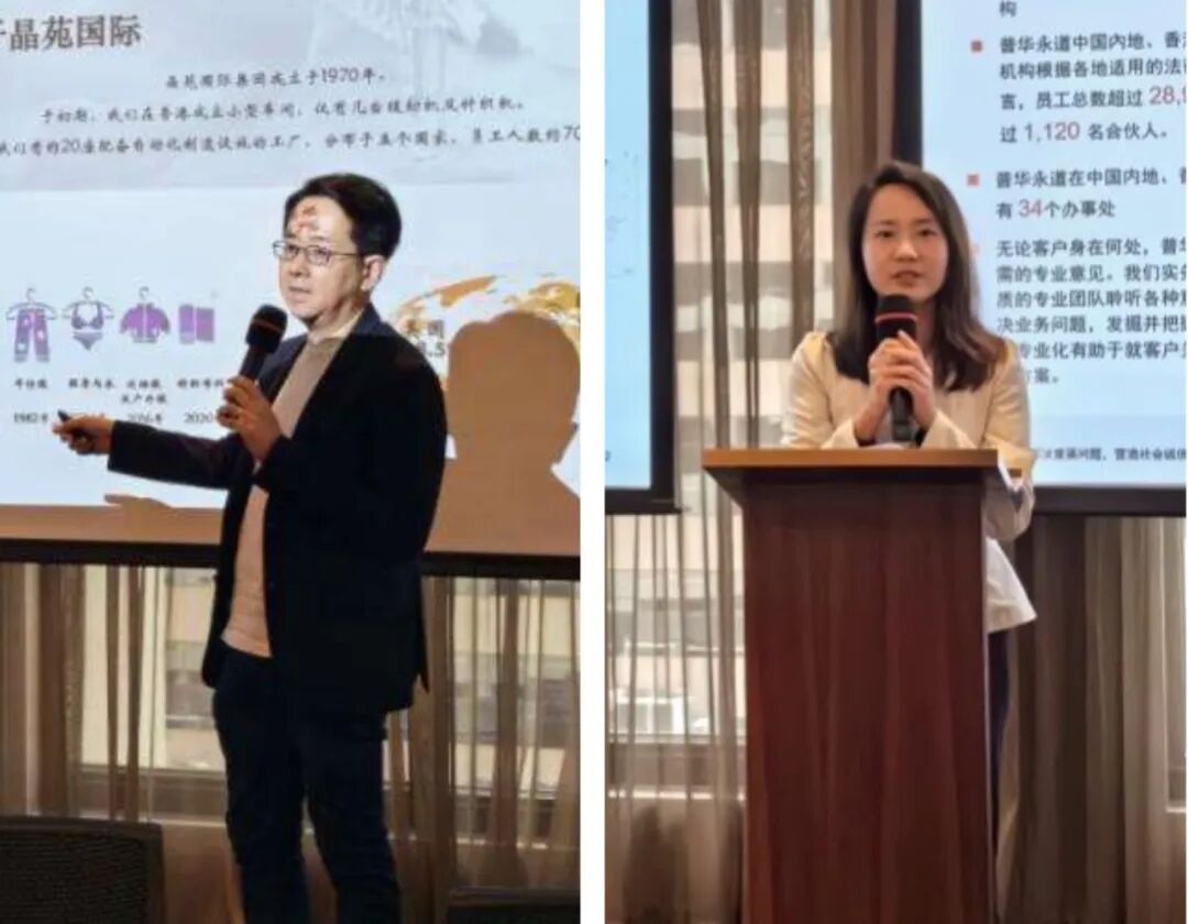 香港企业代表晶苑国际首席财务总监李伟军先生从晶苑国际的发展历程发散作了纺织服装国际供应链案例的分享,普华永道税务合伙人王奕琳女士则介绍了香港的税率制度,并以企业利得税、个人薪俸税、离岸免税、资本利润税等为例说明。