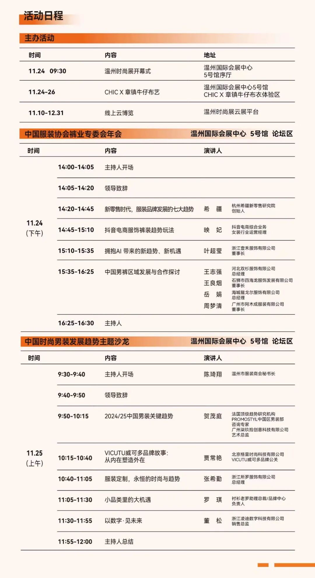 倒计时4天!CHIC温州时尚展11月24-26日即将在温州国际会展中心举办!为让到场观众在短短三天一览温州时尚产业盛况、感受温州独特的时尚魅力,在本届CHIC温州时尚展期间,还将同期举办“2023年中国服装协会裤业专委会年会暨温州服装产业发展论坛”“中国时尚男装发展趋势主题沙龙”等行业活动。