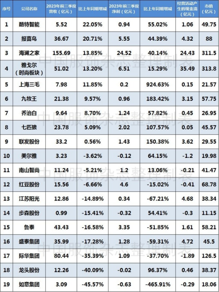 从盈利方面来看,九牧王、七匹狼、上海三毛和联发股份4家企业今年前三季度净利则均实现同比翻倍增长。