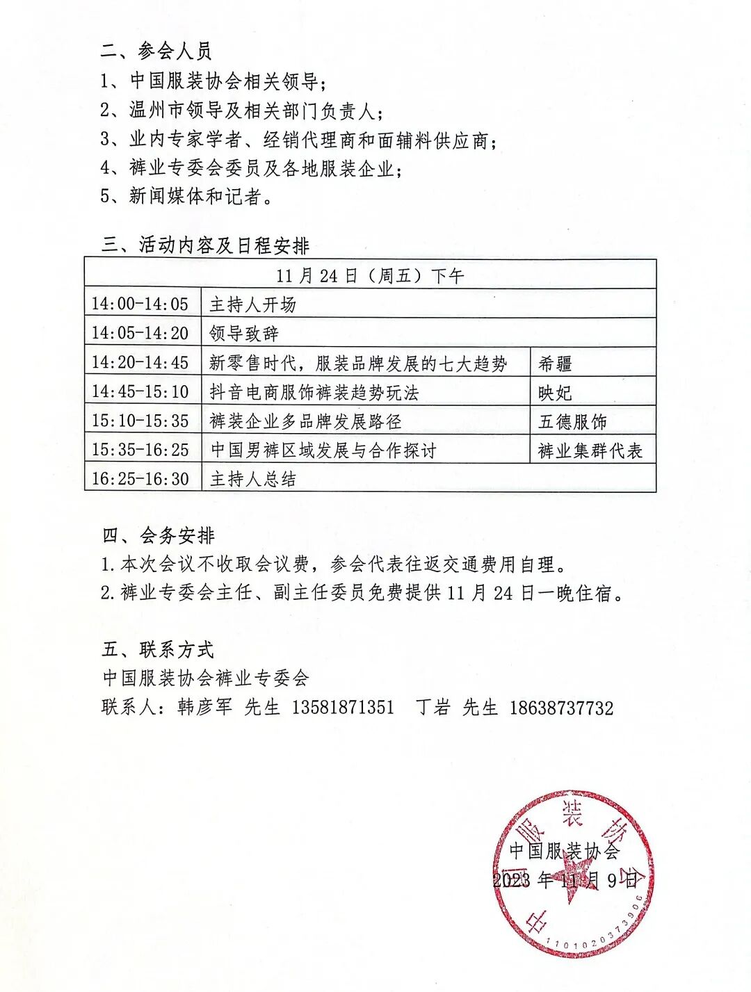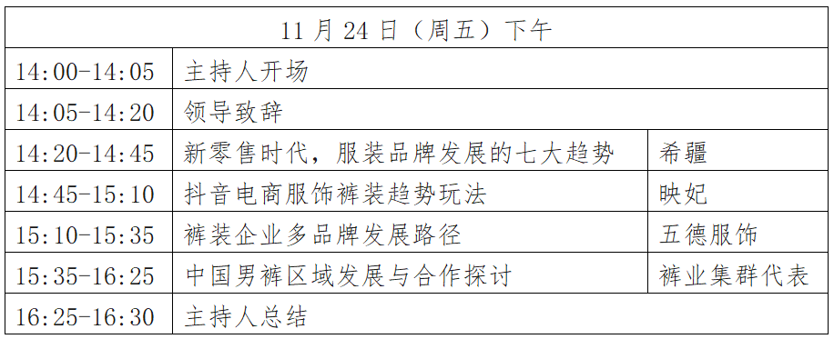 2.裤业专委会主任、副主任委员免费提供11月24日一晚住宿。