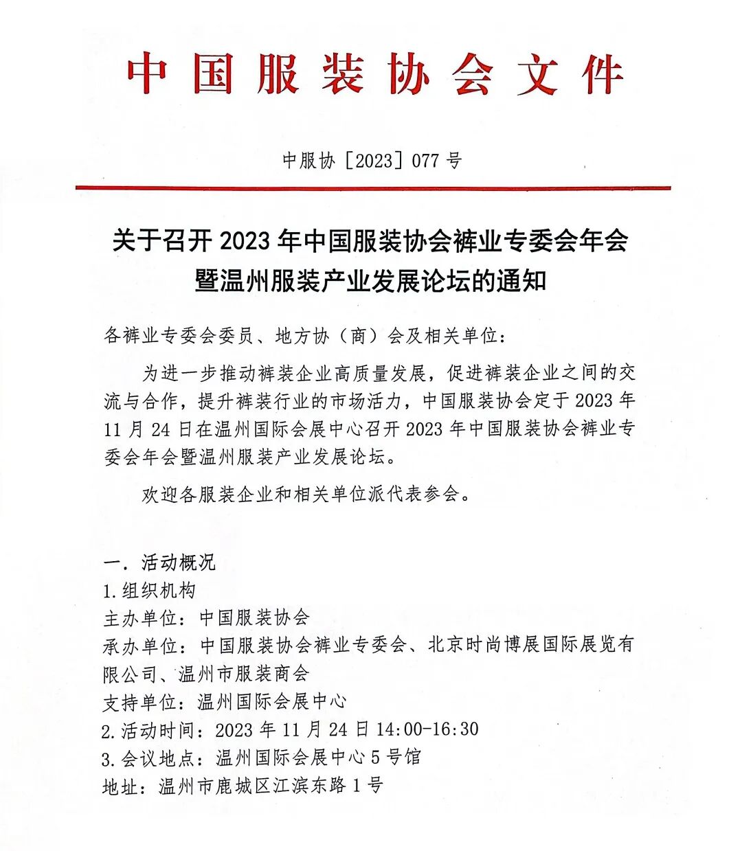 关于召开2023年中国服装协会裤业专委会年会暨温州服装产业发展论坛的通知