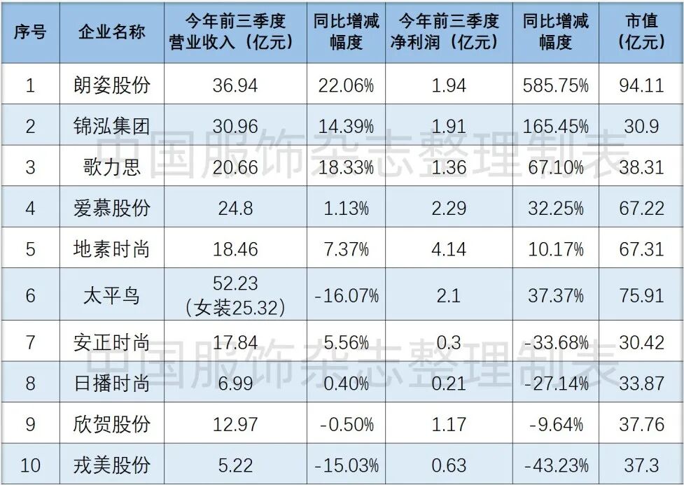 在盈利方面,朗姿股份今年前三季度净利大增逾五倍,其后是锦泓集团今年前三季度净利增长实现翻倍,歌力思、爱慕股份、地素时尚,以及太平鸟均实现净利双位数增长。