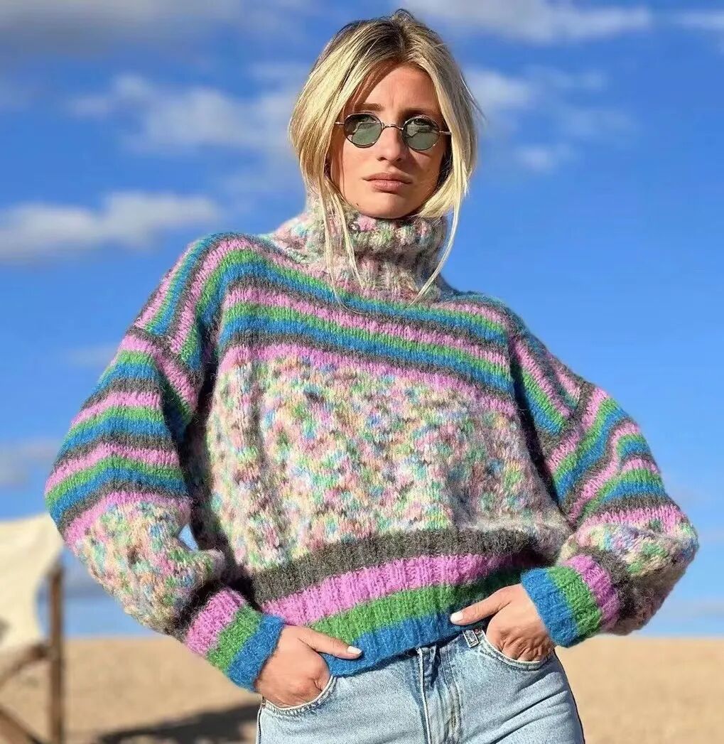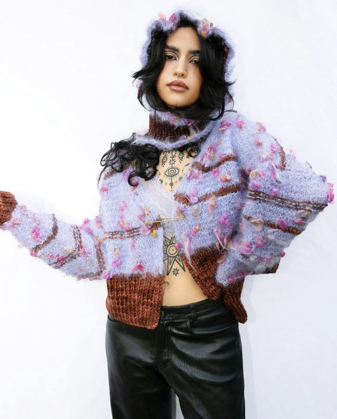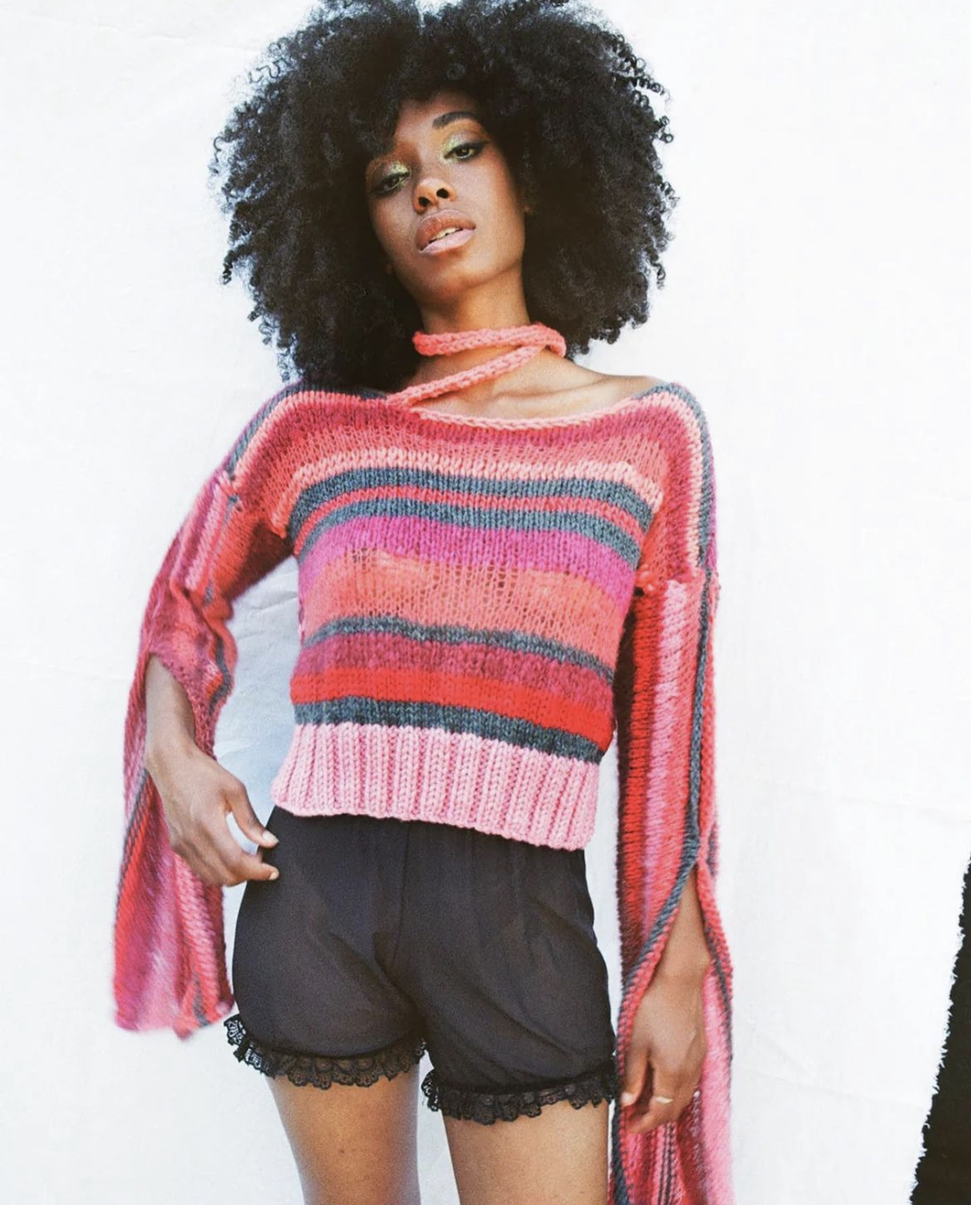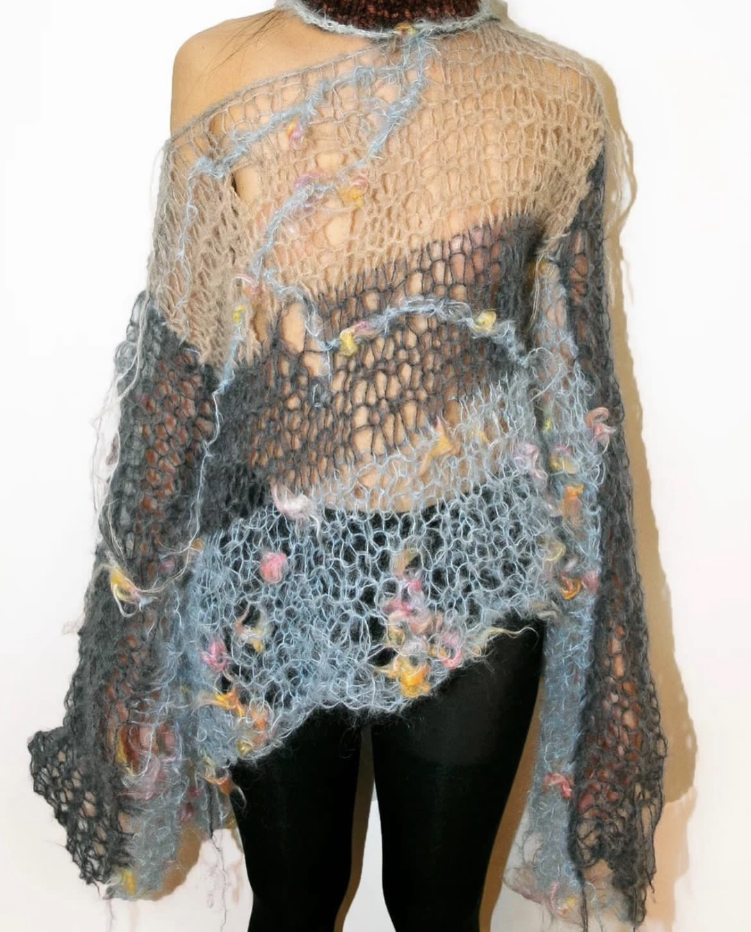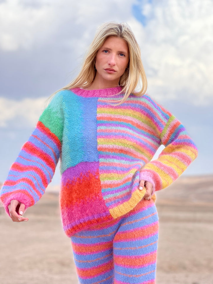 Rose Carmine是由设计师Sandrine Ganem于2012年创立的法国小众品牌。Sandrine Ganem原本是彩绘师,她从日落时的晚霞、雨后的彩虹、山川河流等等各种大自然风光中中吸取灵感。它家的毛衣都是欧洲手工编织,毛线颜色都是设计师定制的,色差饱和度和蓬松度极高。主打渐变色、撞色的彩色系的毛衣,像是把彩虹穿在了身上,每件都需要2-4天手工编织。以马海毛为主,搭配Lurex彩色金线,极具梦幻感。