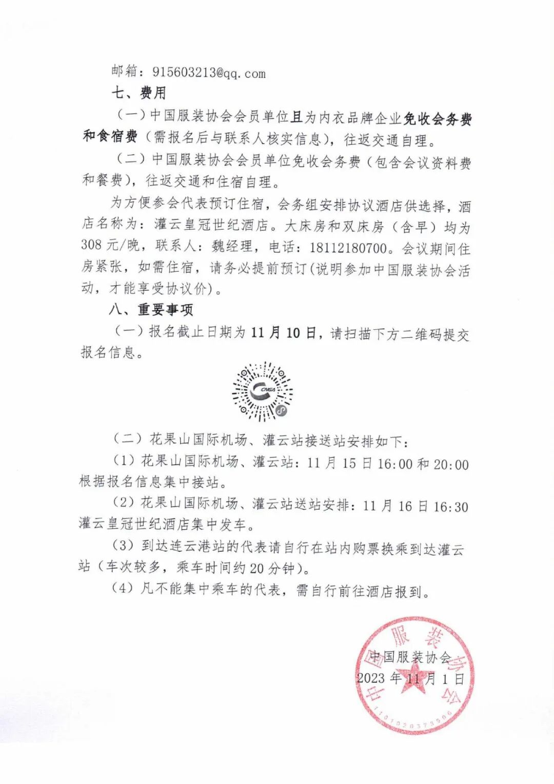 (二)中国服装协会会员单位免收会务费(包含会议资料费和餐费),往返交通和住宿自理。