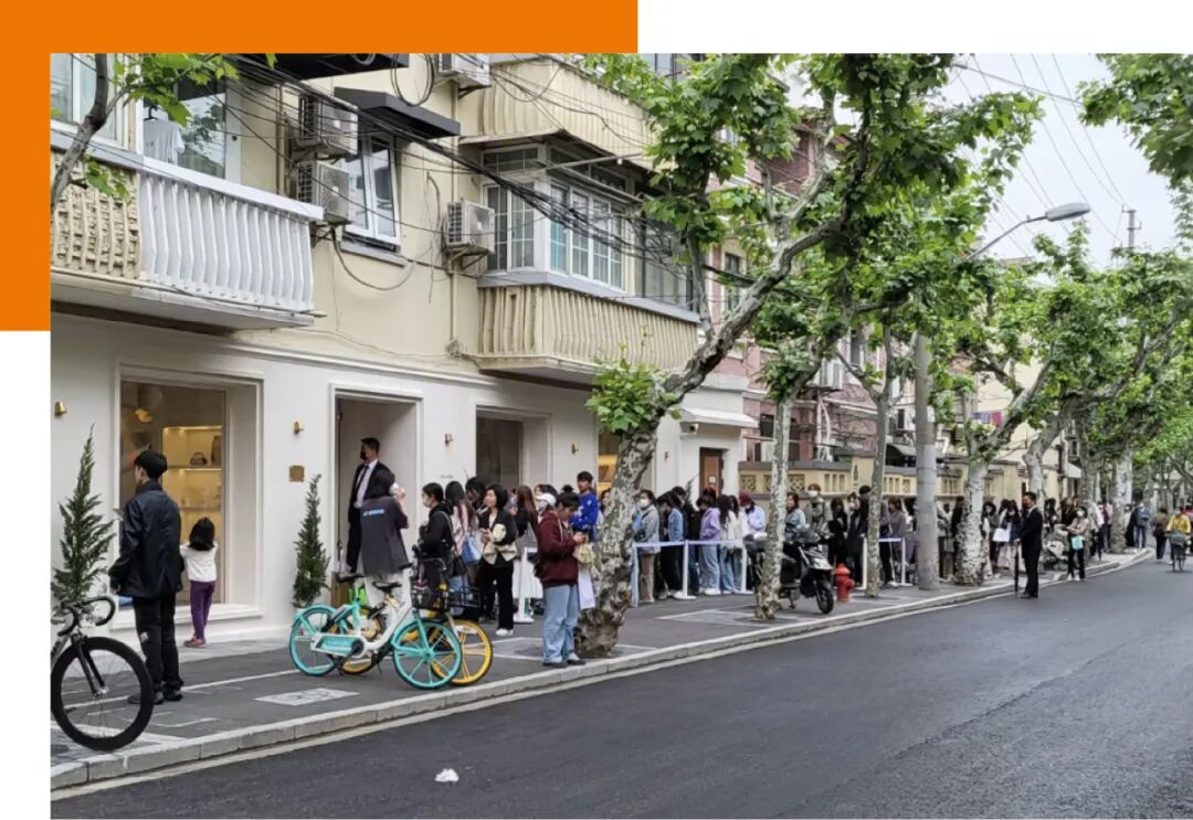 开业当天Goodbai 发售上海城市限定款新品引发线下抢购热潮自品牌中国首家官方店铺落地深圳万象天地,此后不到一年的时间里,We11Done 将自己的线下旗舰店开进北京、上海、杭州、成都等城市的核心商圈。另一方面,We11Done 背后的明星效应以及街头潮流文化属性促使品牌的爆款单品经常在社交媒体上引起轰动,吸引了大批年轻消费群体蜂拥抢购,这一现象也让刚刚体会过寒冬,急需消费回暖的实体零售业为之所动。