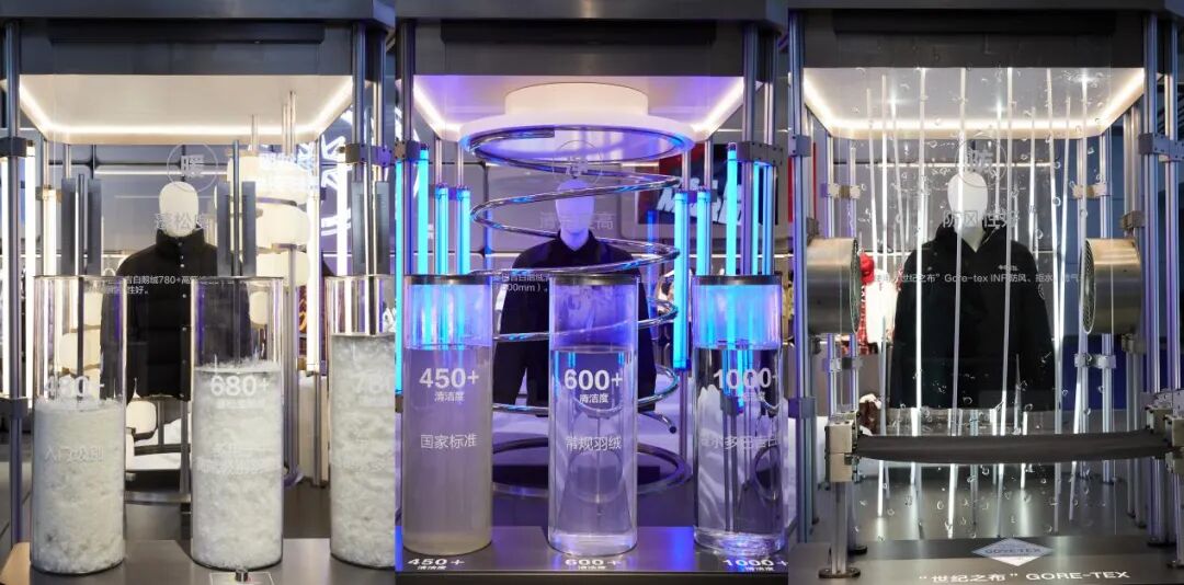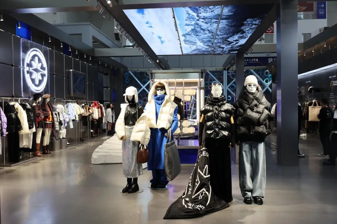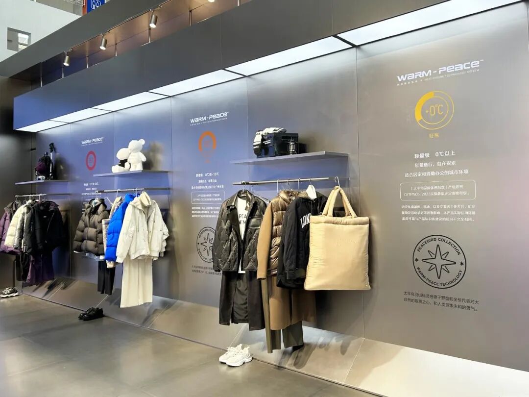 蓬松度高——暖。众所周知,在充绒量、含绒量相当的情况下,羽绒服蓬松度越高,保暖性能越好。展位装置通过氛围灯亮度的变化,动态呈现绒包蓬松度。此外,还将680+FP、780+FP等蓬松度的绒子添加至透明圆柱,可视化展现绒子蓬松度。据悉,太平鸟羽绒服甄选优质羽绒填充,衬衫式羽绒更是升级采用霍尔多巴吉白鹅绒,蓬松度高达780+,远高于国际标准680+,绒朵更大、绒丝更长、品质更高,保证优越的保暖性能。清洁度高——净。除了蓬松度、充绒量、含绒量等重要参数外,清洁度作为关乎穿着者健康的指标,也不可忽视。因此,展位特设净化装置,通过水流模拟出羽绒洗绒的简化过程,并直观展示不同清洁度的羽绒情况。太平鸟坚持清水绒工艺,每一朵羽绒在正式填充进成衣前,都历经多次除尘、漂洗、高温消毒,绒朵清洁度高达1000+,高于国标2倍。同时推出可追溯羽绒系统,一衣一码,严控防伪,每一朵绒都透明可溯,真正带来安心与放心。防水性好——强。对于一件优质羽绒服来说,除了要有好绒外,其外层面料也需兼具防水、防风性能,确保穿着者在冬季保持干燥舒适。因此,展位装置通过高速水、强力风冲击内置羽绒服,模拟GORE-TEX INF面料在恶劣天气中的表现。据悉,该面料被誉为“世纪之布”,具有防水、透气和防风功能,是太平鸟羽绒服坚持选用的面料之一。此外,太平鸟也持续开拓东丽、帝人、英威达、戈尔公司等在内的国际优质面料供应商合作矩阵,力求给消费者提供更优质的服饰、更舒适的体验。时尚元素瞬息万变的今天,人们对羽绒服的需求也更多样,即一款优质羽绒服不仅要注重实用性和保暖性,还要融入时尚元素。太平鸟作为时尚界的领军品牌,不仅坚持追求高端品质,同时也注重引领时尚潮流。三重暖科技,高效锁暖与舒适轻盈同时在线。太平鸟羽绒服全新升级WARM-PEACE热感驱动系统,打造一重制暖、二重倍暖、三重锁暖的“三重暖”核心暖感科技理念。一重制暖,以太空级保暖黑科技面料与火山岩热感纱,实现长效保暖、高效蓄热和轻量透气性。二重倍暖,以好绒为温暖内核,蓬松度、清洁度等均远高于标准,真正带来更温暖、更洁净、更安心的领先品质。三重锁暖,通过搭载超轻量肤感面料与360°无缝锁绒科技,实现绒朵不钻空;同时采用黑蜂蓄热里布,实现高效锁暖与舒适轻盈同时在线。