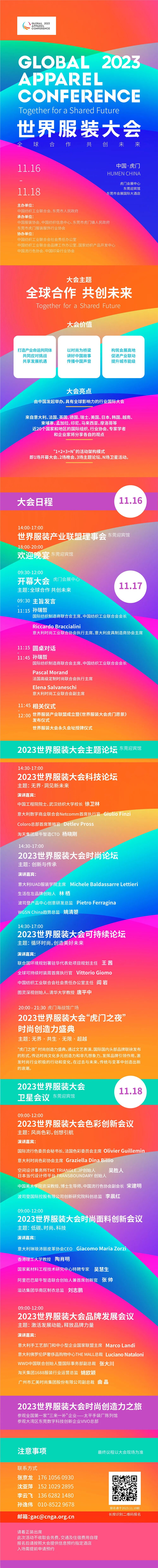 11月16至18日,2023世界服装大会将在东莞虎门盛大举行。大会由中国纺织工业联合会、广东省东莞市人民政府主办,中国服装协会、中国纺织信息中心、东莞市虎门镇人民政府、东莞市虎门服装服饰行业协会承办。大会旨在全球范围内为世界服装产业的合作共赢构建长效沟通机制,将聚焦“全球合作,共创未来”主题,在三天时间里,通过举办开幕大会、主题论坛、时尚盛典、卫星会议等议题重磅、形式多样的活动,为世界服装业界搭建起共商、共建、共享、共赢的时尚平台。