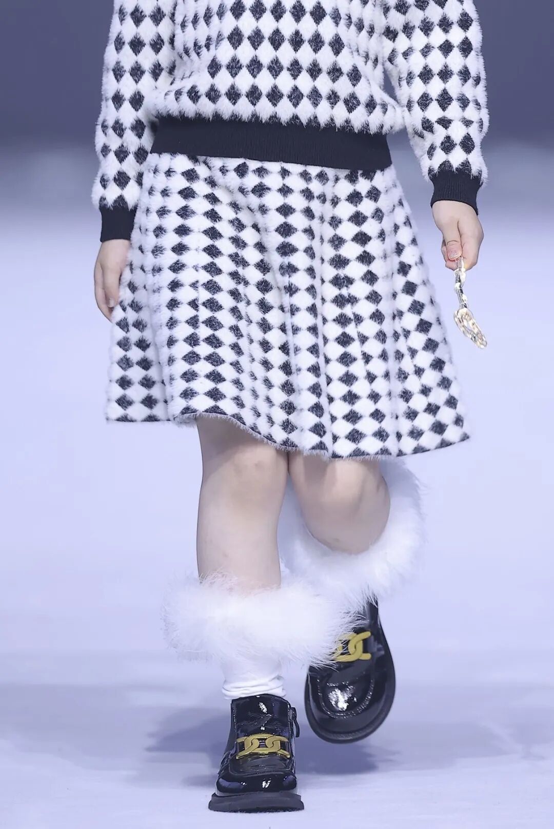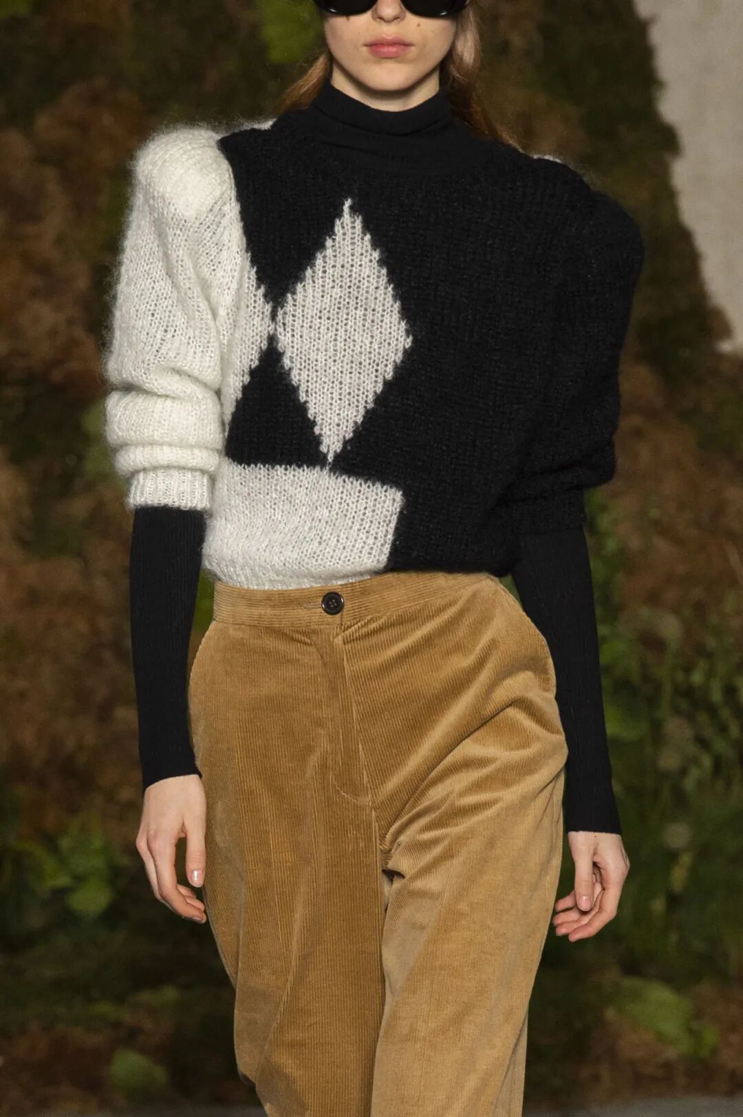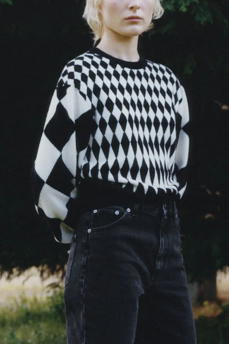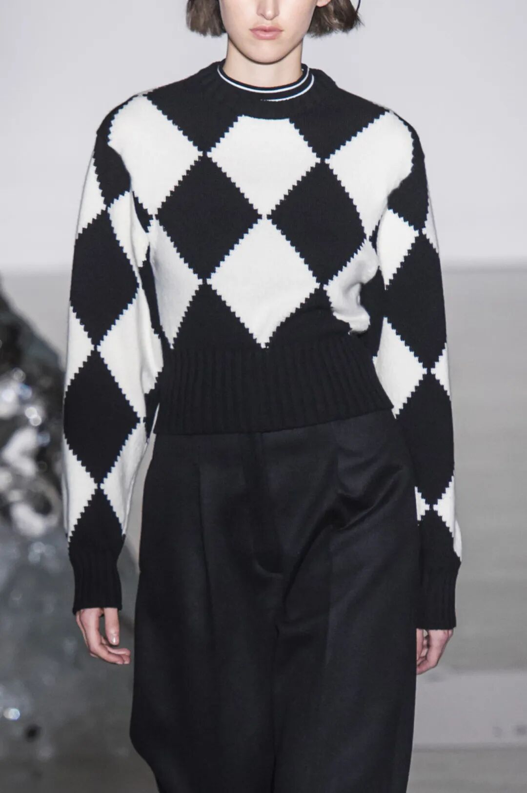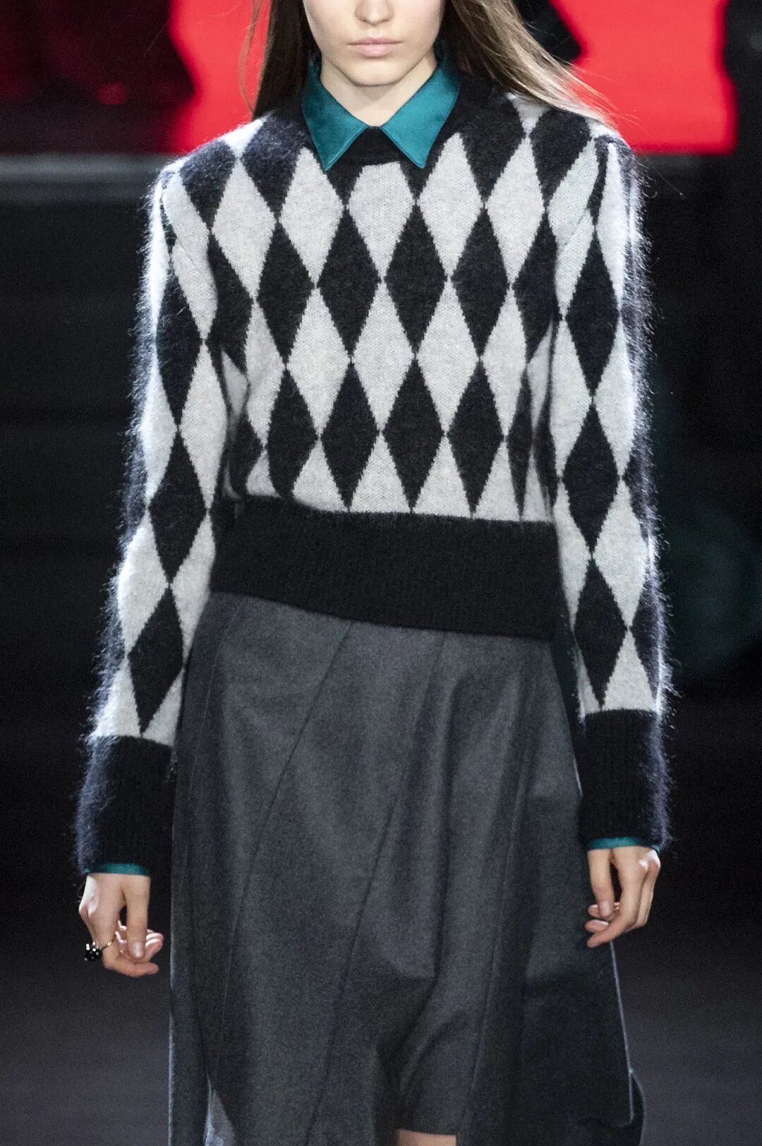 菱形图案是格子元素的一种表现形式,通过角度和方向上的变化,比普通格子多了一份灵动、活泼,让整体服装造型更时尚,而黑白配色的菱格纹更是让服装变得优雅,复古气息扑面而来。菱格纹在针织服装设计中通过大小、方向、角度、排列方式等能呈现多姿多彩的视觉效果。