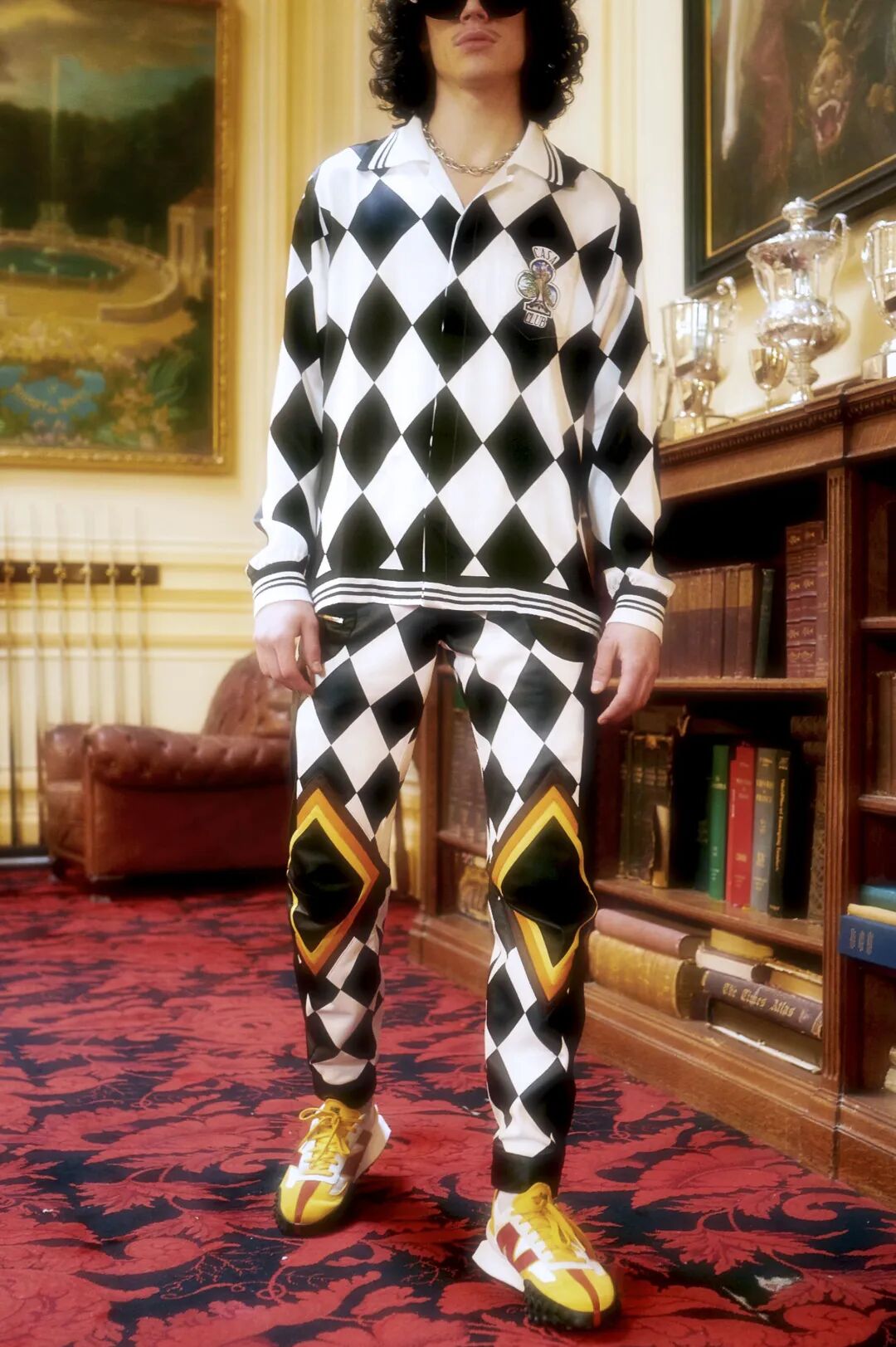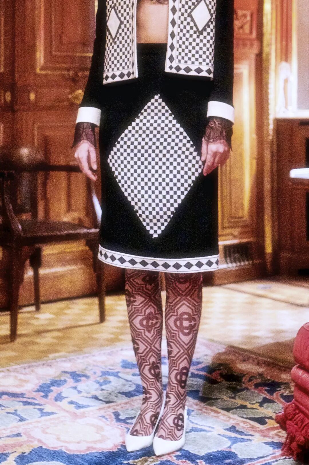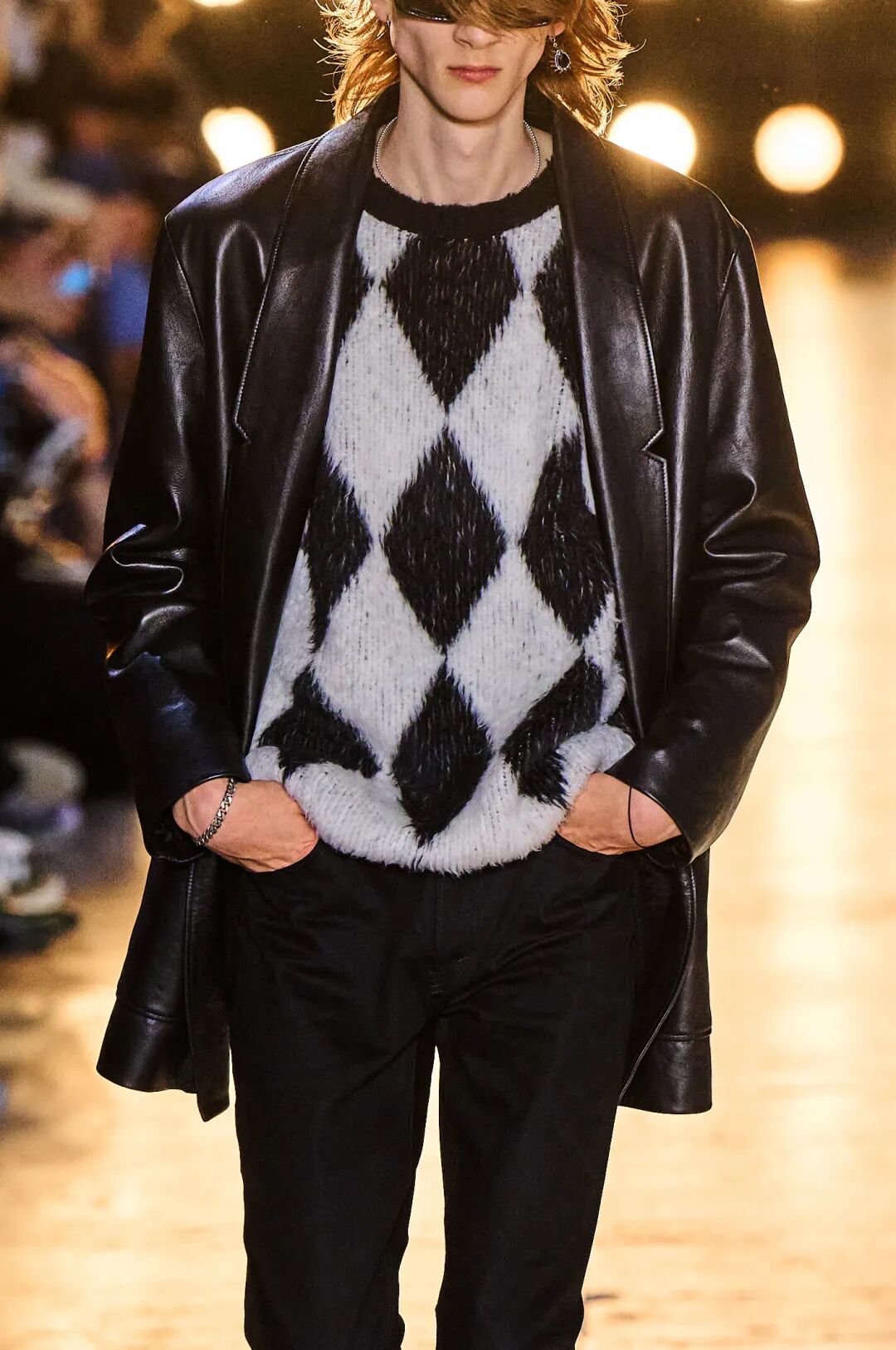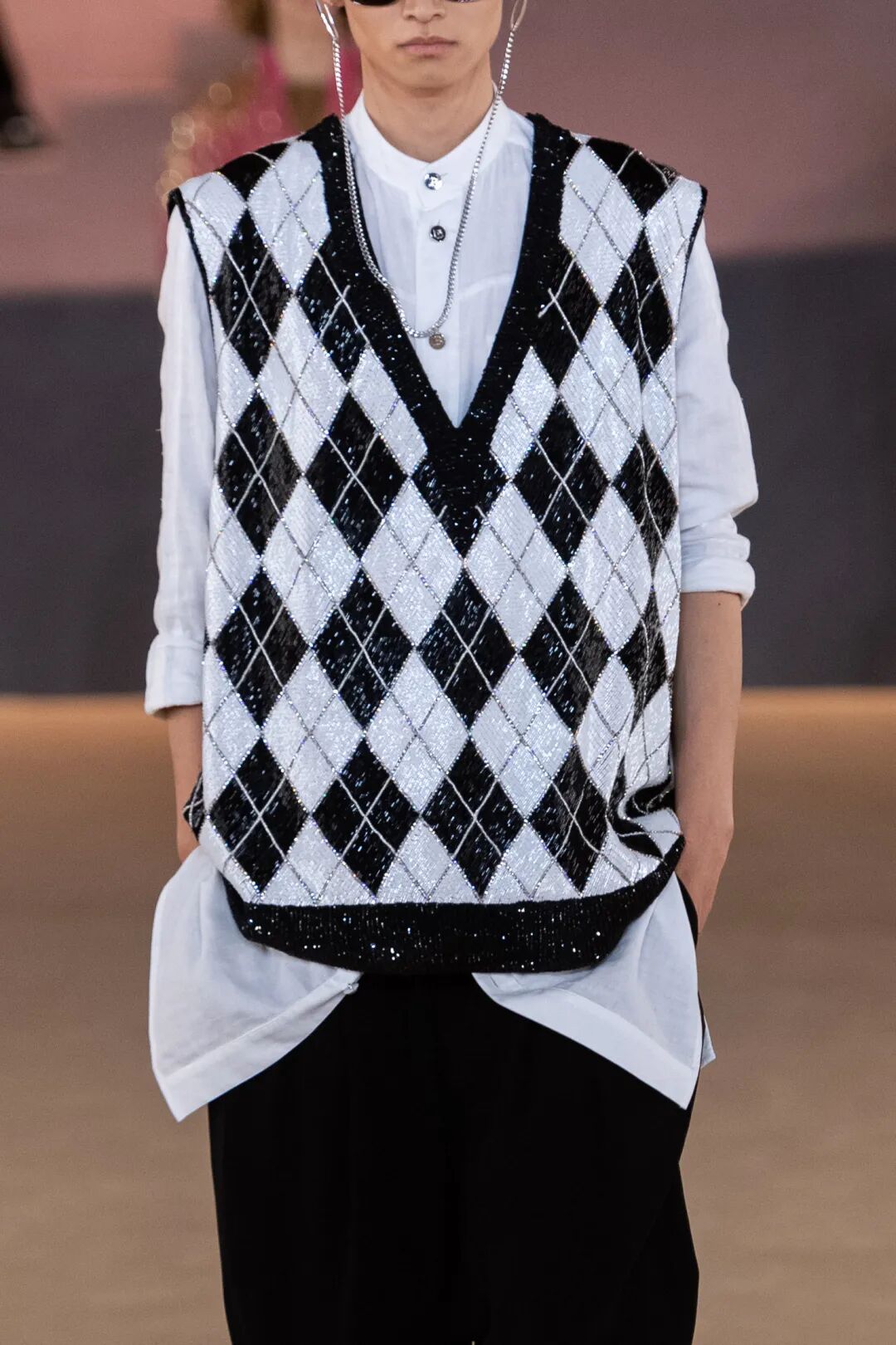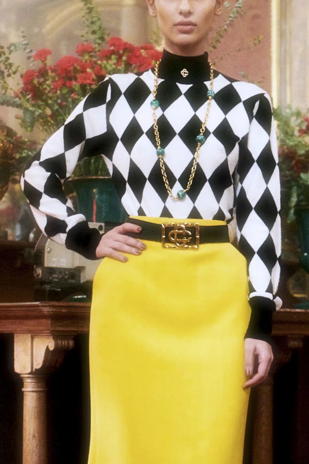 菱形图案是格子元素的一种表现形式,通过角度和方向上的变化,比普通格子多了一份灵动、活泼,让整体服装造型更时尚,而黑白配色的菱格纹更是让服装变得优雅,复古气息扑面而来。菱格纹在针织服装设计中通过大小、方向、角度、排列方式等能呈现多姿多彩的视觉效果。