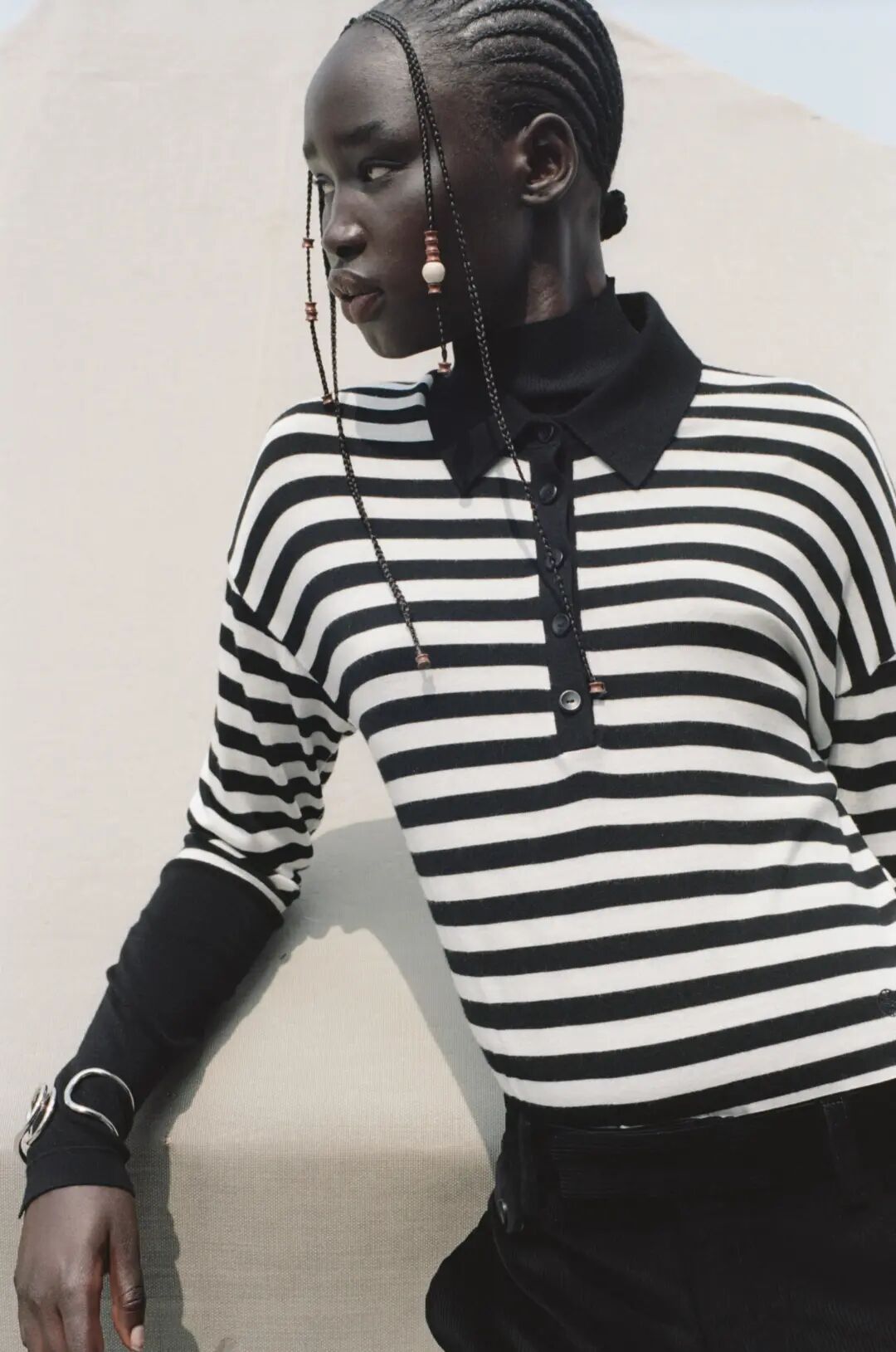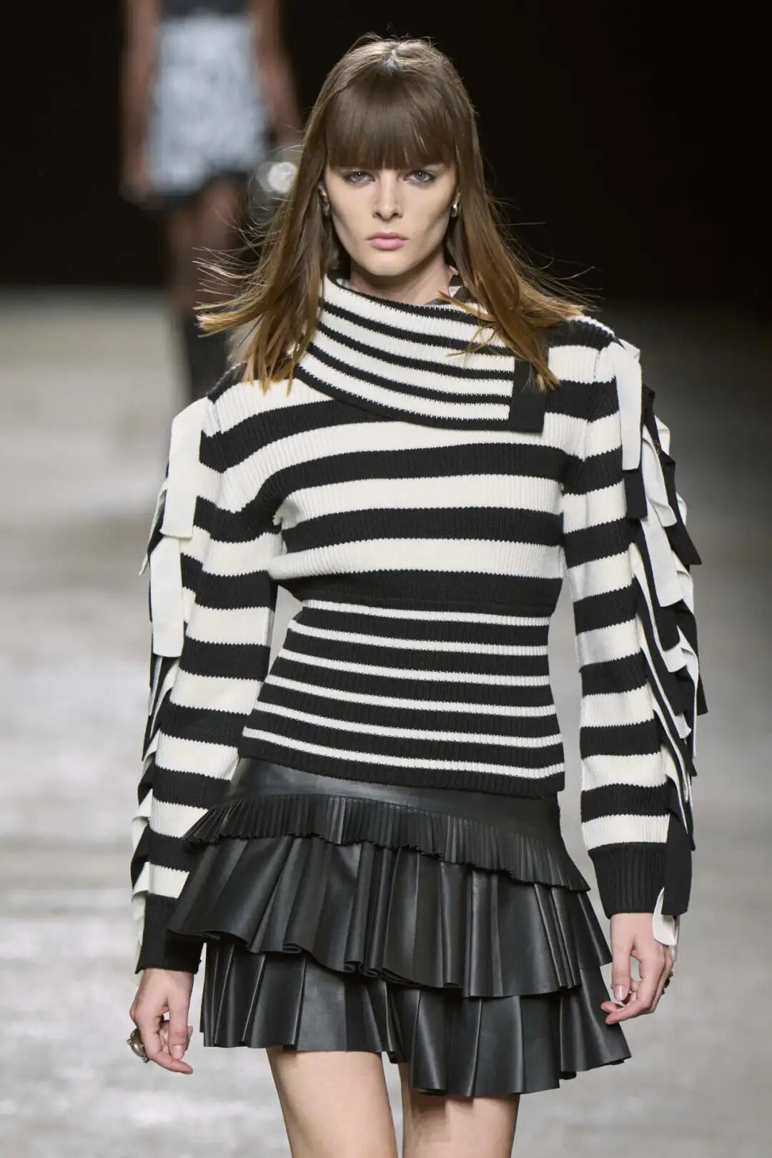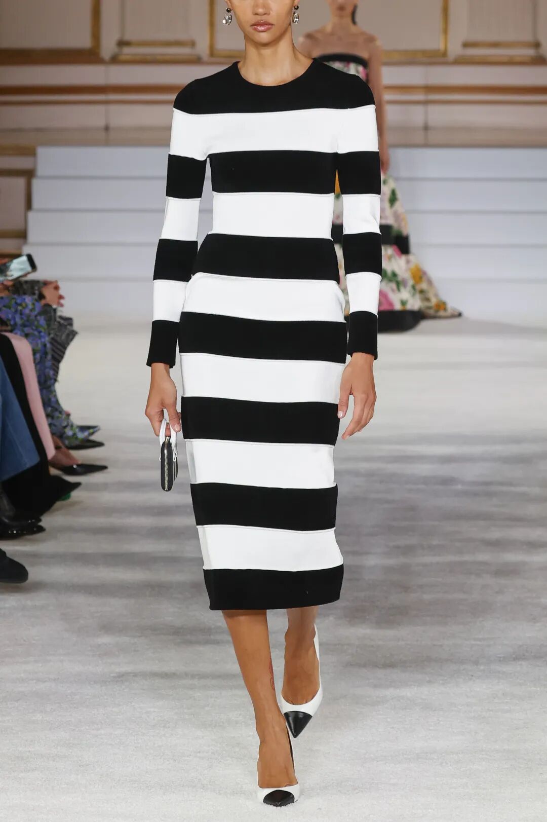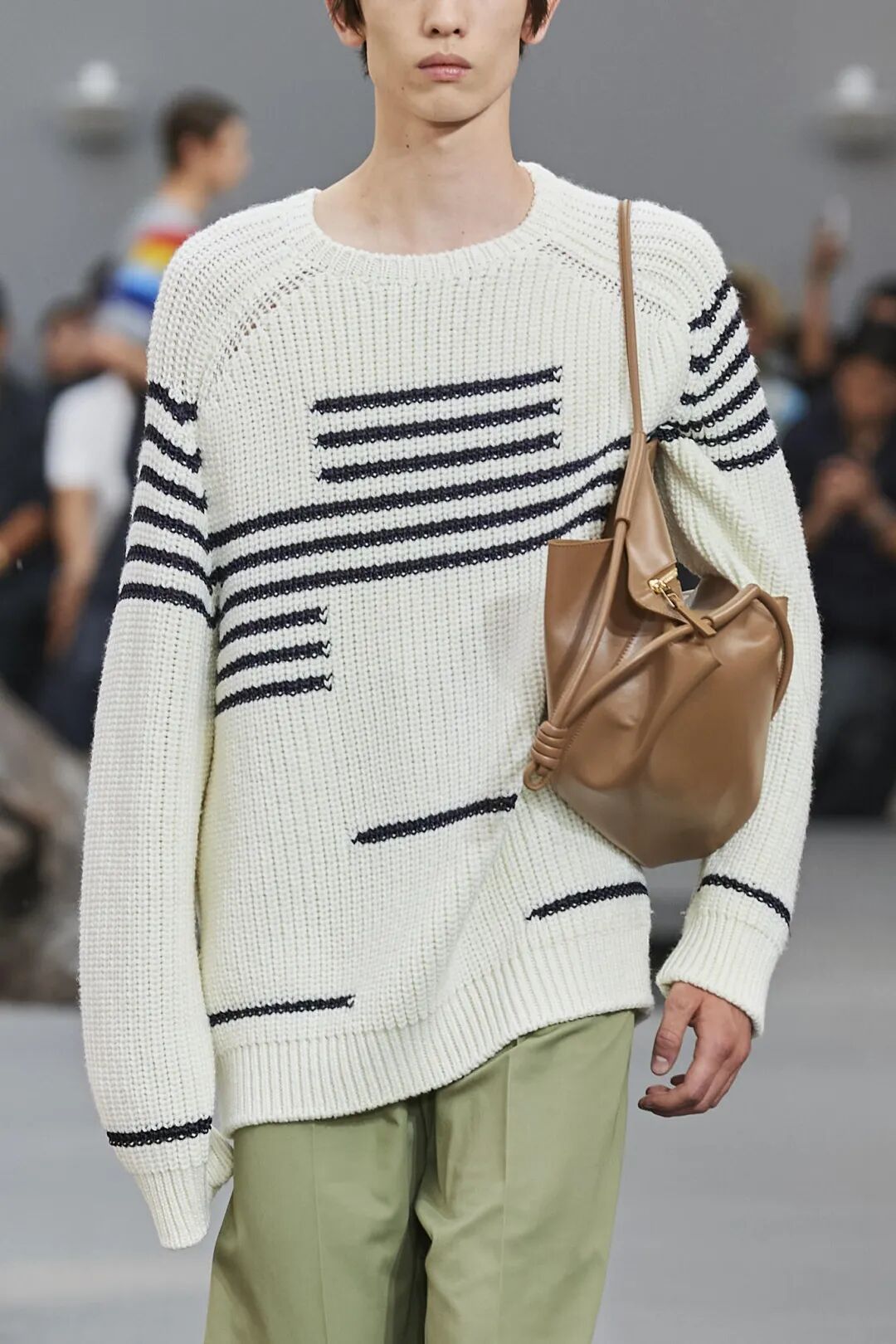 排列均衡的醒目线条以其吸睛的图案特点,使条纹毛衫成为了大众衣橱里必不可少的经典单品。条纹最初因海军服而流行起来,至今已超过100年历史,其表现效果可优雅,可街头,可谓是是经久不衰的经典。在黑白配色的基调上,让我们看看条纹在疏密变化、方向、各部分结构上的适配上能出现什么效果吧~