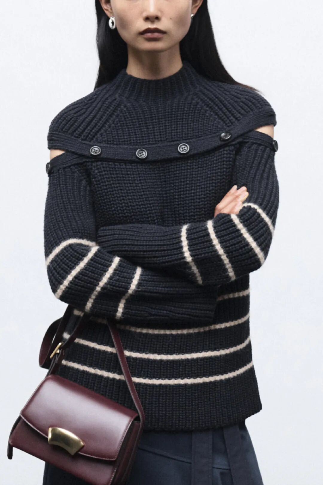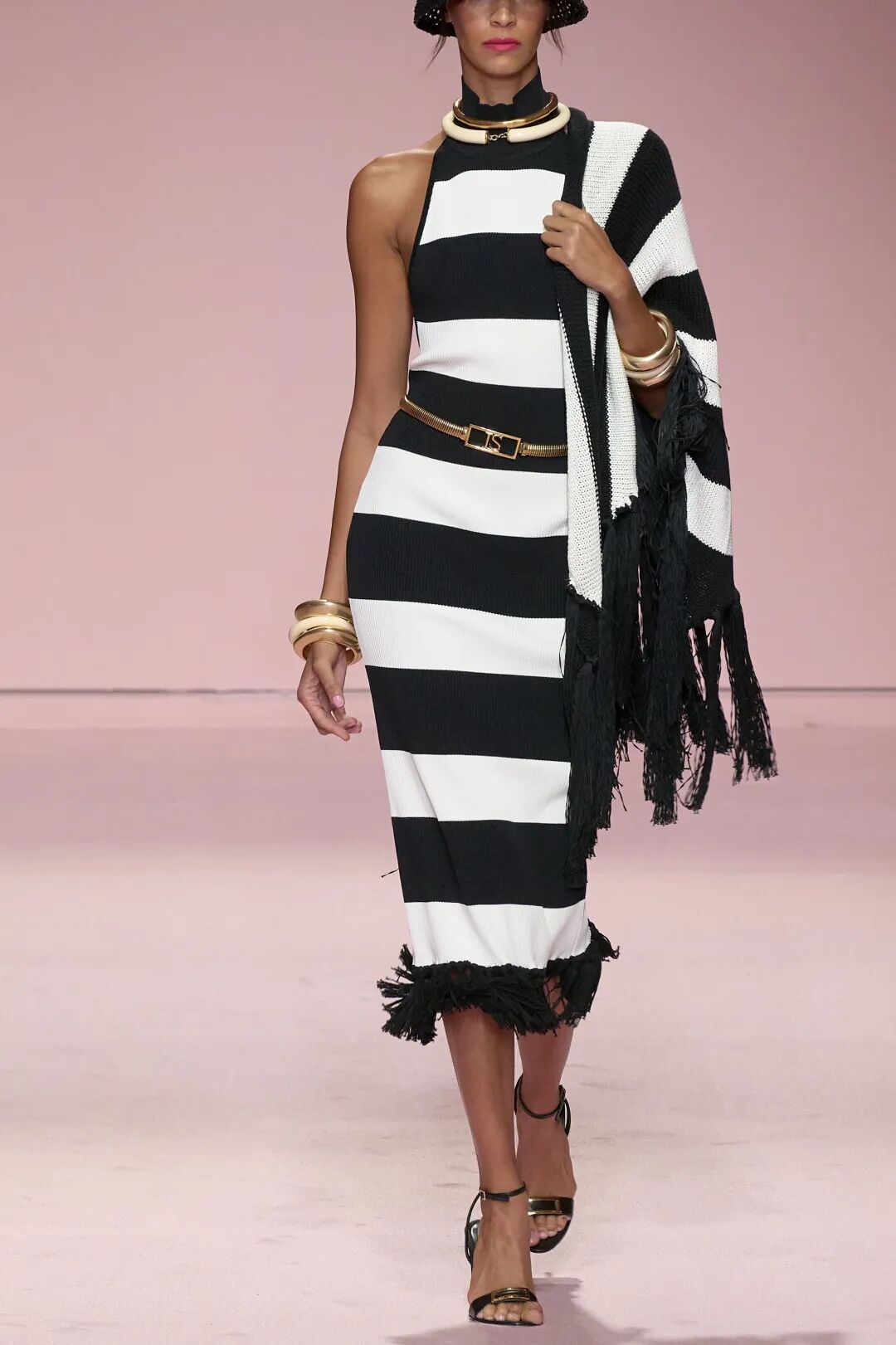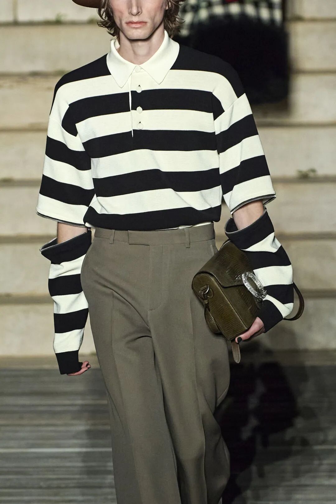 排列均衡的醒目线条以其吸睛的图案特点,使条纹毛衫成为了大众衣橱里必不可少的经典单品。条纹最初因海军服而流行起来,至今已超过100年历史,其表现效果可优雅,可街头,可谓是是经久不衰的经典。在黑白配色的基调上,让我们看看条纹在疏密变化、方向、各部分结构上的适配上能出现什么效果吧~