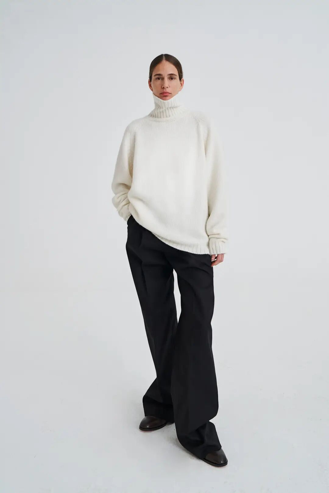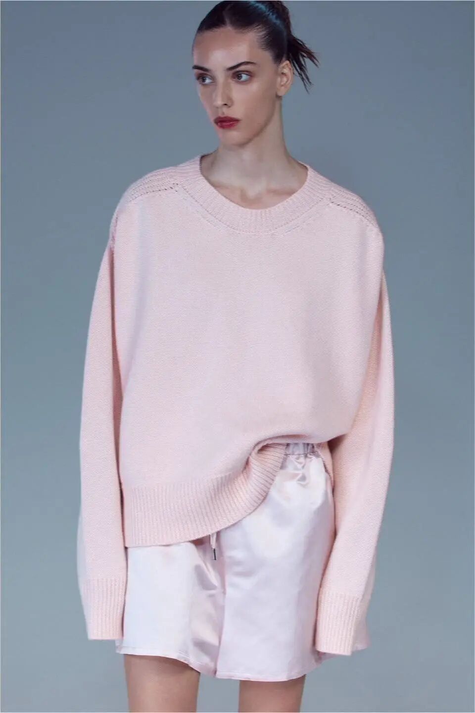针织平纹组织是一种单面组织,正面细节上呈现竖向纹理,反面则呈现横向纹理,织物紧密平滑。虽然表面单调一致,却将针织质感发挥到了简约高级的境界,与柔和色彩结合易给人简单干净爽朗的亲切感。