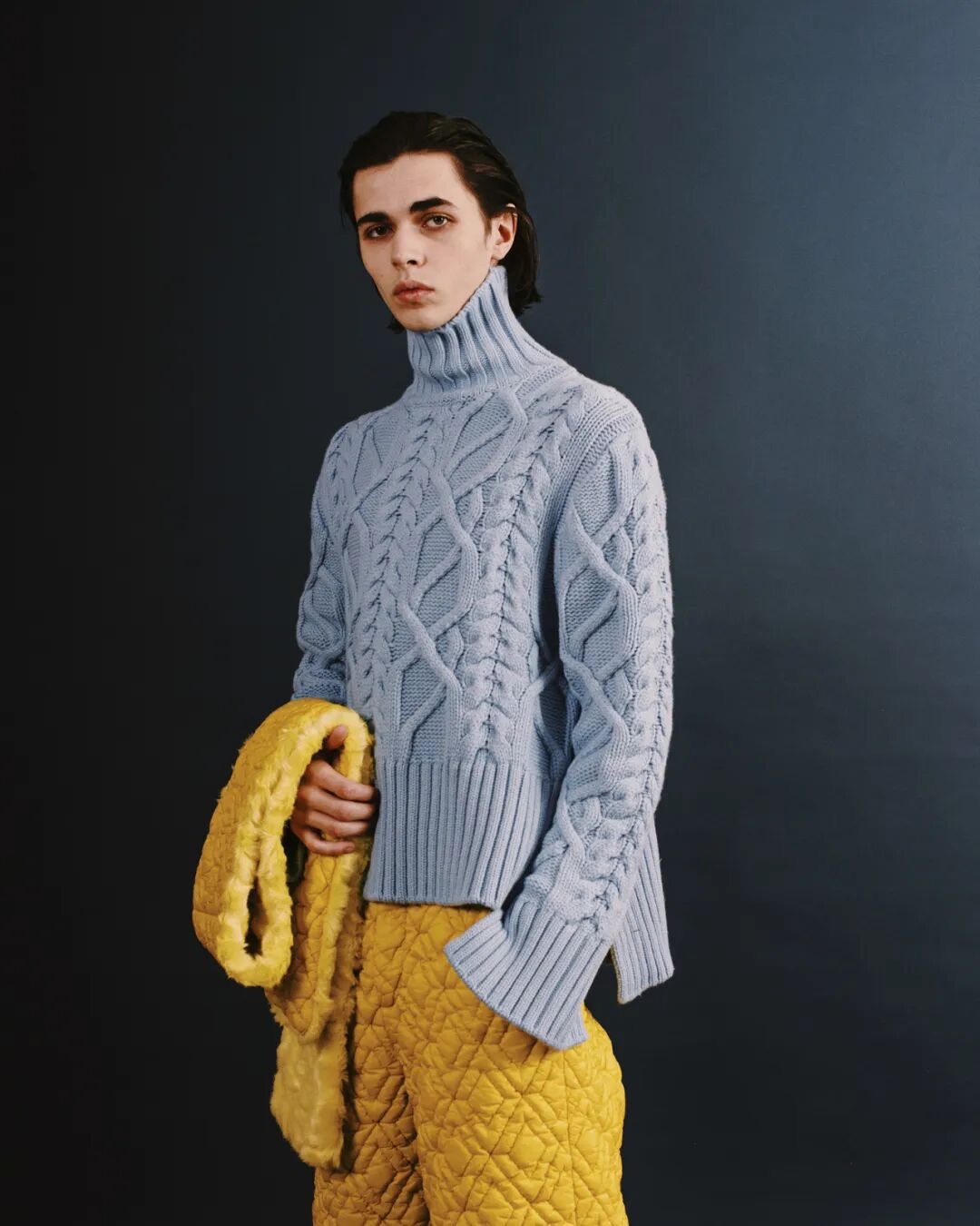 通过相邻线圈的相互位移而形成的绞花组织常以缠绕、交织、交错的视觉吸引人心,是针织纹理中具有想象力和创造力的组织结构。灵活多变的绞花构成多样的立体图案带来有更多毛衫可塑的可能性。让针织时尚变得丰富有趣的同时又增添了多变的视觉美观。