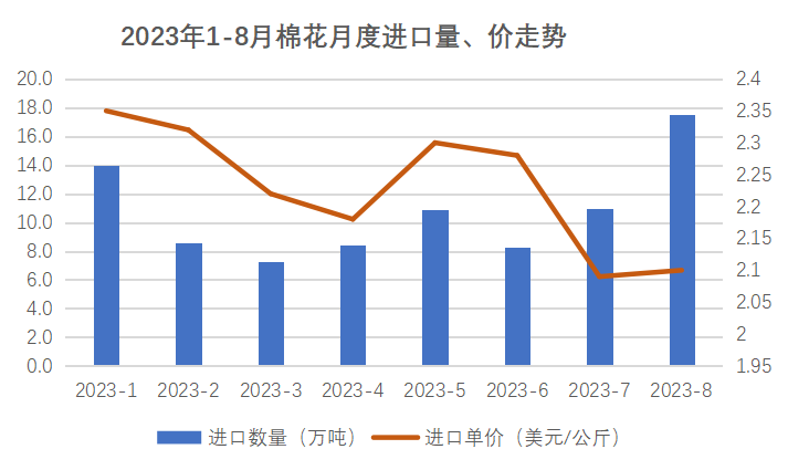 8月,我国进口棉花17.5万吨,环比增长59.6%,同比增长62.3%。其中美棉进口量仍居首位,占比为47%;澳大利亚排第二,占比29%;巴西排第三,占比10%。进口均价连续第三个月下降,每吨2100美元,同比下降26.3%,环比上涨0.5%。1-8月,我国累计进口棉花85.8万吨,同比下降37.1%;进口均价2220美元/吨,下降14.9%。化学纤维进口量升价跌,8月进口量同比上升17.2%,进口均价同比下跌16.9%。进口量前8个月累计下降9%,进口价格下降6.5%。根据中国棉花协会发布的信息,近期棉花需求有所增加,棉价震荡上行。新棉播种以来,受不利天气影响减产预期增强,国内棉花价格上行态势明显,屡创年度新高,8月31日中国棉花价格指数(CCIndex3128B)收于18294元/吨,是本年度最高点,同比上涨2310元;月均价为18109元/吨,环比上涨352元,同比上涨2276元;同期,Cotlook A指数为98美分/磅,环比上涨3.2%,同比下跌25%,折1%关税价格为17194元/吨,低于国内棉价1100元,较上月缩小162元。