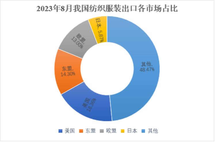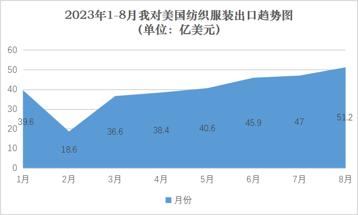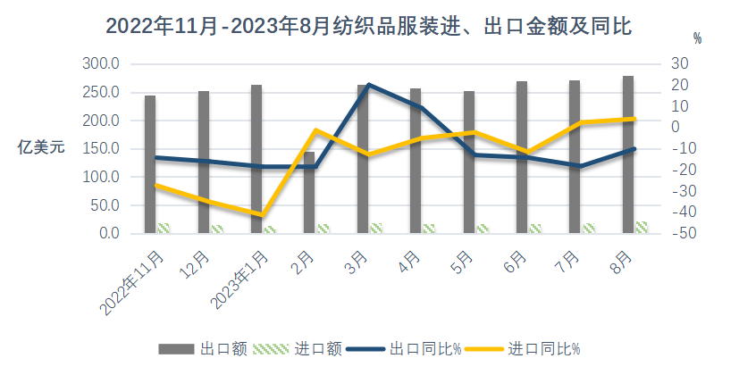 8月,我国经济发展恢复向好,外贸出口降幅收窄,好于预期。纺织服装本月出口下降10.2%,降幅较上月大幅收窄8.1个百分点。主要原因有:一是国家保经济保增长的决心坚定。8月以来央行等机构通过释放流动性、降息降准、下调股市印花税和优化房地产金融政策等为经济回稳保驾护航,有效带动8月经济数据回升。二是8月以来,由于国内经济基本面压力仍然较大以及央行降息导致10年期中美国债利差倒挂程度加深,人民币对美元汇率重新出现走软迹象,8月人民币对美元即期汇率整体贬值2%,客观上有利于我出口。三是同比基数走低。去年8月,纺织服装出口额310亿美元,比去年7月缩小22亿美元,低基数为出口降幅收窄提供了支撑。