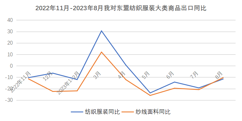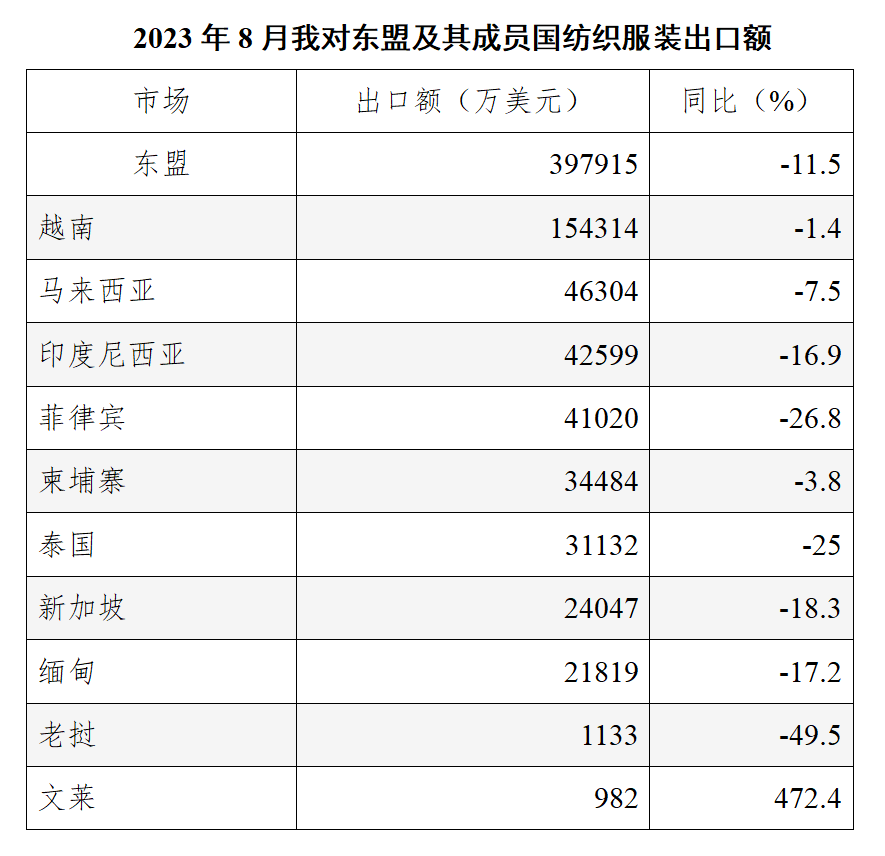 近期,美国经济复苏势头向好,需求扩大,2023 年8 月美国服饰及配饰店零售额同比上升3.6%,高于7月的1.7%,增速持续提升,纺织品和服装进口额自3月以来降幅逐步收窄。受美国市场需求上升推动,我对美出口有所回升。8月,我对美国出口纺织服装51.2亿美元,创年内新高。虽然同比仍下降1.4%,但相比上月,降幅收窄了22.7个百分点,环比则增加8.9%。自今年2月创下18.6亿美元的低记录以来,我对美纺织服装出口逐步企稳,环比已连续6个月增长。我对美主要出口产品针梭织服装8月出口额33.2亿美元,同比下降3.1%,其中出口量同比增加12.7%,出口单价同比下降14%。从美国进口数据看,7月美国自全球进口纺织服装107.7亿美元,同比下降17.4%,其中自中国进口下降25.7%,自东盟10国进口下降16.7%,自南亚3国(印度、孟加拉、巴基斯坦)进口额下降12.2%。根据美方统计,中国、东盟10国和南亚3国在美国进口中的占比分别为27.2%、24.5%和17.7%,三者合计约占美国进口的70%。7月,美国自墨西哥进口4.7亿美元,占比4.4%,同比下降3%。(二)对东盟出口继续下跌,除文莱外,对其余9个成员国出口全部下降。