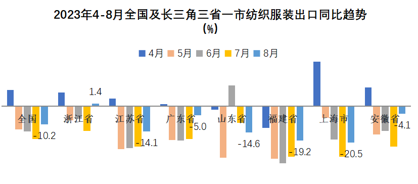 8月,在人民币兑美元汇率贬值和去年同期低基数因素的作用下,除山东下降14.6%降幅扩大外,其他主要省市纺织服装出口降幅缩小8至18个百分点。其中,浙江逆势增长1.4%,和上月(-13.8%)相比恢复15个百分点,江苏、广东、福建、上海和安徽分别下降14.1%、5%、19.2%、20.5%和4.1%。1-8月,全国31个省(市、区,不含港、澳、台)中有10个省保持增长,其中新疆(38%)、广西(78%)、四川(24%)、黑龙江(53%)、贵州(57%)增幅较大。排名前六的重点地区中浙江、江苏、广东、山东、福建和上海分别下降6.8%、18.3%、13.7%、10.9%、21.3%和15.5%,降幅较上月略有缩小。