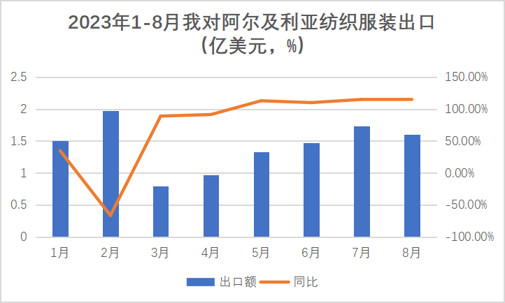 8月,我对日出口16.4亿美元,同比下降25.4%,降幅相比上月扩大11.6个百分点,环比则增加9.3%。大类商品针梭织服装对日出口11.3亿美元,下降25.7%,其中出口量同比下降21.5%,出口单价下降5.3%。从日本进口数据看,7月日本进口纺织服装26.5亿美元,下降6.8%。中国、越南和孟加拉为前三大进口来源国,7月进口额分别为13、4.4和1.1亿美元,自中国进口同比下降16.7%,自越南和孟加拉则分别增长2.7%和1.6%,三者占比分别为49.3%、16.6%和4.2%。近段时间以来,部分原来在华投资设厂的日本企业将生产线转移至东南亚、南亚,投资带动贸易,日本企业采购也有部分向东南亚、南亚转移的趋势。(五)中亚和西亚非洲等“一带一路”沿线国家仍是出口主要增长点,对阿尔及利亚出口额连续四个月同比增幅超过100%。