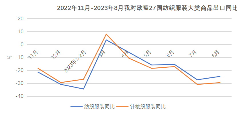 8月我对东盟出口纺织服装39.8亿美元,同比下降11.5%,相比上月降幅收窄7.8个百分点,环比上涨4.7%。分国别看,在东盟10个成员国中,除体量最小的文莱外,我对另外9个成员国的出口同比均下降。越南仍是我在东盟最大的出口市场,8月对越出口额15.4亿美元,同比下降1.4%,降幅继续大幅收窄。分产品看,8月份我对东盟出口纱线面料20.1亿美元,下降10.3%,占对东盟纺织服装出口额的50.5%;出口服装12.1亿美元,同比下降9.6%,占出口额的约30%。欧盟经济持续走弱,欧盟委员会公布的数据显示,欧元区8月经济景气指数从7月的94.5下滑至93.3,连续第四个月下降,采购经理人指数(PMI)从7月的48.6进一步降至47,创下2020年11月以来最低水平。我对欧盟出口延续跌势。8月,我对欧盟出口纺织服装36.1亿美元,同比下降24.7%,环比下降17.2%,是欧美日三大传统市场中唯一一个同比和环比均下降的,欧盟在我出口市场中的份额由去年的14.4%下滑至不足13%。在27个成员国中,除对罗马尼亚、拉脱维亚和塞浦路斯三个体量较小的国家外,对其余24国出口全部下降。重点商品针梭织服装本月出口量价齐跌,出口额22.7亿美元,大幅下降29.5%,其中出口量下降18.6%,出口均价下跌13.4%。