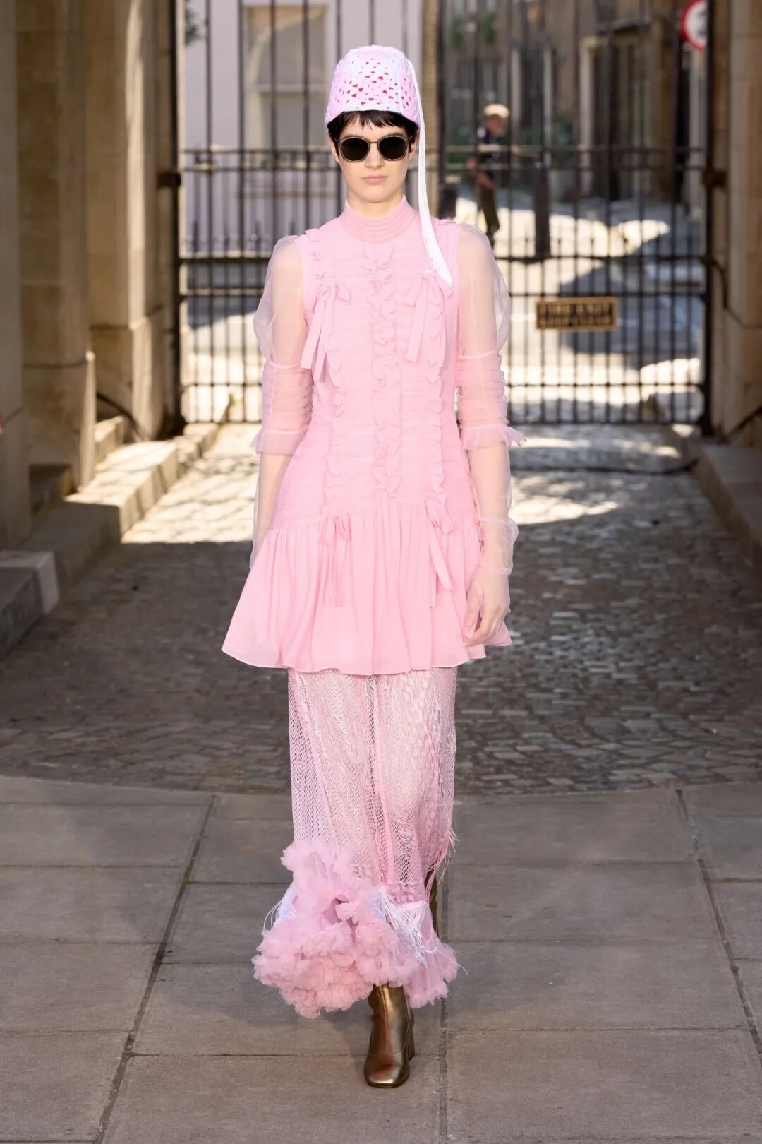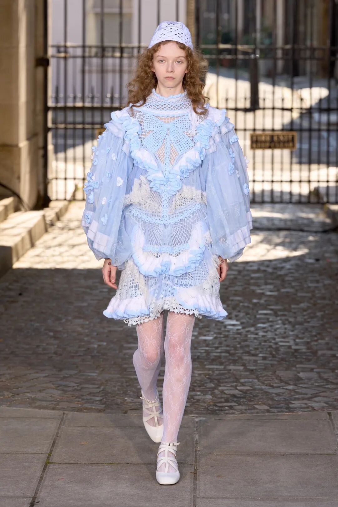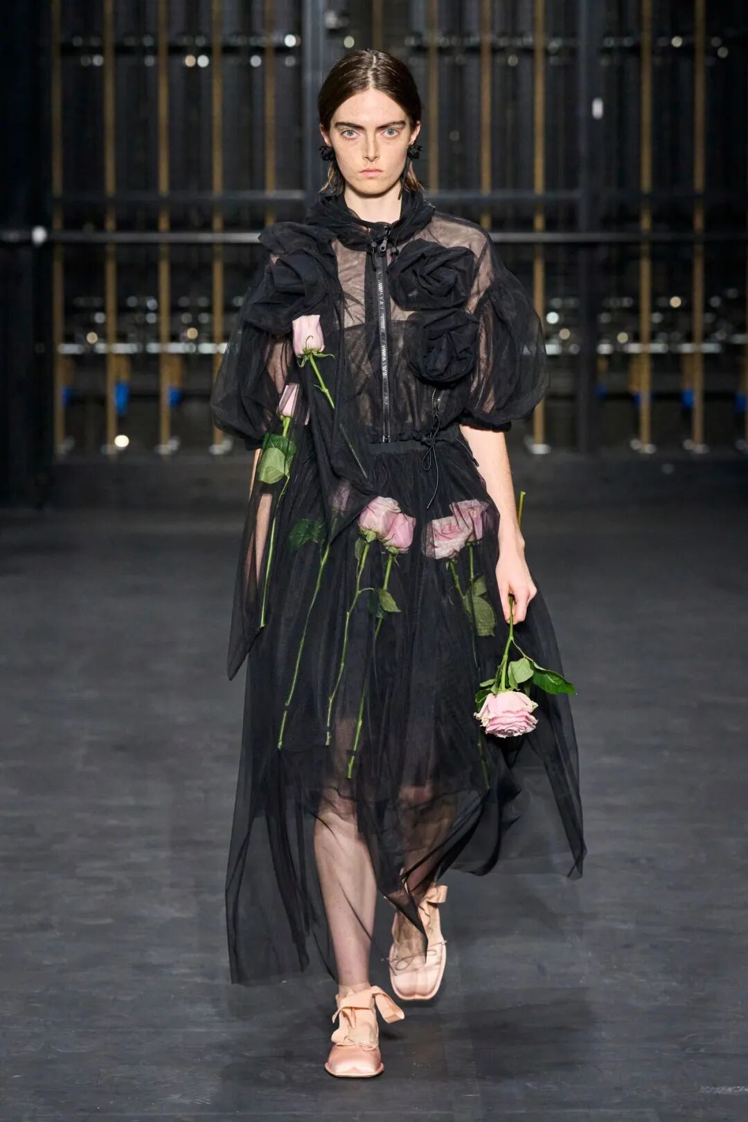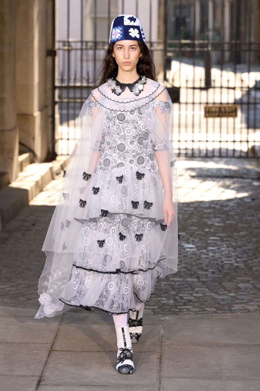 薄纱、尼龙、玫瑰、丝带、珍珠等等,是本季秀场上熟悉到不能再熟悉的身影,更让 Simone Rocha 的设计充满了摩登、浪漫的色彩。随风飘逸的蝴蝶结丝带,模特们脚踩芭蕾舞鞋、华丽的珍珠、镂空剪裁等,更是打造出了中世纪梦幻文艺少女的风格。