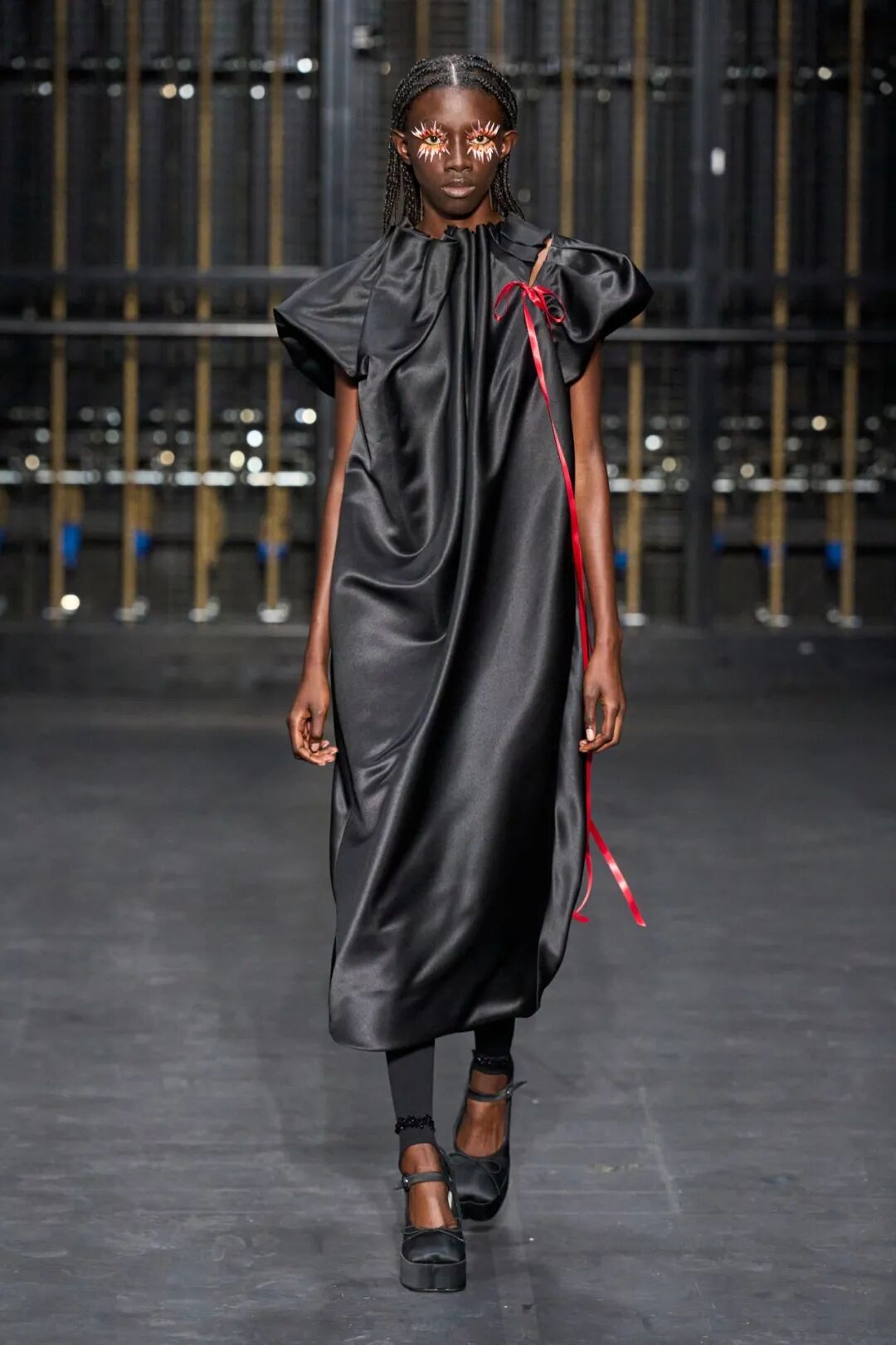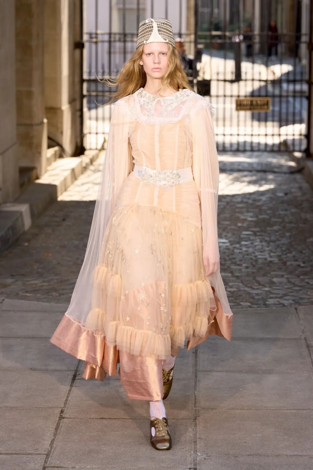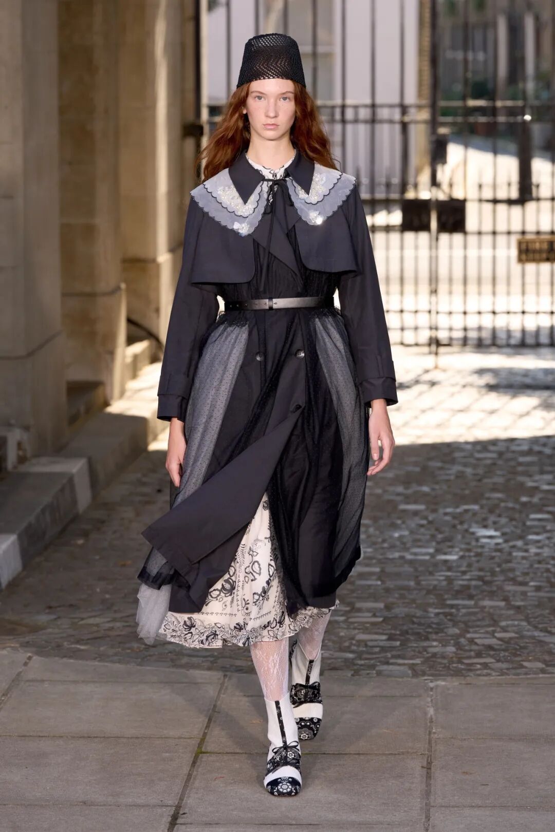 薄纱、尼龙、玫瑰、丝带、珍珠等等,是本季秀场上熟悉到不能再熟悉的身影,更让 Simone Rocha 的设计充满了摩登、浪漫的色彩。随风飘逸的蝴蝶结丝带,模特们脚踩芭蕾舞鞋、华丽的珍珠、镂空剪裁等,更是打造出了中世纪梦幻文艺少女的风格。