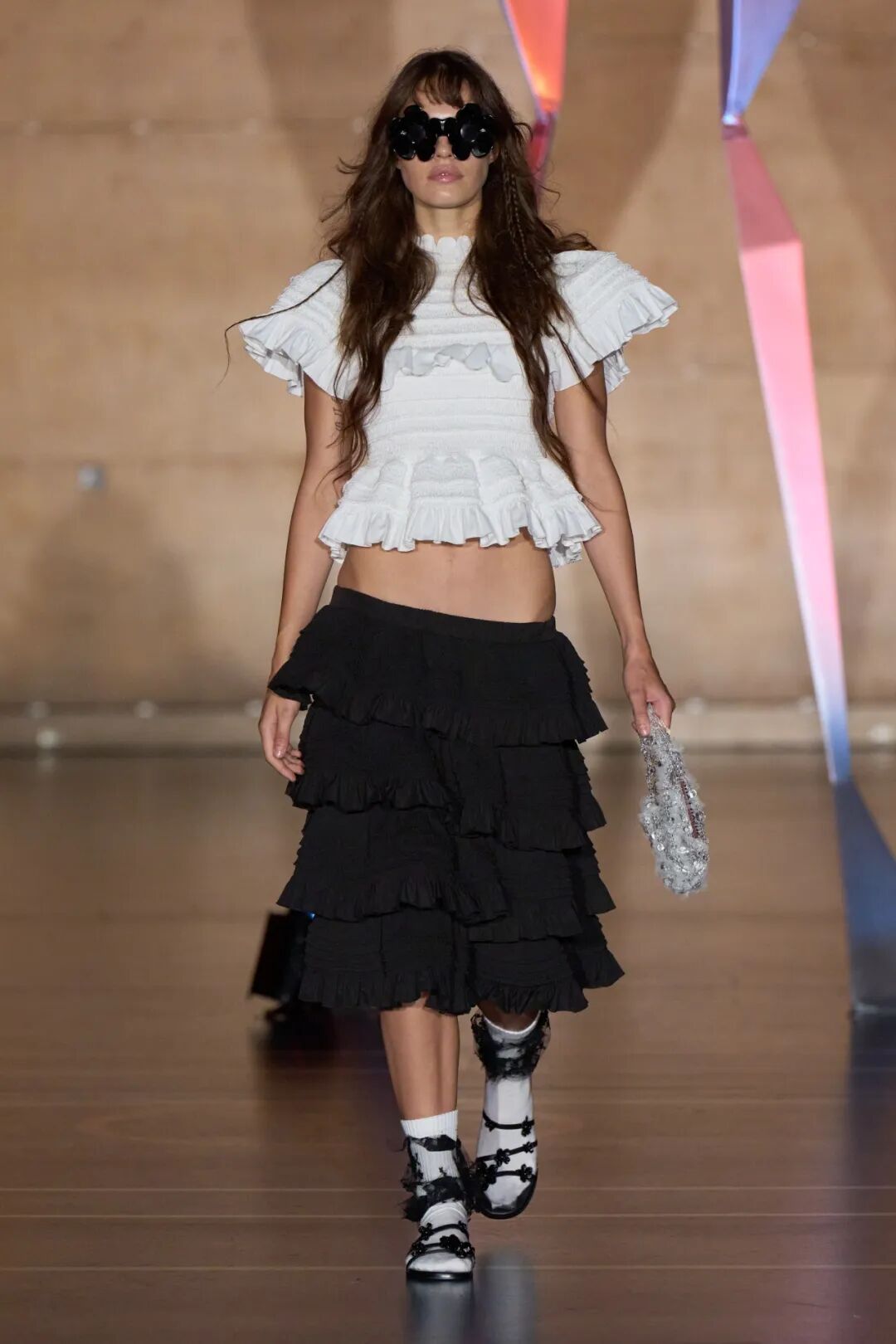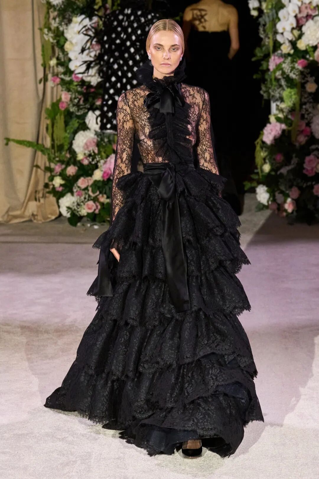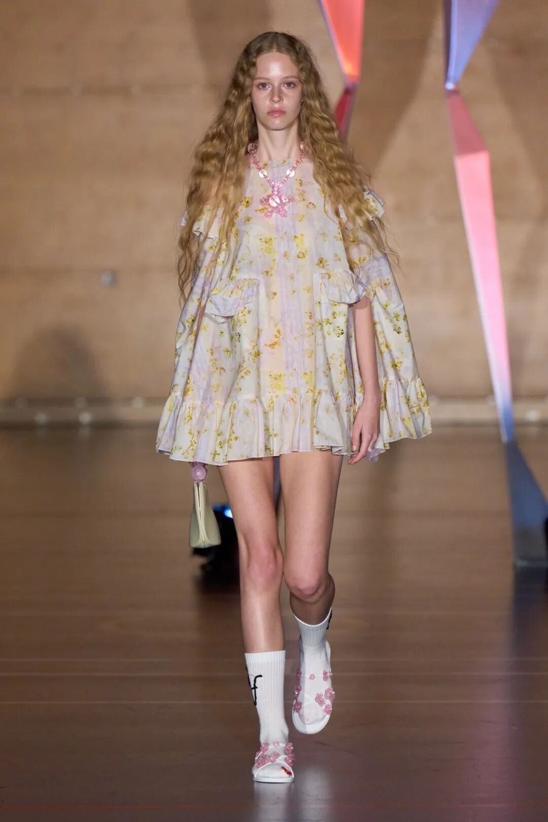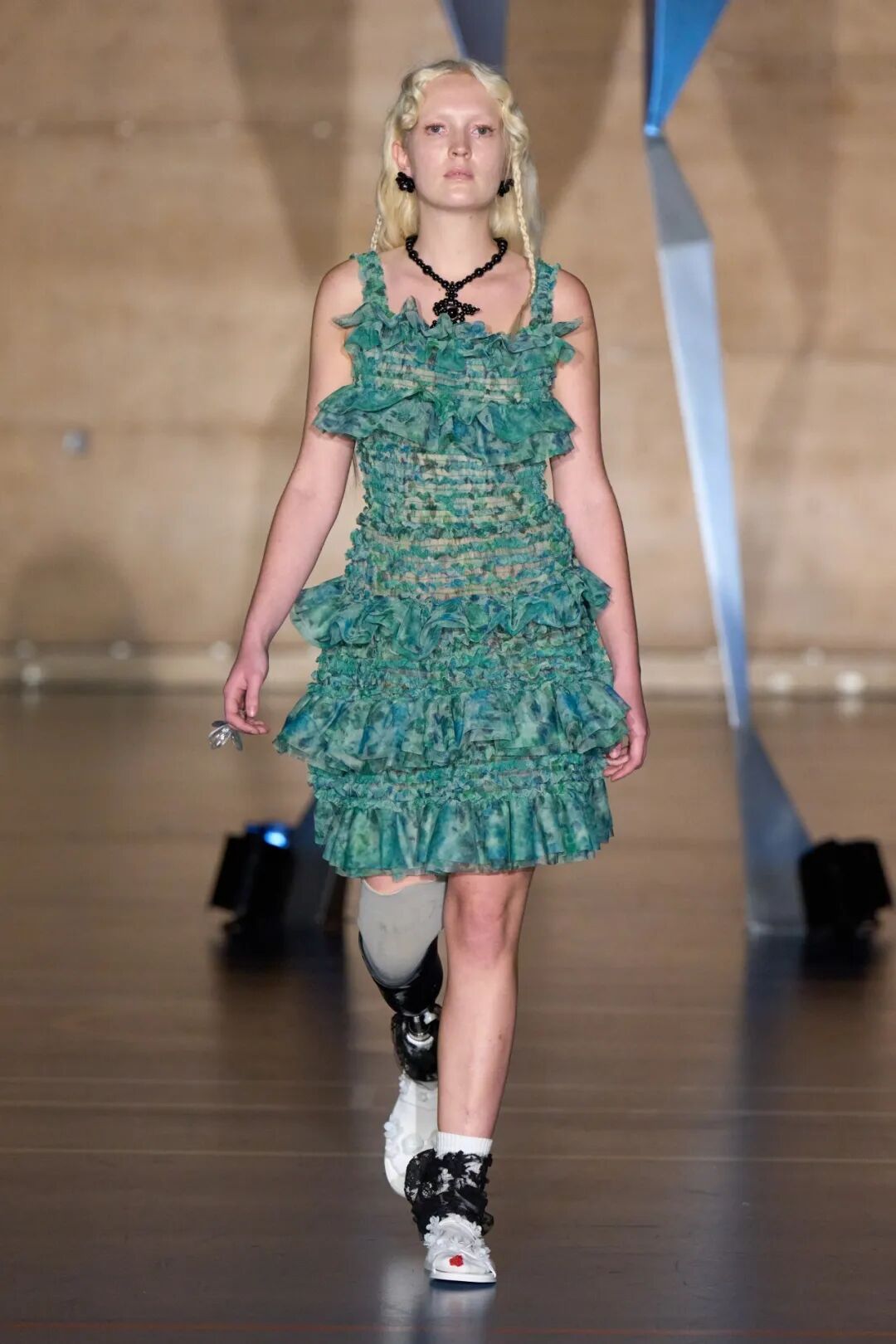 薄纱、尼龙、玫瑰、丝带、珍珠等等,是本季秀场上熟悉到不能再熟悉的身影,更让 Simone Rocha 的设计充满了摩登、浪漫的色彩。随风飘逸的蝴蝶结丝带,模特们脚踩芭蕾舞鞋、华丽的珍珠、镂空剪裁等,更是打造出了中世纪梦幻文艺少女的风格。