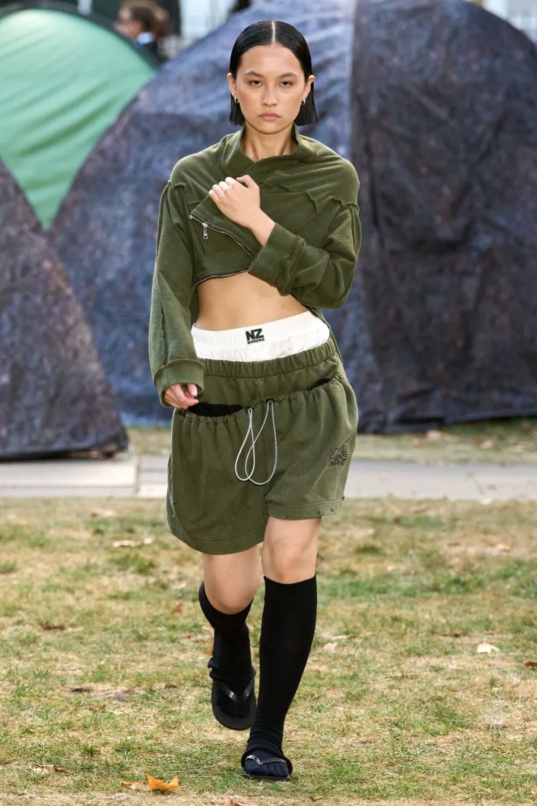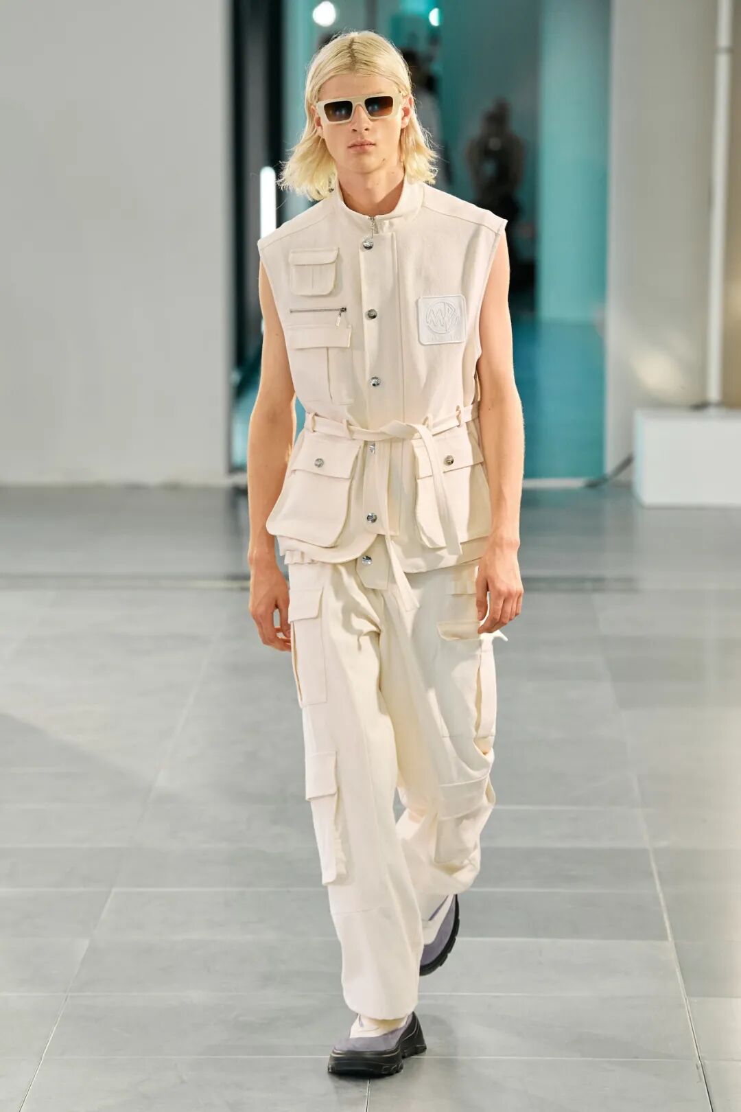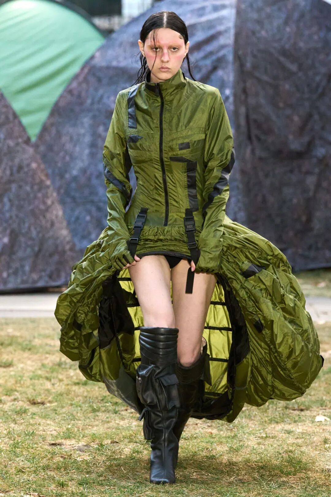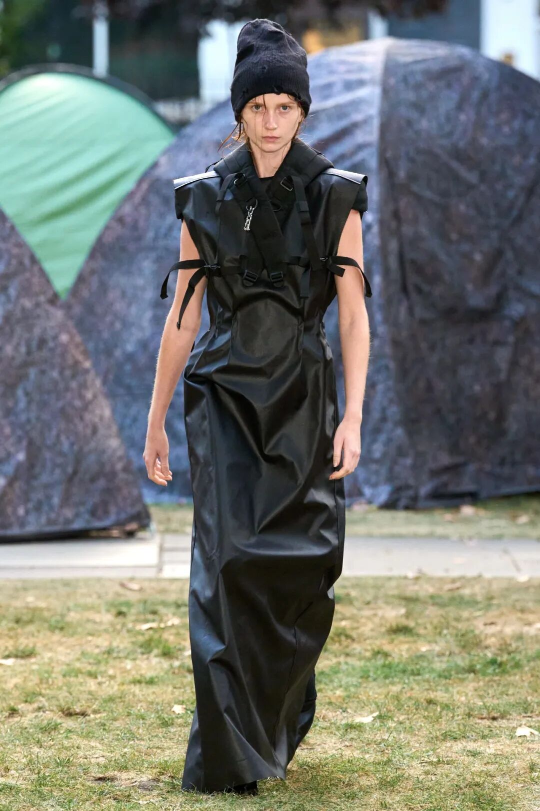 因此在该系列中,设计师不再只强调服装的时尚感,而是更在意时装的实用性:高容量的口袋工装裤、超大原木形状样式的袋子、降落伞似的超大裙摆。户外运动者所在意的防水性,被着重描绘进了戏剧性比例的多口袋皮靴和细高跟等皮革制品,也正是这些细节,让它们从户外服装领域脱颖而出。