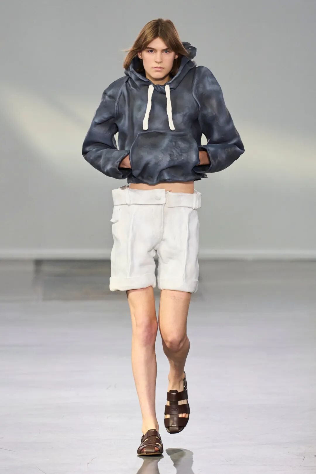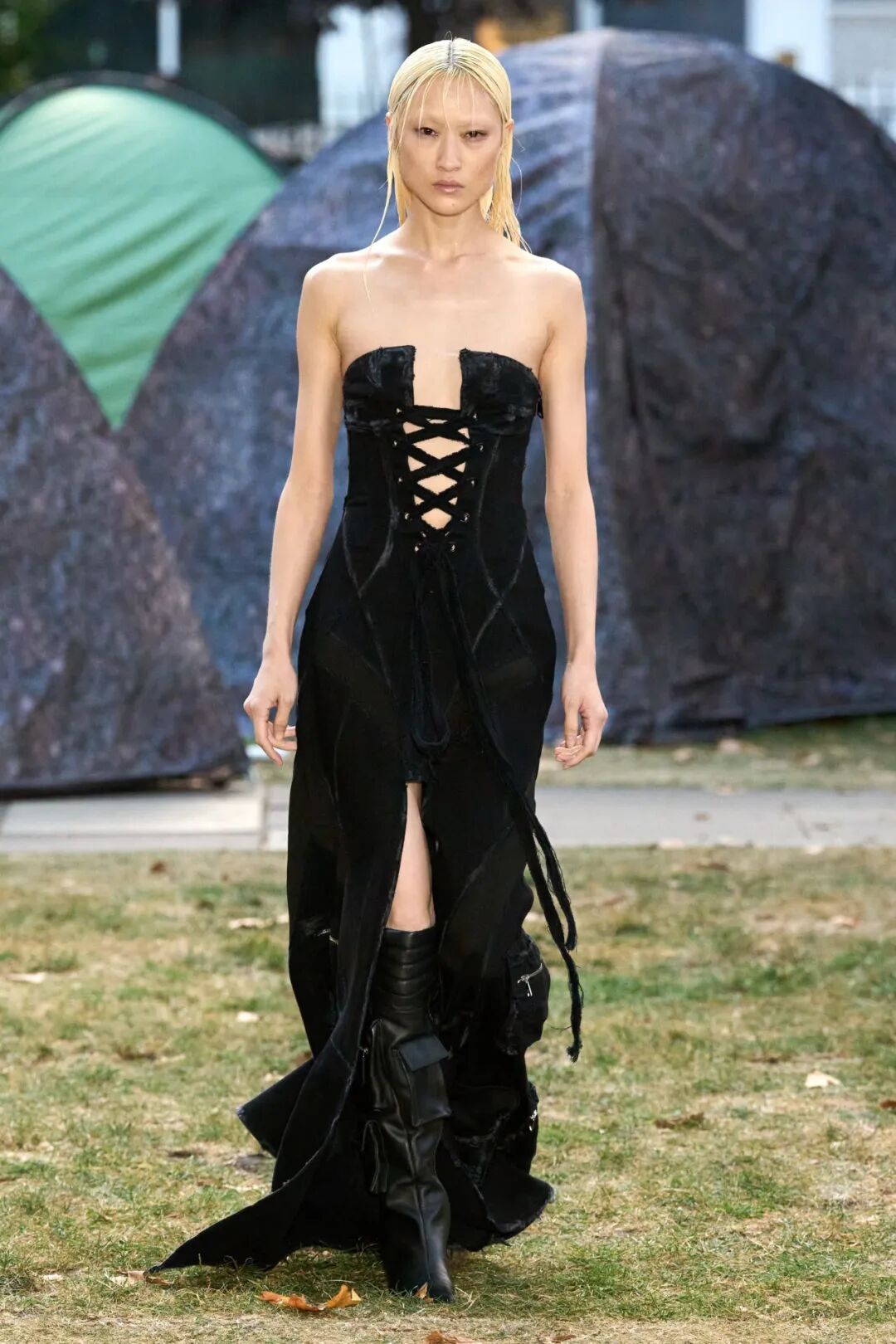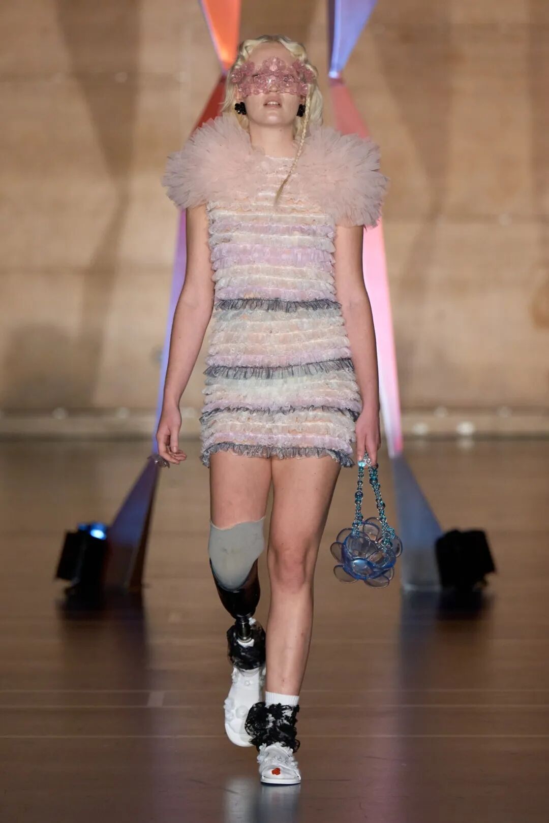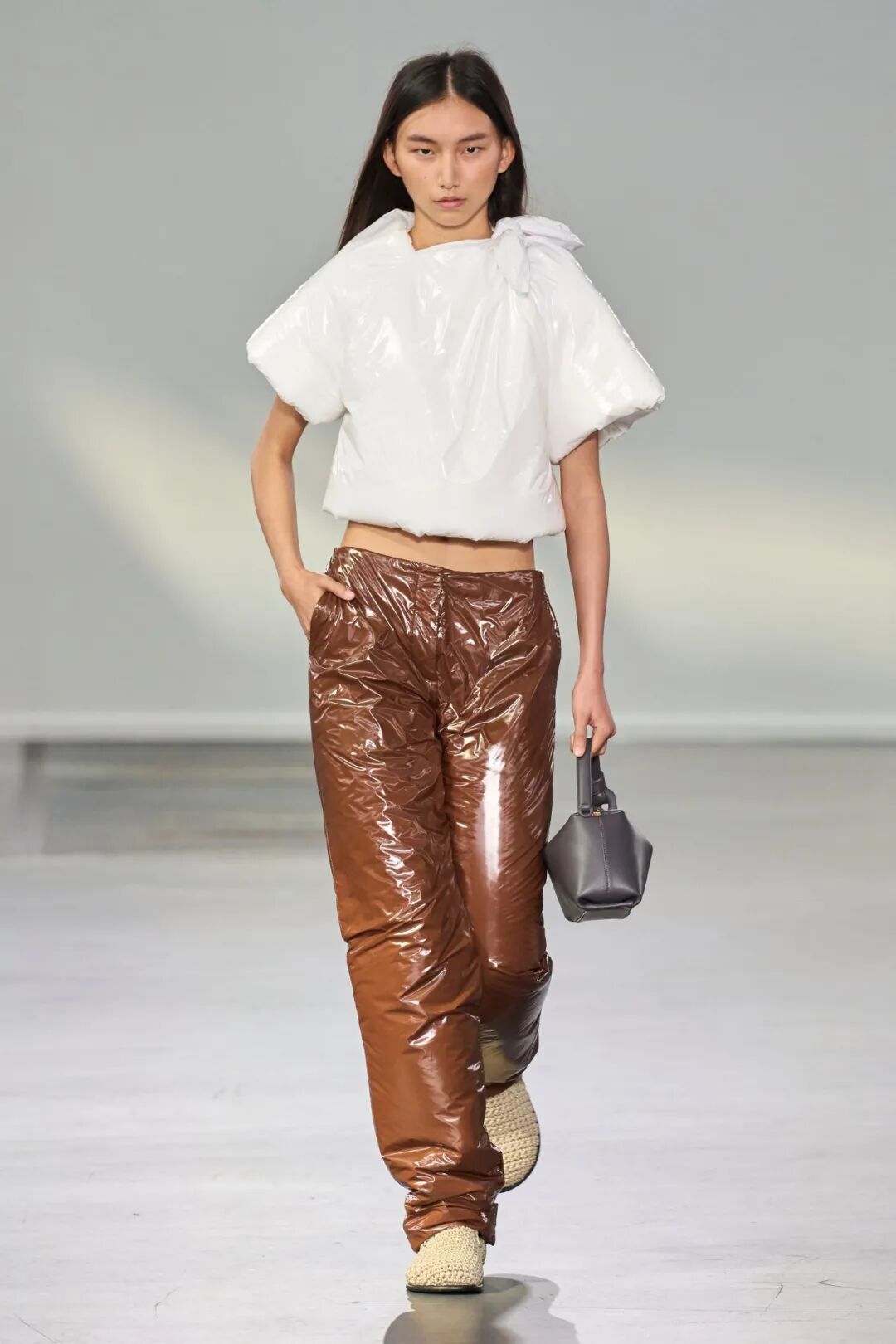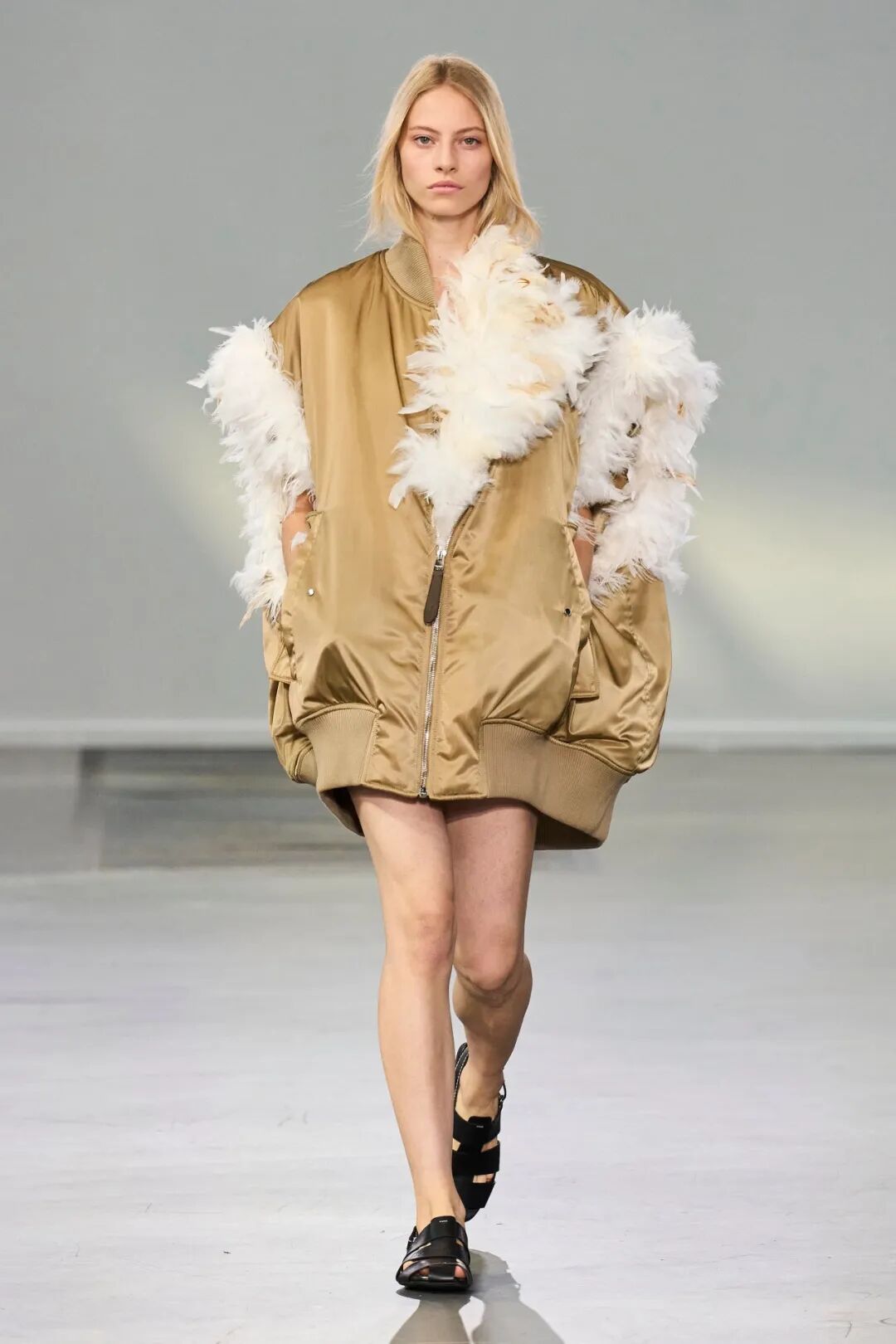 在如今着重研究多面料材质运用的设计环境下,Anderson 出乎意料地使用类似于粘土的材质,捏出来服装,如同橡皮泥般质感的开场造型,并让模特上身演绎。无袖飞行夹克碰上袖间一簇簇“爆”出来的羽毛,增添了梦幻感。这位富有独创性的设计师的巧思之下,怪诞童趣风得以被完美诠释。