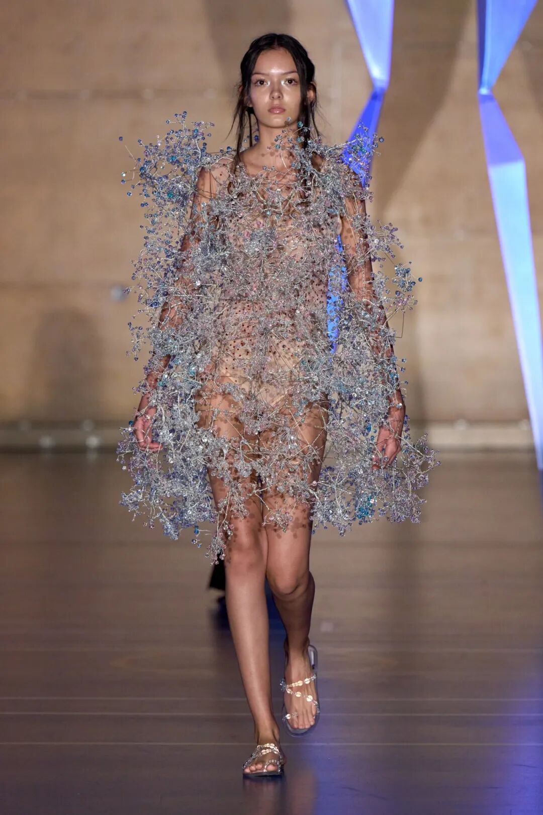 设计师将荷叶边、薄纱、串珠和空气编织运用在秀品上,打造出了属于 Susan Fang 的品牌浪漫。在秀场上最为重工的是一件手工裙装,它由 600 棵手工珠小树组成,与中国少数民族合作,打造出象征着人类生命纯净能量的 DNA 之树造型。