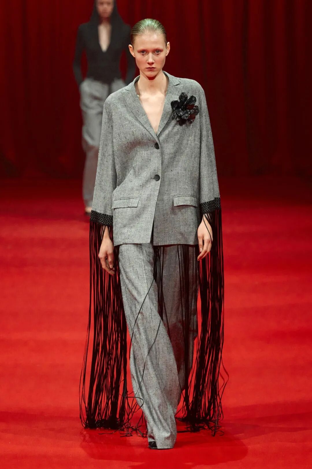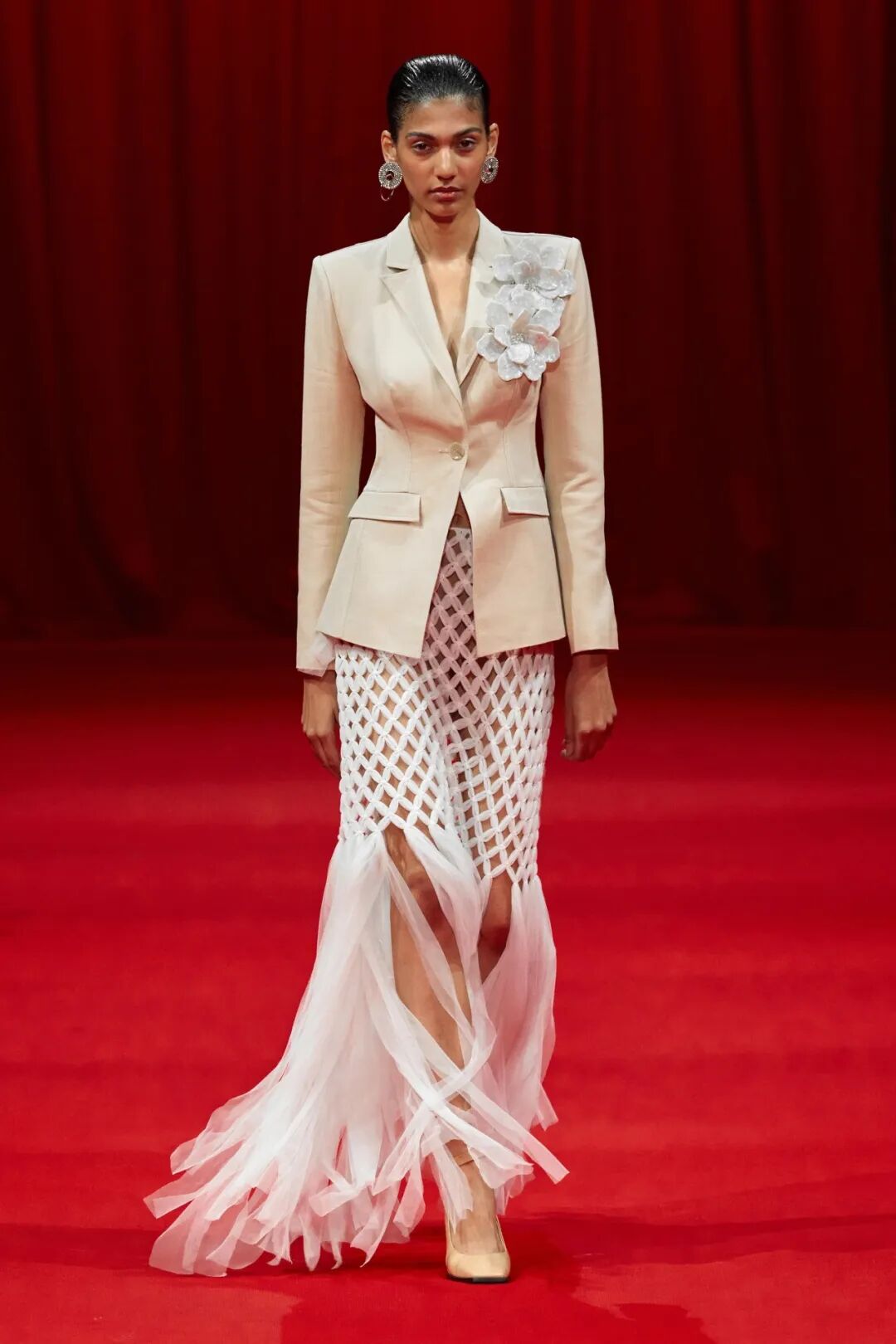 无论是旗袍系列还是抛光玉石纽扣,品牌一直不间断地将中国制造的故事娓娓道来。本季成衣让传统与时尚碰撞出不一样的火花:端庄的西装外套袖口上的优雅流苏元素;较为厚重的西装外套与飘纱的白色网裙搭配......材质与款式的混搭与碰撞,无不展现出女性多样的美。