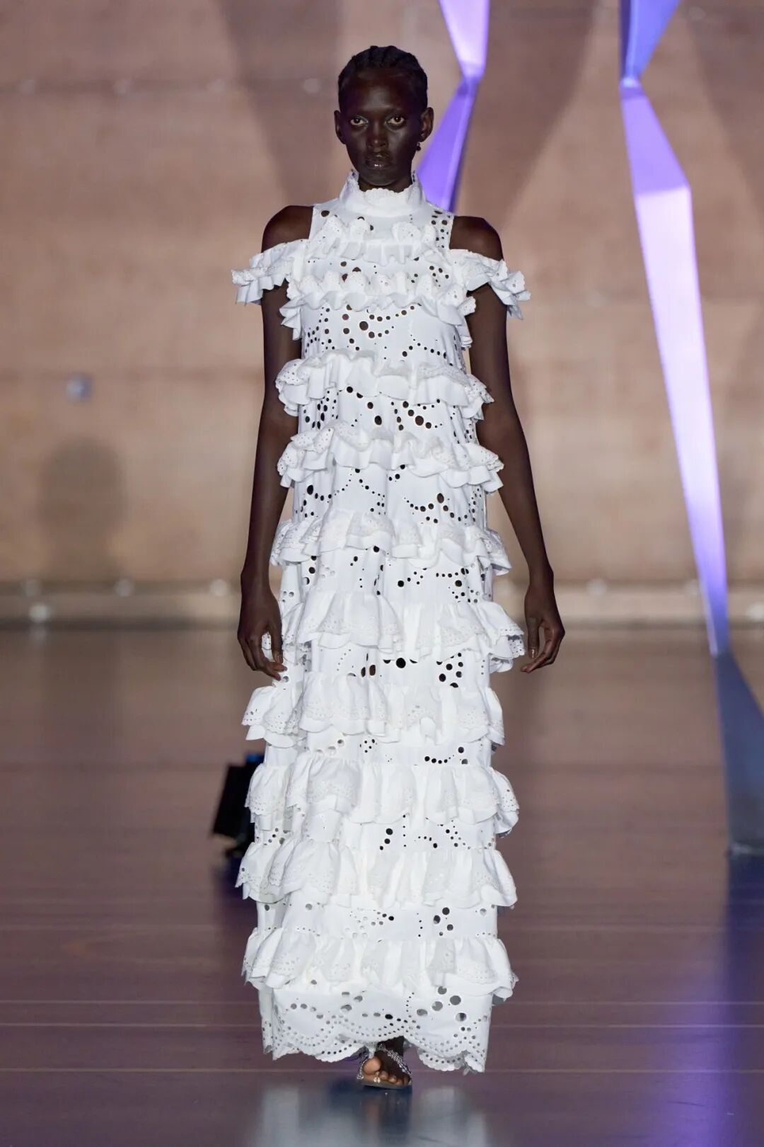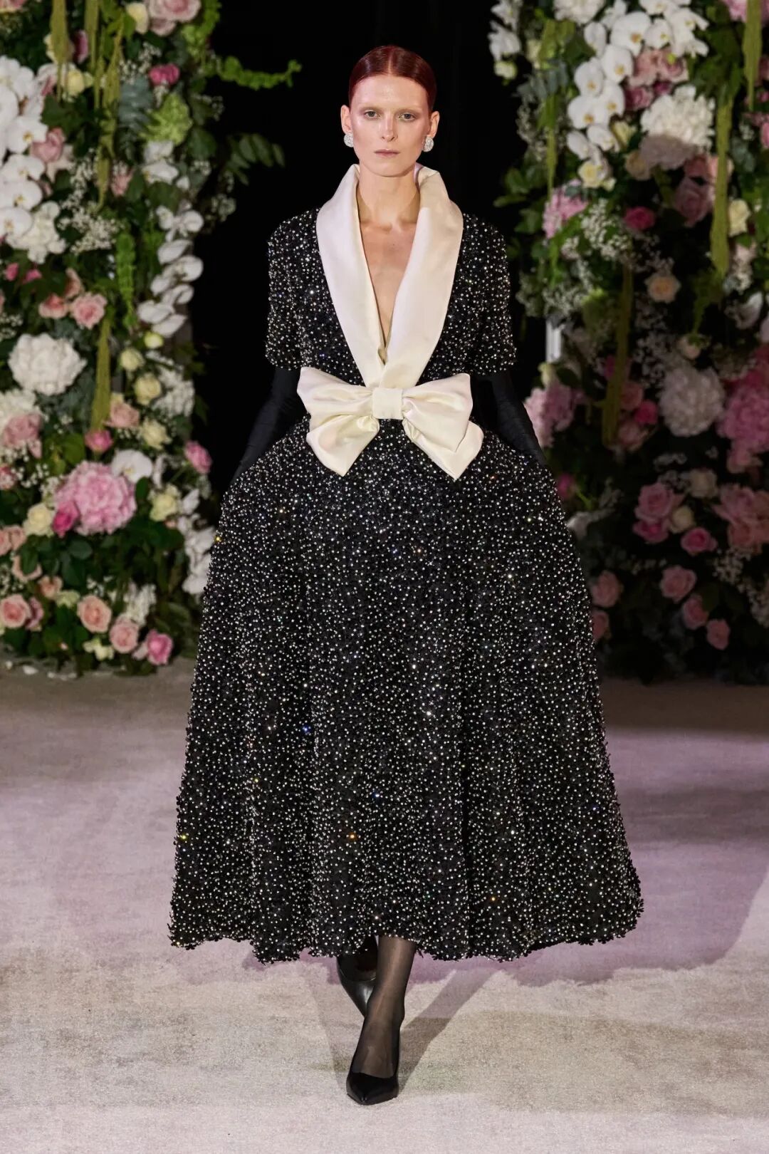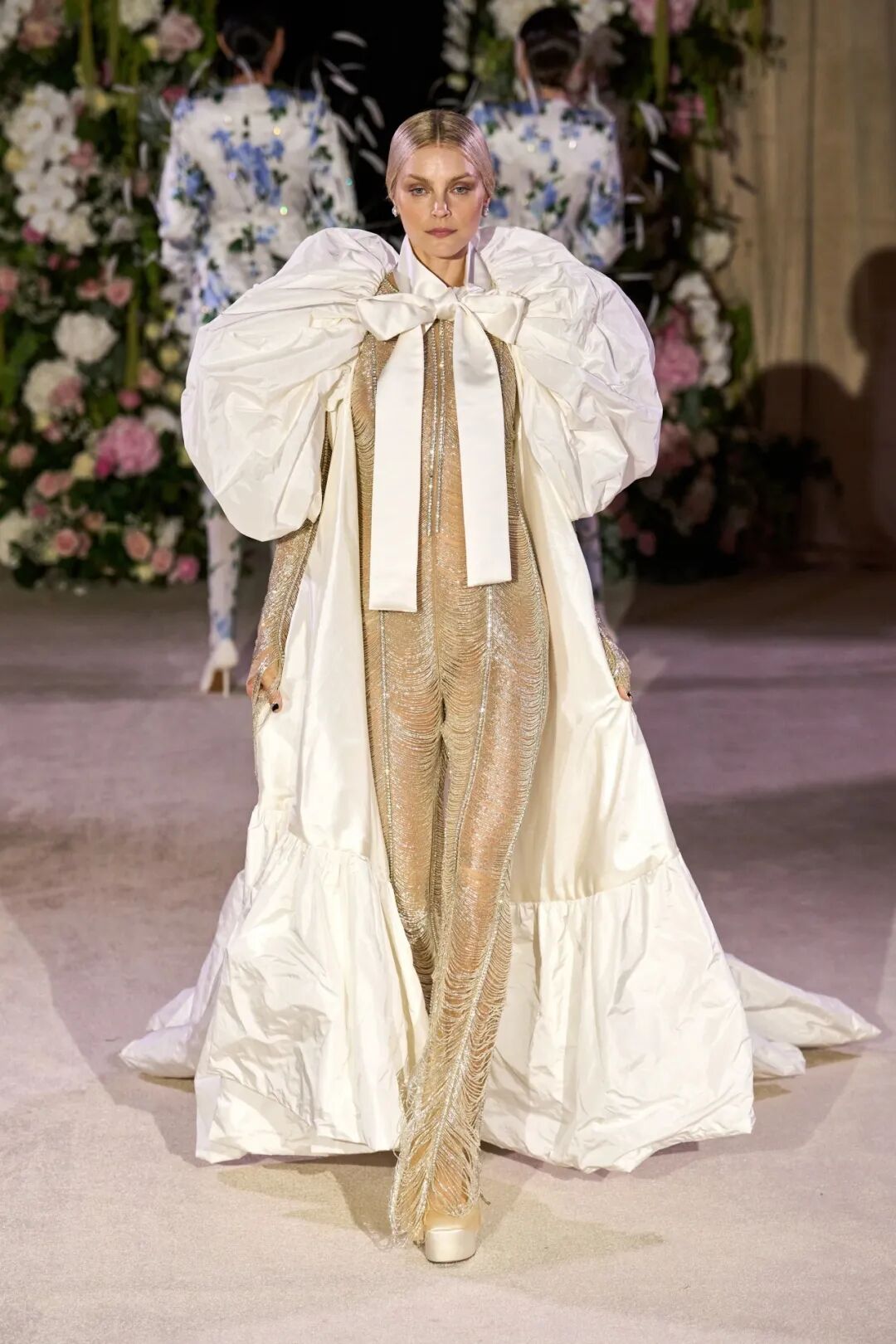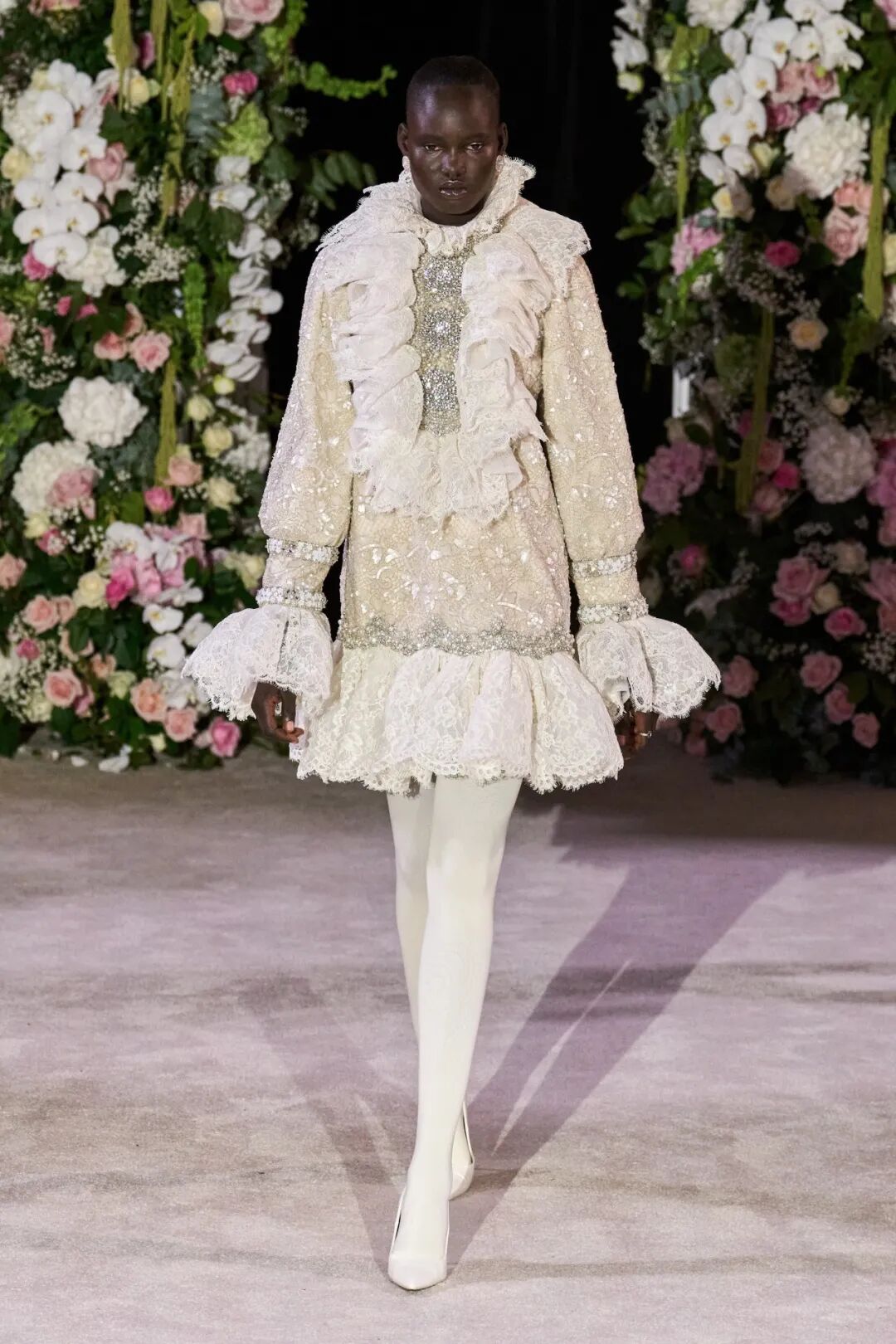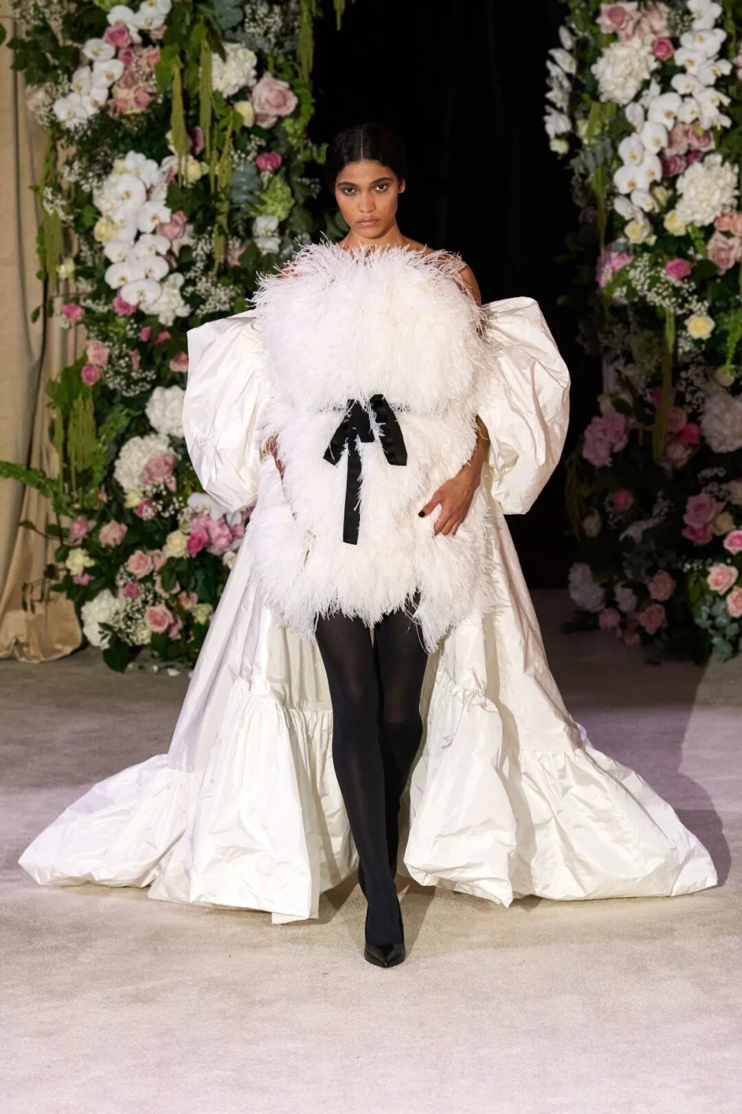 回看 Richard Quinn 过往的时装系列,无一例外都充满了大量的印花元素,本季也延续了这一传统。除了大量的印花元素,本季还以白色礼服为特色,配以钉珠水晶、金丝流苏、手工刺绣,构造出这极繁主义的“宫廷盛宴”。多见的硬挺裙撑,让模特一个个成为八音盒中翩翩起舞的芭蕾舞人偶般的梦幻。