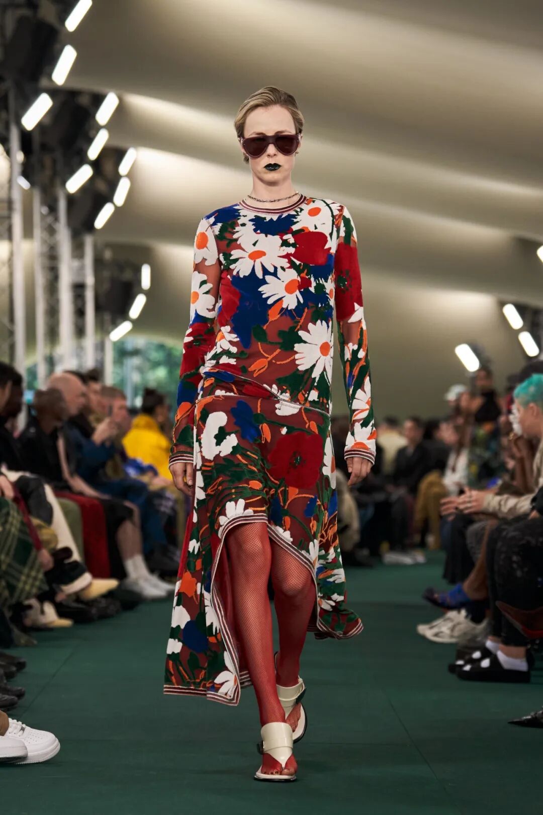品牌在本季仍延续着一贯的风衣开场的传统“节奏”。设计师对色彩的熟练运用,一系列低调色彩出现在秀场上,如军绿色、浅米色等等,唯一的高饱和颜色则是 Burberry 皇家蓝,点缀着秀场。印花元素也是本季设计的重点,以草莓、花卉等图案作为印花,溯源英伦果语草⾹,回归经典原⽣之美。