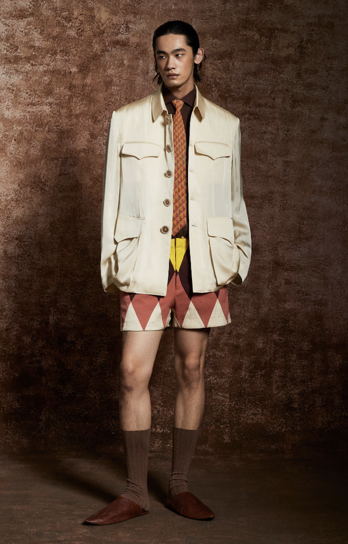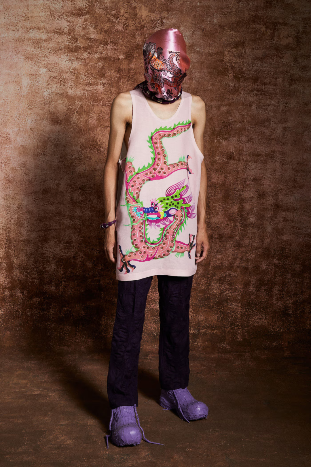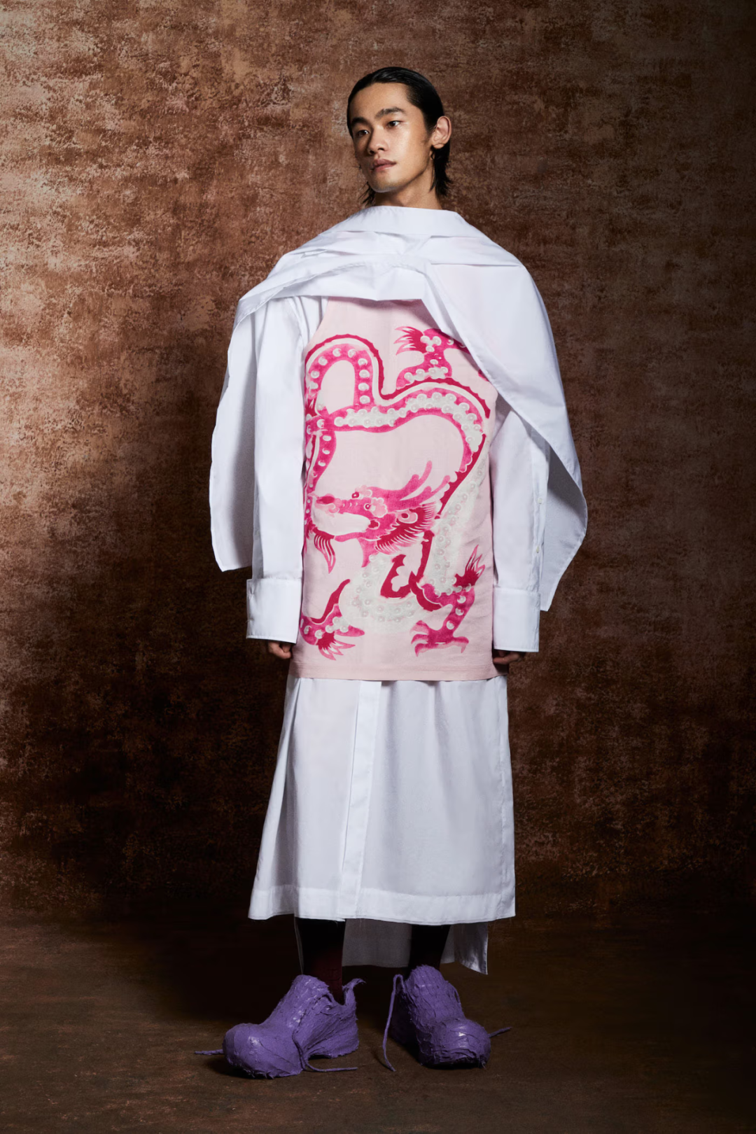 水洗牛仔,粗纹的亚麻面料等等在此系列中被呈现在大众的视野中。巨大的亚麻旅行手提包,在兼顾实用性和功能性的同时让它变得具有时尚感,在一众朴素的旅行穿搭中脱颖而出。粉红色祥龙印在服饰上,寓意着东方文化和东方隐士的神秘与不凡。