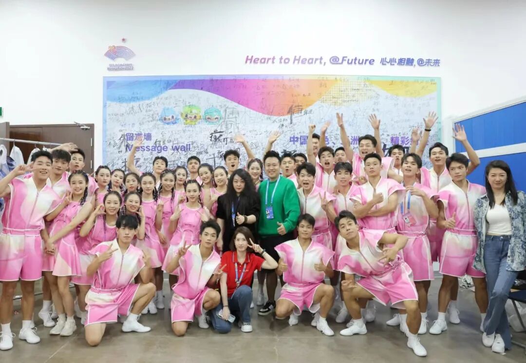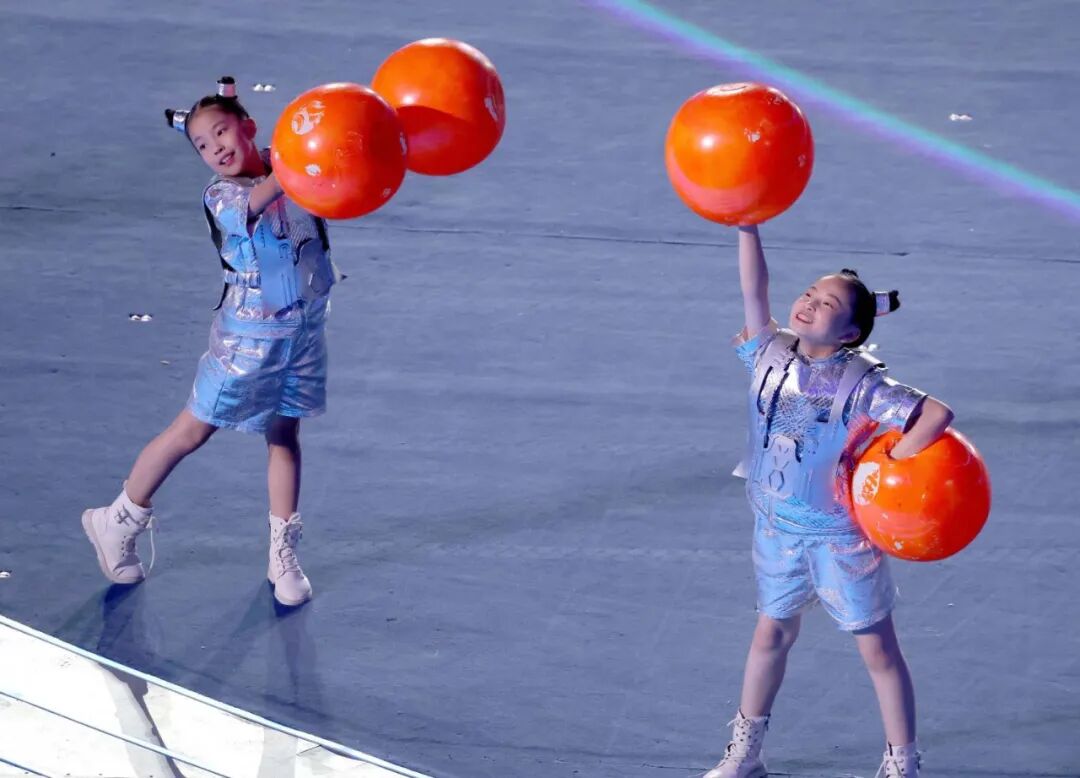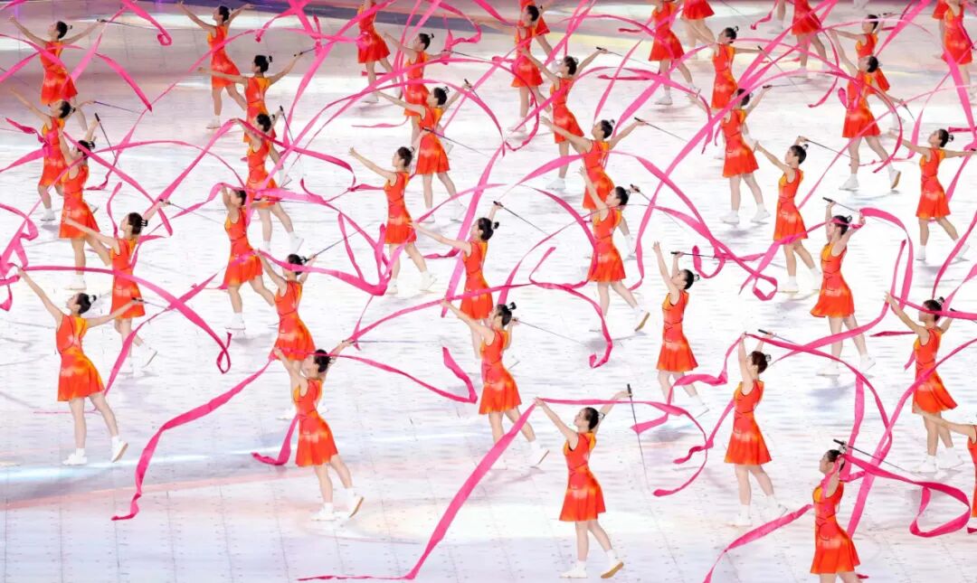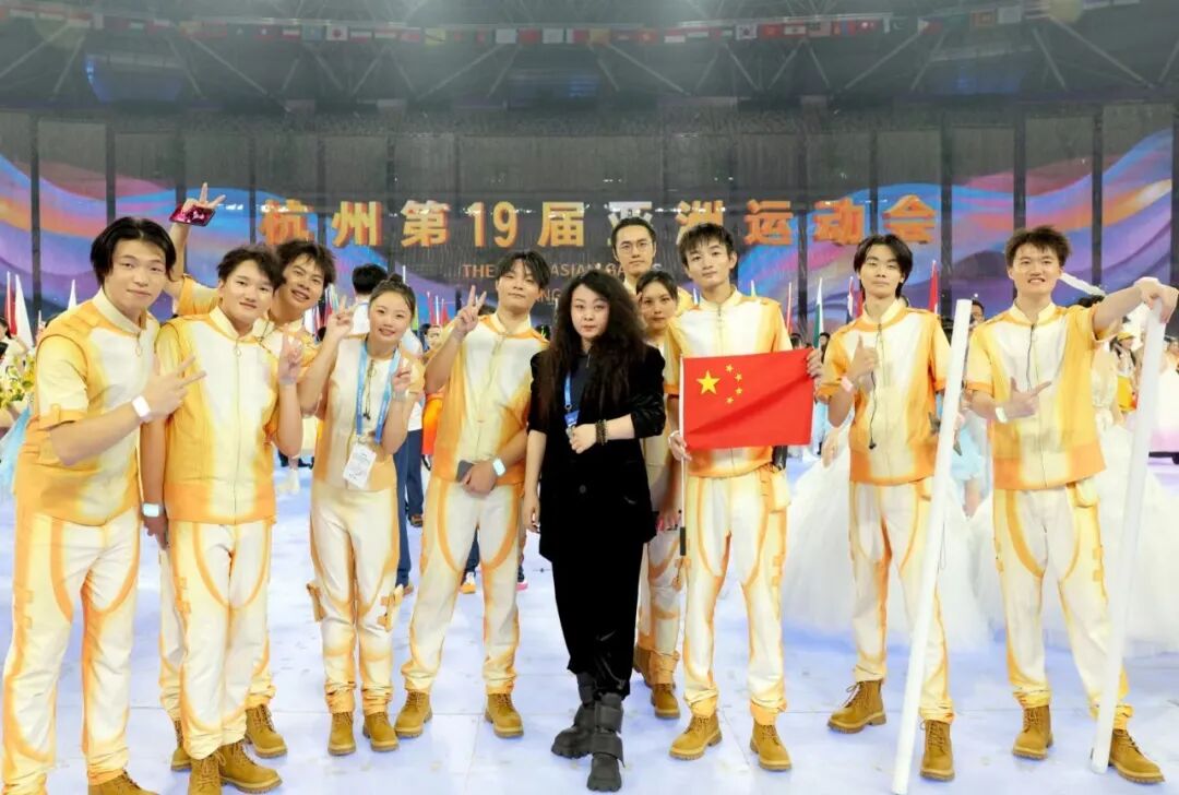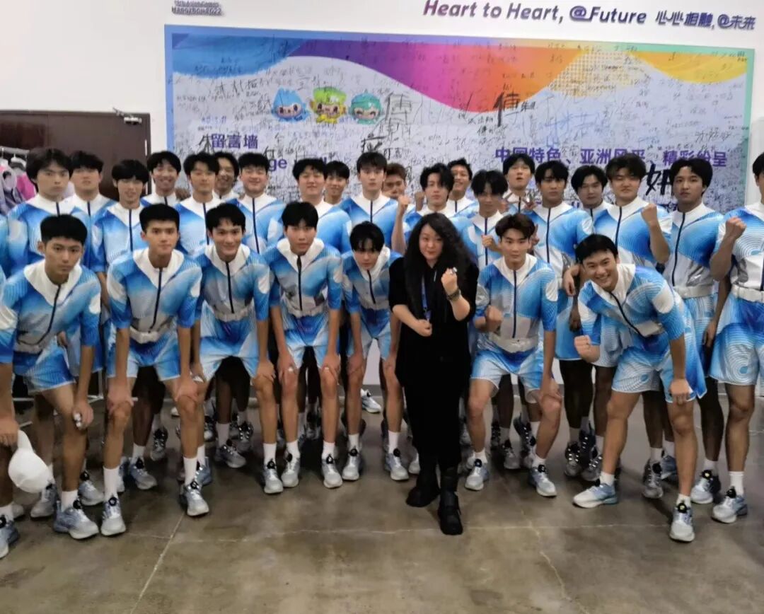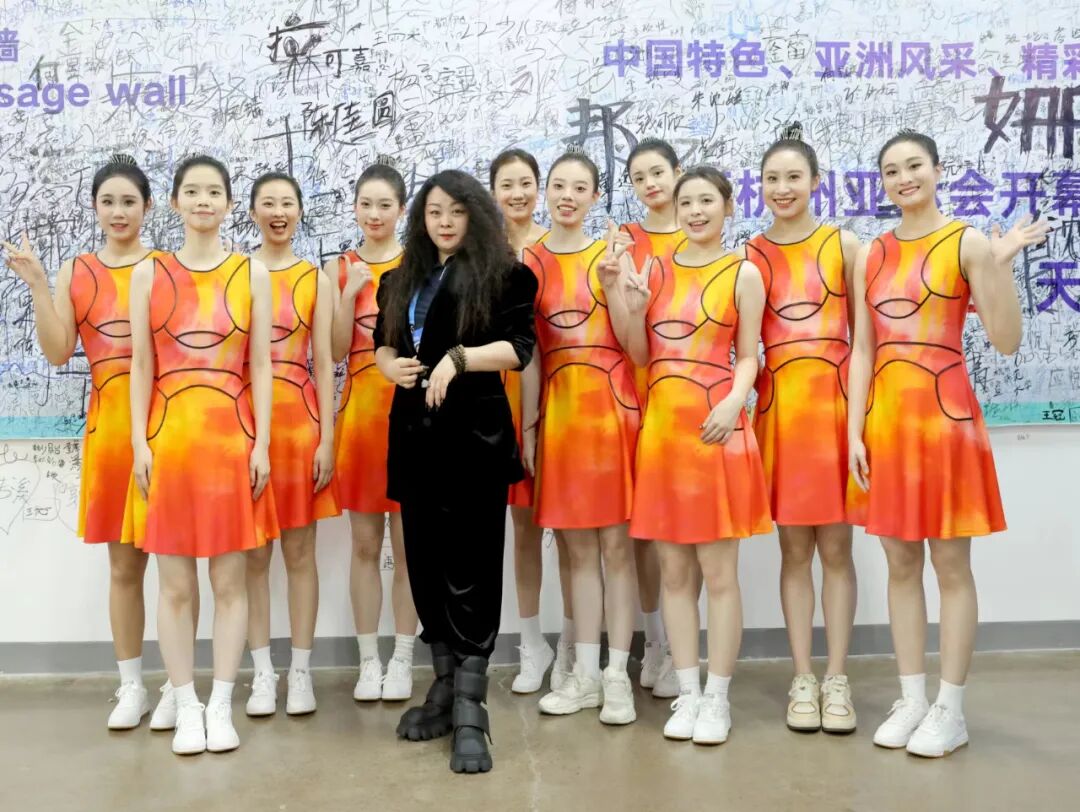“开幕仪式/会旗升旗、护旗手”服装设计则采用中山装的廓形设计,辅以简洁的细拉链,此款设计运用了白描的手法勾线体现杭州层层叠叠的山水的效果,恰是这种山水交相呼应晕染融合的美感。“开幕仪式/各代表团执旗手”的设计采用3D立体、元宇宙的平面效果西湖湖景的俯视效果环绕拥抱,开幕服装总设计丁洁将此款设计平面立体化,以此传递出赛事精神——超越共融,同时又呼应了设计趋势:智能环保的设计理念。“开幕仪式/标兵男女演员”采用简洁的搭配,男演员T恤搭配动感设计运动裤,而女演员着装设计亮点凸显:裙子图案以立体水波纹环绕,N多种水波纹的灵动令人遐想。裙廓型用立体水波纹结合定制水纹立体面料,不仅体现出面料的柔动质感,随着舞动的节奏更展现出雅韵杭州的诗情画意。负责仪式环节及中篇《钱塘潮涌》服装总设计丁洁,在“中篇 钱塘潮涌/《弄潮涛头立》/3D威亚演员(男、女装)”设计中契合本届亚运会“超越共融——年轻、运动 ”的风格定位,将中国青年的精神风貌、中国力量展现的淋漓尽致。当两位舞者伴随着变幻莫测的水韵光圈与运动跑道舞动的时候,仿佛置身在自由遨游的新境界,简洁而又动感的服装设计配合“3D双威亚技术”,现场的氛围达到高潮,让亿万观众共同体验了一把非凡的空中翱翔之境。“中篇 钱塘潮涌/《弄潮涛头立》/弄潮儿演员”反重力装置男女演员”采用水波纹立体设计,整体呈现出的放射状水波纹的图案,一是彰显了中国纺织科技在面料、后整理方面的科技含量,配合娴熟裁剪打版制作技艺,最终呈现出《弄潮涛头立》的主题表达。这也是丁洁在中篇节目中着力表达的设计理念:符合亚运“中国新时代.杭州新亚运”的定位。继北京冬奥会开闭幕童声合唱“虎头虎脑”“年年有鱼”的设计,此次“中篇 钱塘潮涌/《逐潮竞争流》机器人小朋友”服装设计,开幕服装总设计丁洁将此系列赋予了未来与希望的创意表达,展现出亚洲乃至世界儿童对于未来的畅想与希望。儿童是人类的希望与美好期许,更是创新与科技的无限力量,丁洁将绿色科技与环保理念,借助研发型面料将此组“机器人小朋友”的服装灵动性与裁剪巧妙构思,展现了孩子们感受梦想,同爱同在同分享。“中篇 钱塘潮涌/《新潮向未来》体育舞蹈”以及“中篇 钱塘潮涌/《新潮向未来》氛围演员”的服装设计,将青春、奔放的主题融合水墨画晕染、水韵江南的元素,尤其是在女演员粉红服装设计中,流线型的水元素&运动的立体风格演绎,以层层叠叠的面料解构组合,将本届亚运“超越共融”服装风格定位精准体现。丁洁还介绍说:“《新潮向未来》氛围演员服装运用了少许紧身的廓形设计,体现年轻积极向上的勃勃生机。水墨晕染之下,金灿灿的整体色彩凸显金秋丰收的盛况,也是籍由设计的力量,展现当下的中国倡导绿色低碳,高质量发展的新成效。”中国第三次以亚运会为名,搭建起亚洲各国和平与友谊的桥梁。在“中篇 钱塘潮涌/《新潮向未来》亚洲一家亲”服装设计环节,开幕服装总设计丁洁再次展现她对水韵之情融进相聚相知、增进友谊的大舞台,在增进了解、收获友谊的同时,向全世界传递出一起畅想未来的“亚洲一家亲”信号。