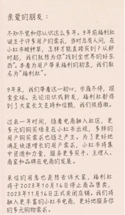 点击蓝字关注我们近日,小红书“福利社”发布致用户的一封信《是告别,更是开始》,宣...