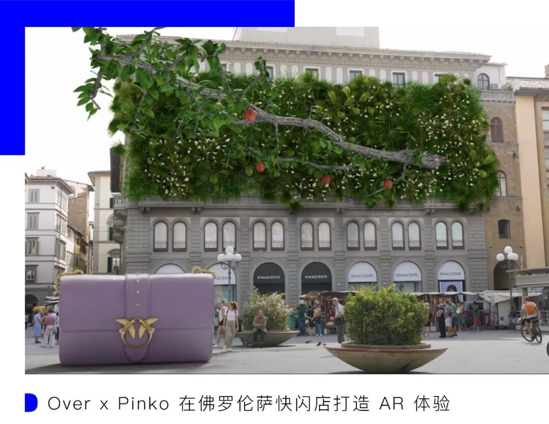 9 月,Over 平台将与 Pinko 展开合作,在佛罗伦萨 Rinascente 大楼的一家快闪店进行 AR 活动。这家意大利时尚公司告诉 WWD,Pinko 将在商店内外部都应用到 AR 技术,包括交互式数字产品等,以此来提高人们对该品牌可持续产品线的认知。