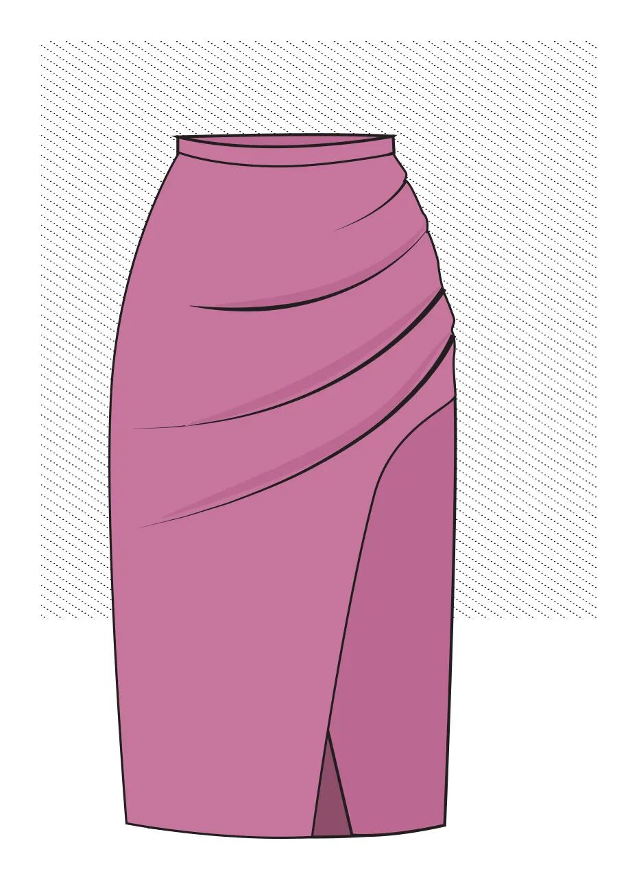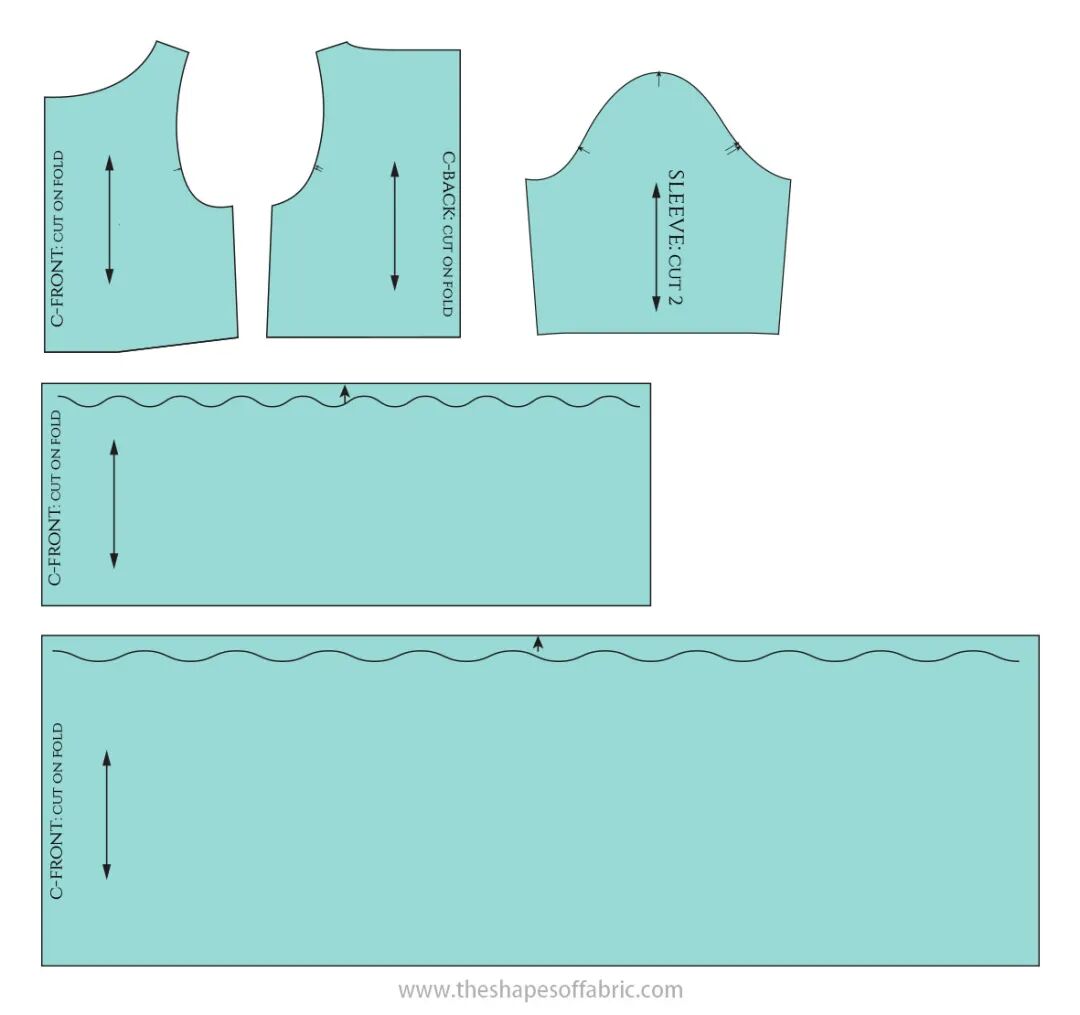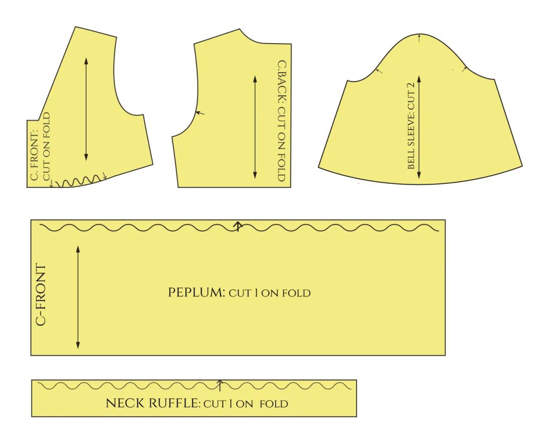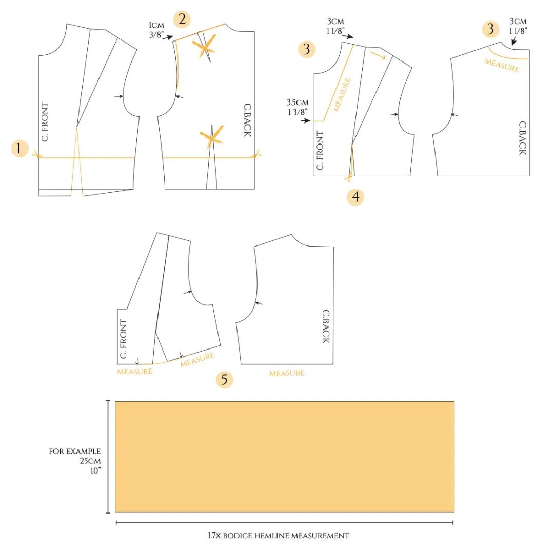 这是一个较复杂的款式。裙子的前片是重叠的,顶层有褶皱,这将需要一个额外的层来用微小的手工缝线将褶皱固定到位。