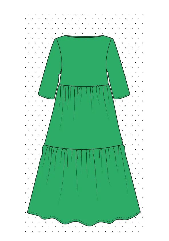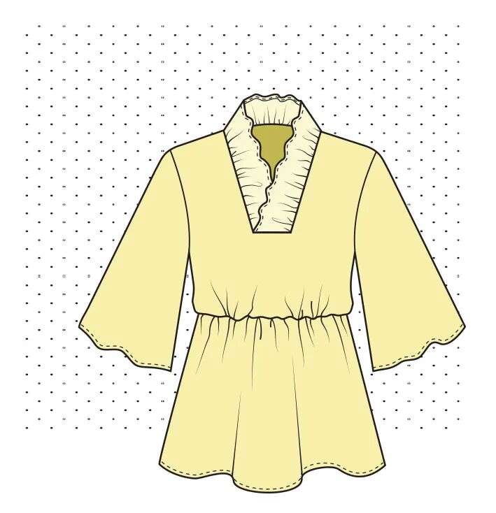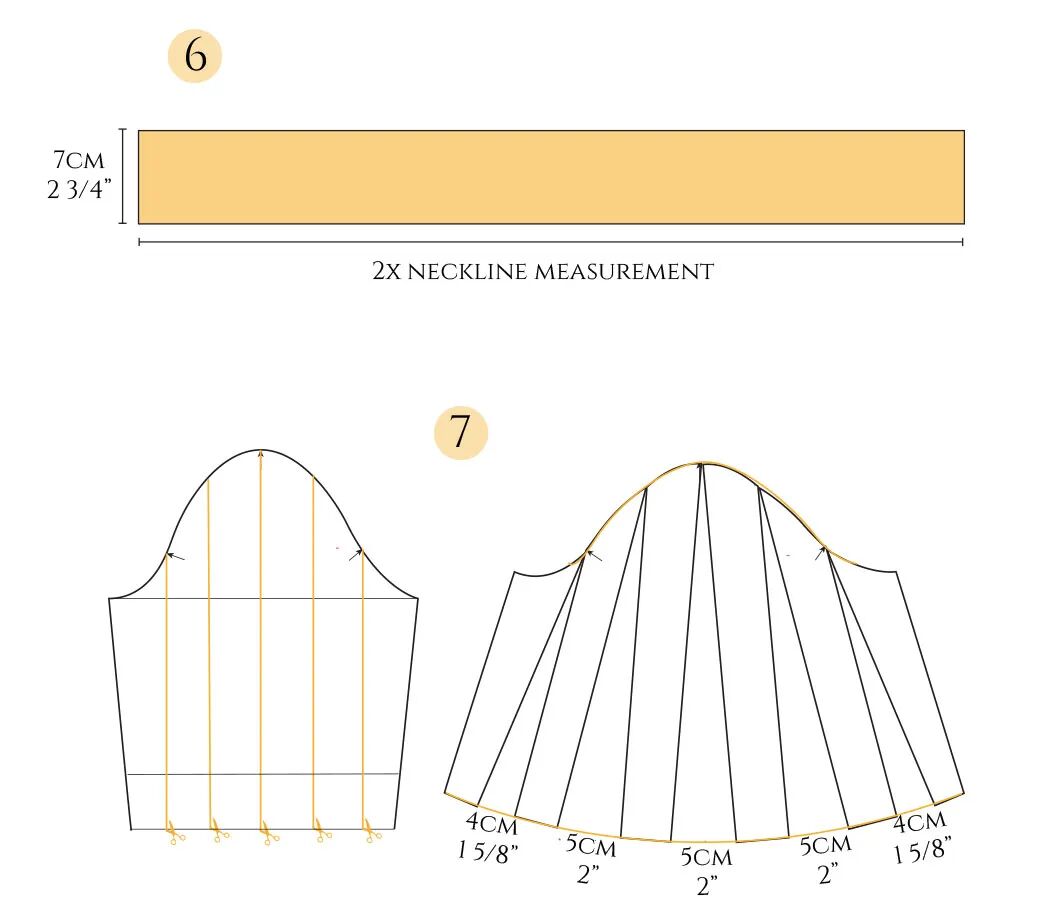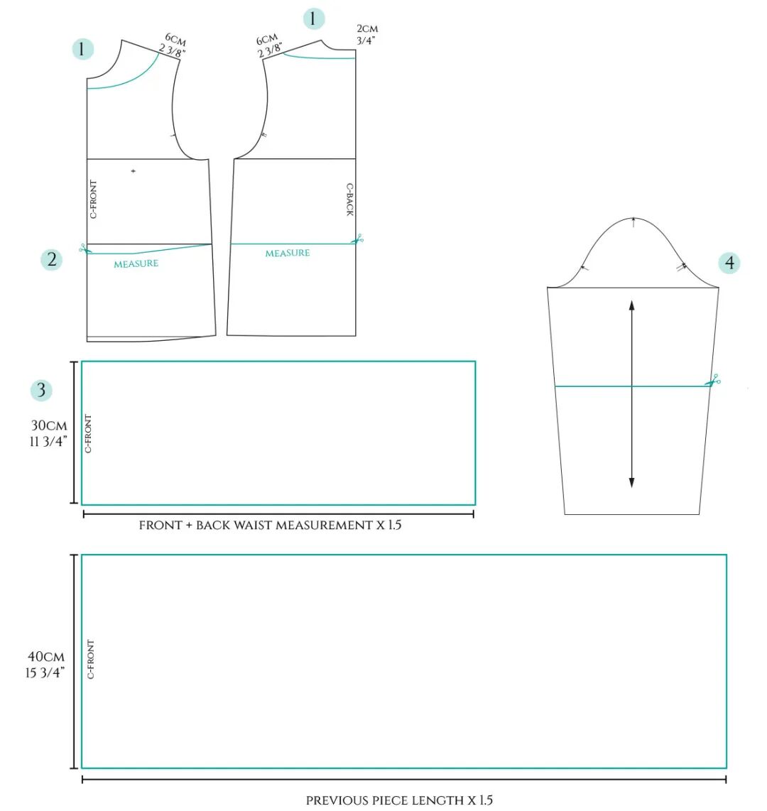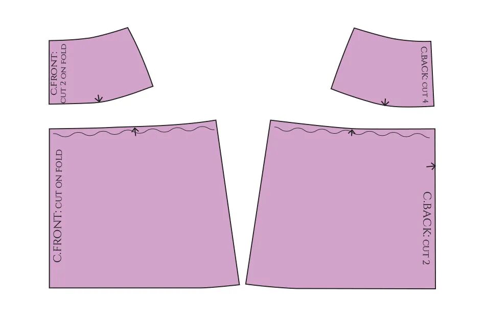 这是一个较复杂的款式。裙子的前片是重叠的,顶层有褶皱,这将需要一个额外的层来用微小的手工缝线将褶皱固定到位。