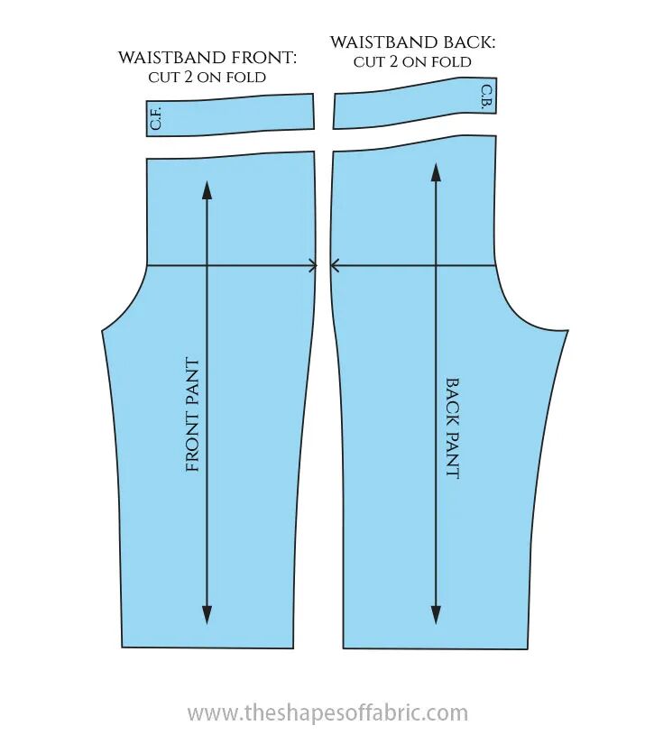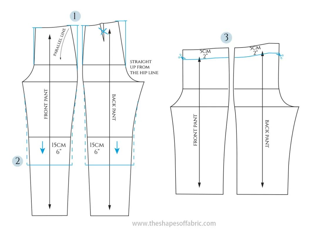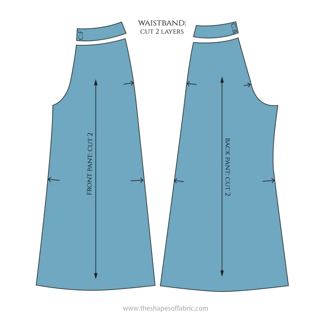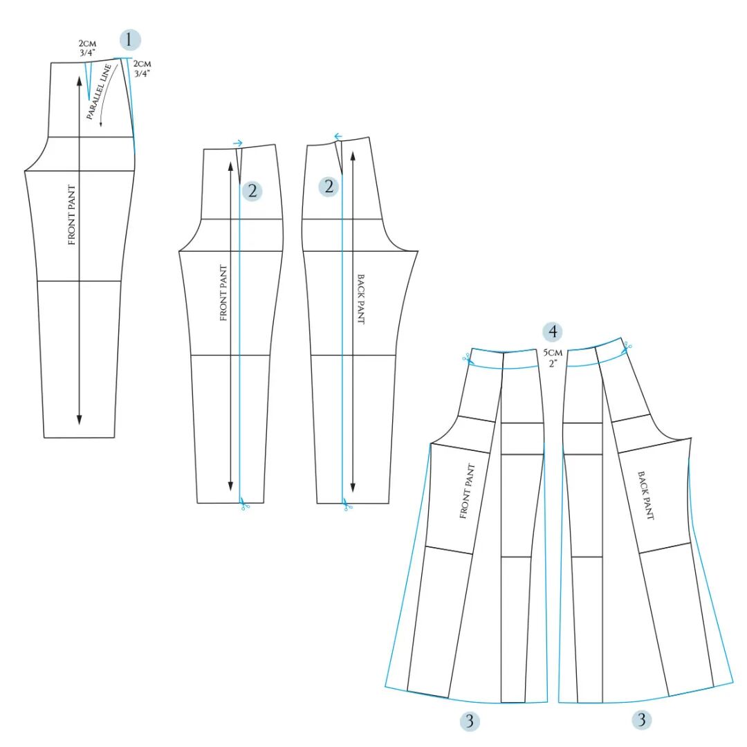 为了适合这些没有拉链的裤子,腰部必须至少与臀围一样宽。如果你喜欢更舒适的合身,你可以在开始之前给裤子的图案增加一些宽松量:降低胯线并在两侧增加一点宽度。