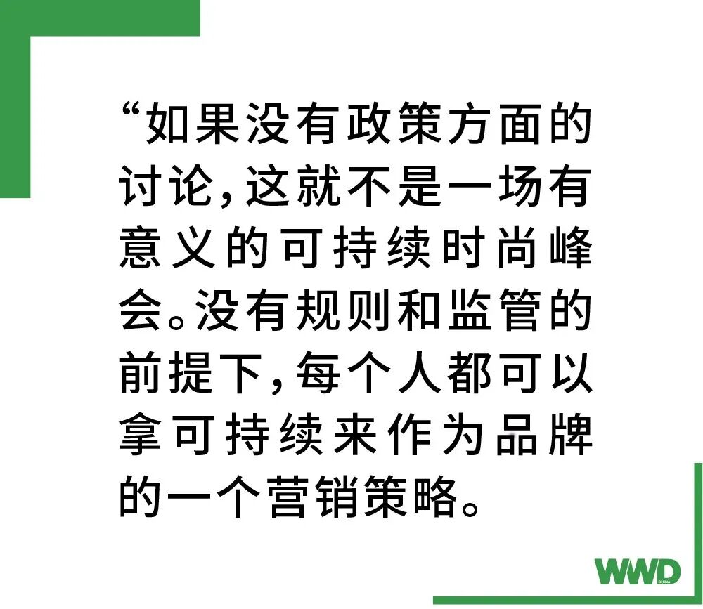但这场合作展览也引发了业界的诸多争议。总部位于丹麦的品牌 Summery Kim Vedel Hansen 的首席运营官表示:“如果没有政策方面的讨论,这就不是一场有意义的可持续时尚峰会。没有规则和监管的前提下,每个人都可以拿可持续来作为品牌的一个营销策略,我可以用面料做很多事情,并且在服装制作的流程中遵循环保意识,但这不会带来实质上的改变。变革必须来自于上层政治策略。”
