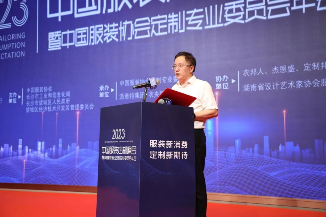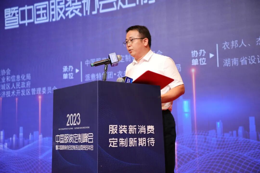 长沙市望城区人民政府党组成员、副区长黄雪峰在致辞中表示:“服装业是基础性消费品产业、民生产业,也是集中体现文化创意、技术进步和时代变迁的创新性产业。本次峰会在望城举办,充分体现了中国服装协会对望城工作的关心和支持,也必将推动望城乃至长沙及湖南省服装产业的高质量发展。”望城是长沙最年轻、面积最大、唯一横跨湘江两岸的城区,近年来,望城区坚定推进“一二三六”发展思路,全力推进现代产业融合发展,涌现了以派意特为代表的服装定制头部企业。希望以本次峰会为纽带,不断聚集服装产业发展的蓬勃动力,共同推动望城服装定制产业的创新发展。